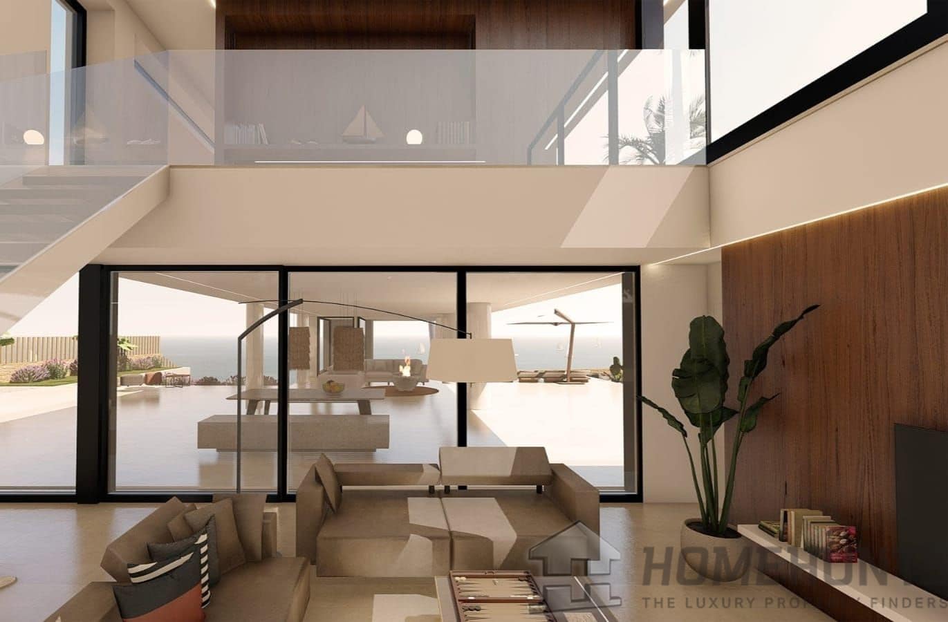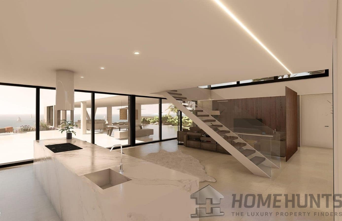 The interior of the villa impresses with its spacious main living room, where large panoramic windows frame the breathtaking sea views, flooding the space with natural light and creating a warm and welcoming atmosphere. The designer kitchen is a dream for any gourmet, equipped with state-of-the-art appliances and high quality finishes, including a central island that becomes the heart of the house for entertaining and family gathering.