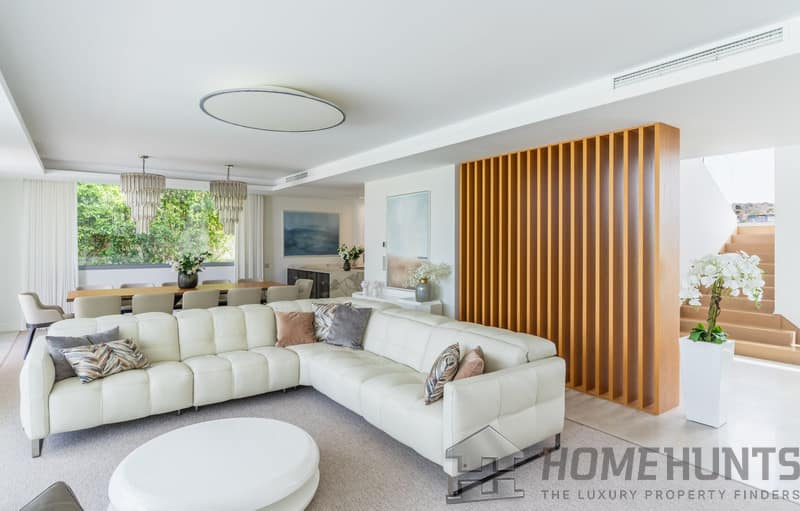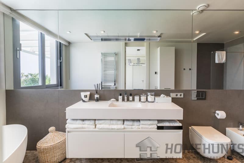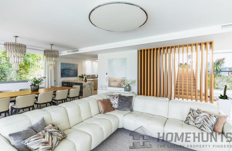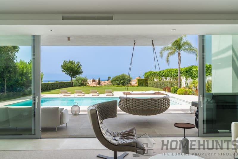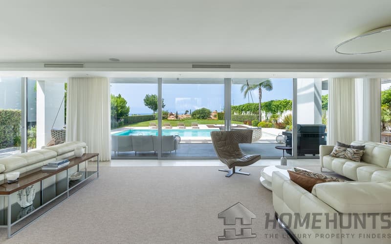 Entering through the impressive entrance hall, you are immediately greeted by views of the private pool, the well-kept garden and the sparkling Mediterranean Sea in the distance. Spacious floor-to-ceiling windows fill the house with abundant natural light, creating an atmosphere of space, luxury and harmony with the surroundings.