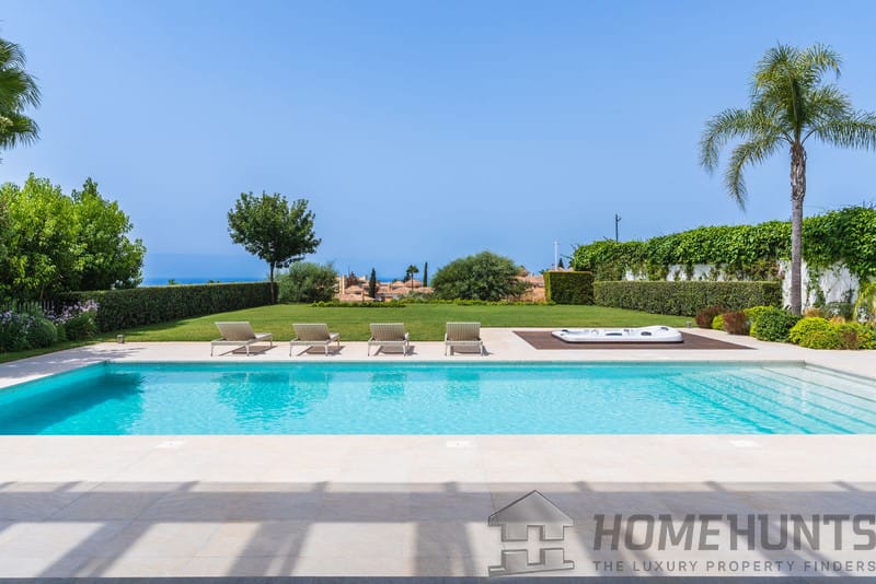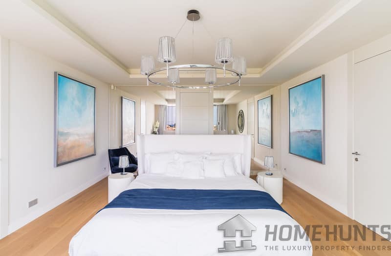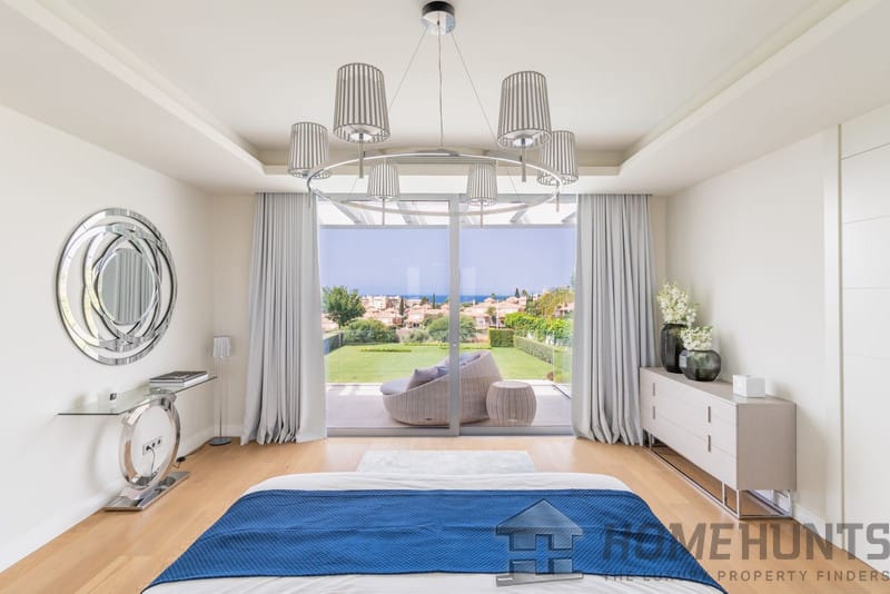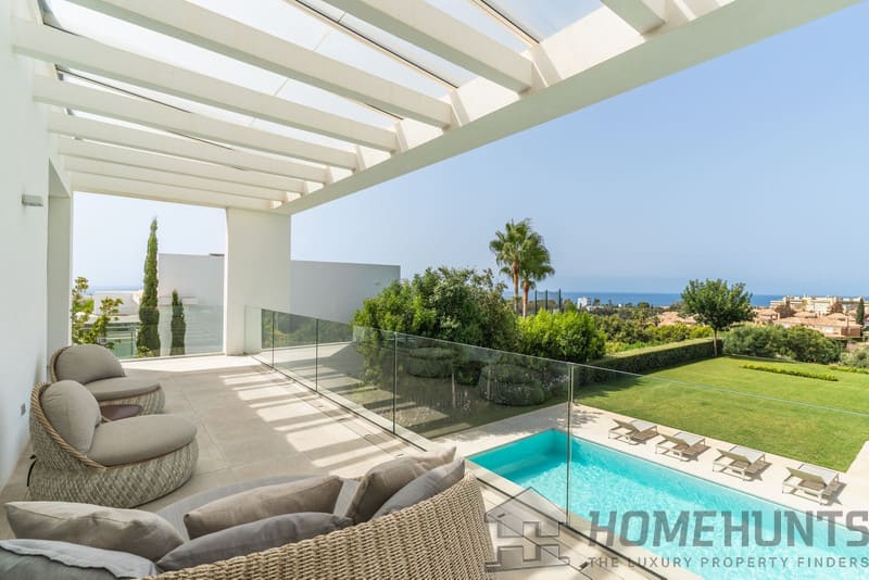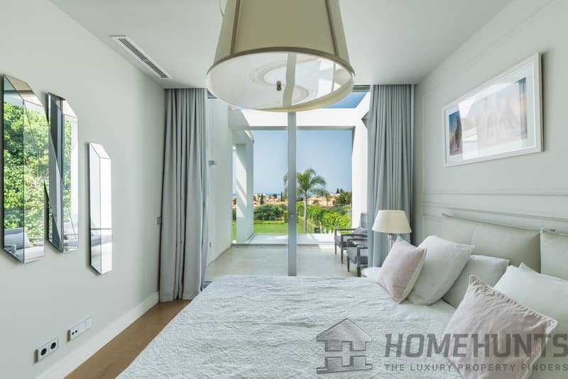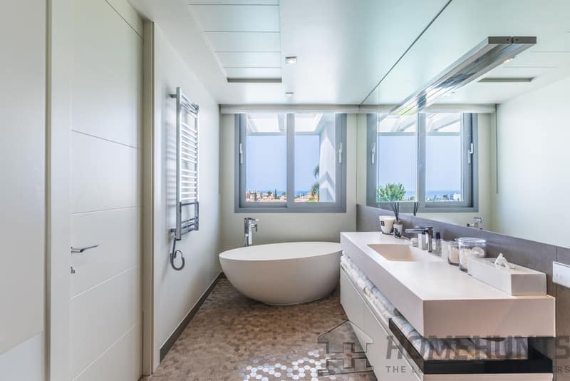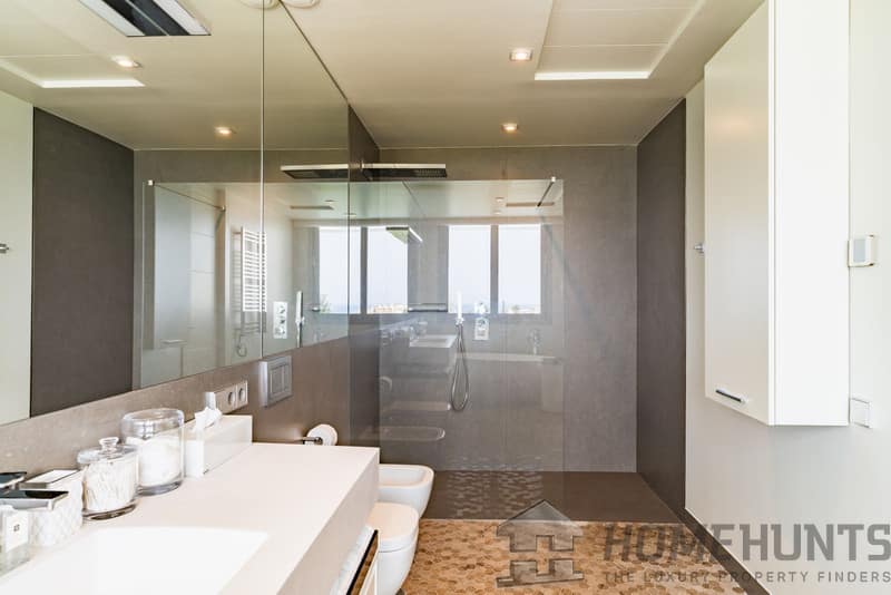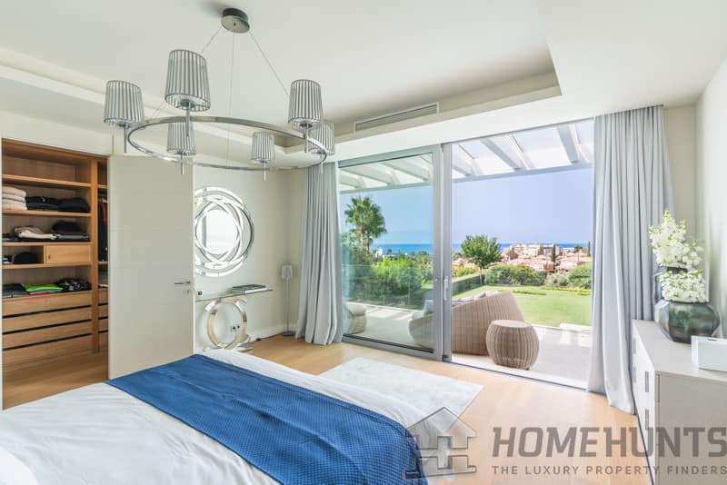 The first floor comprises the master bedroom with a spacious walk-in wardrobe and bathroom. There are also three additional bedrooms, two of which have private terraces with sea views.