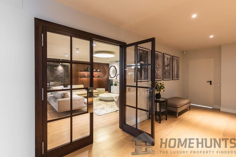 On the ground floor, there is a spacious, bright living room which connects to the dining room and a modern open kitchen, fully equipped with top-of-the-range appliances. Next to the entrance, there is a study, a walk-in wardrobe and a guest toilet.