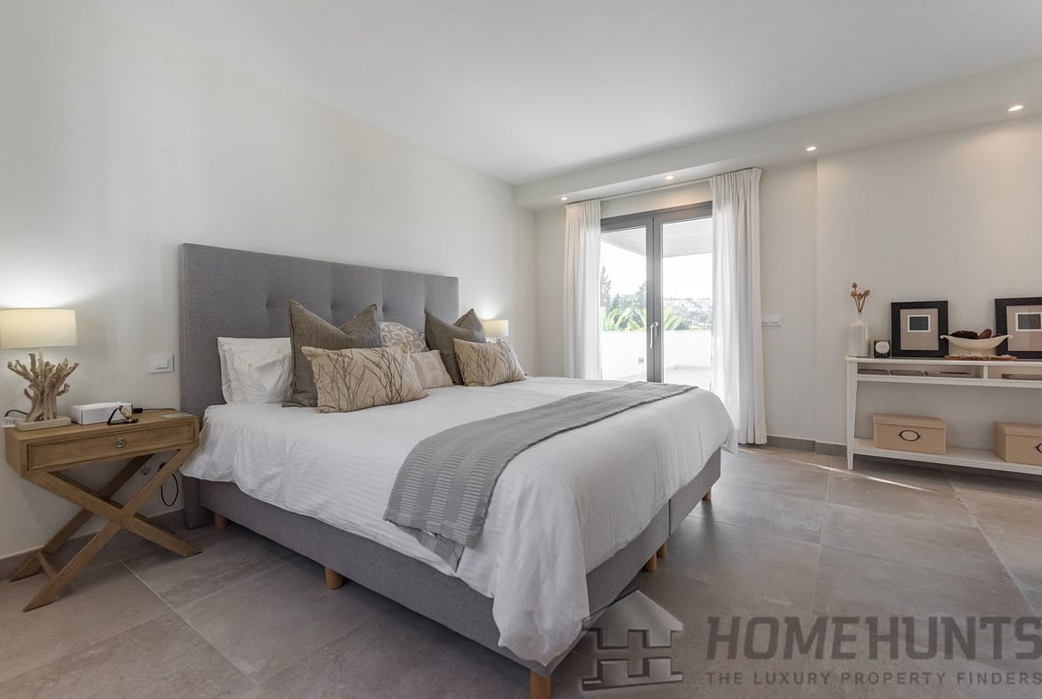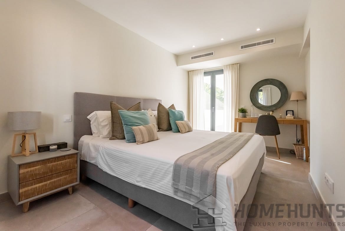 On the ground floor the large living room with fireplace and the open kitchen with island connect to the porch. There are also 2 bedrooms with bathrooms en suite, an office area, a guest toilet, the laundry room and a garage.