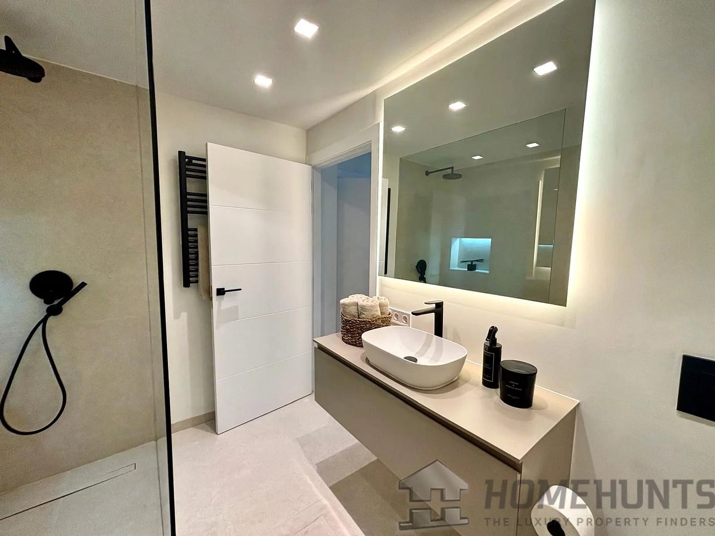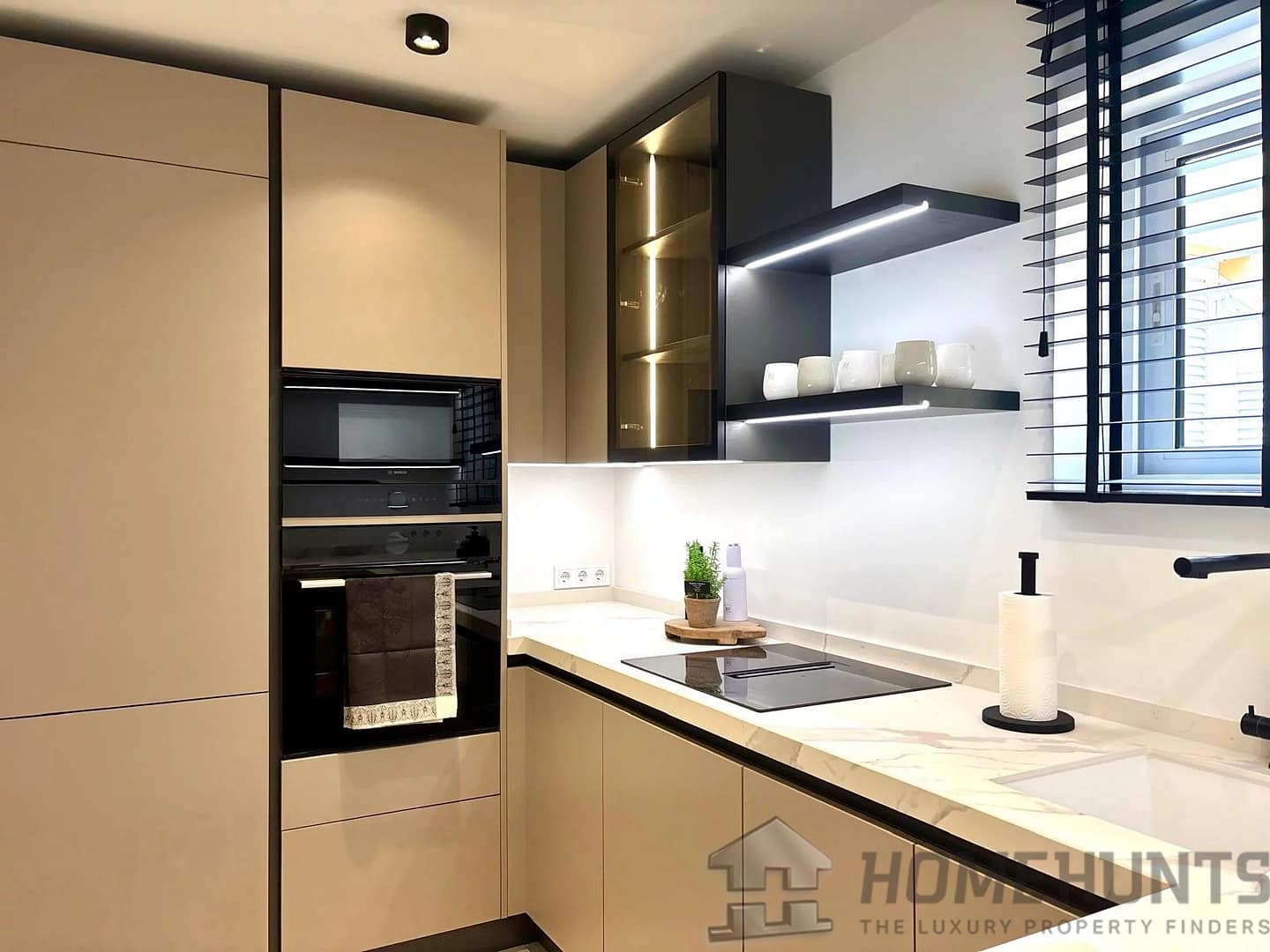 With 130 m2 intelligently distributed, two bedrooms and two modern bathrooms, four spacious terraces with sun and sea at any time of the day, a new Italian kitchen equipped with high-end appliances, underfloor heating and state-of-the-art air conditioning, designer lamps signed by Occhio and other exclusive brands, an own garage and a completely renovated and stylishly furnished interior, this house is ready to move in and enjoy from the first moment. The open living and dining spaces with panoramic windows blend with the bright blue of the Mediterranean and convey a unique feeling of spaciousness and sophistication. Noble materials, a carefully designed lighting concept and elegant furnishings create an atmosphere of luxury and comfort, while hours of sunshine, unforgettable sunsets and incomparable views over the coastline await you on the four private terraces.