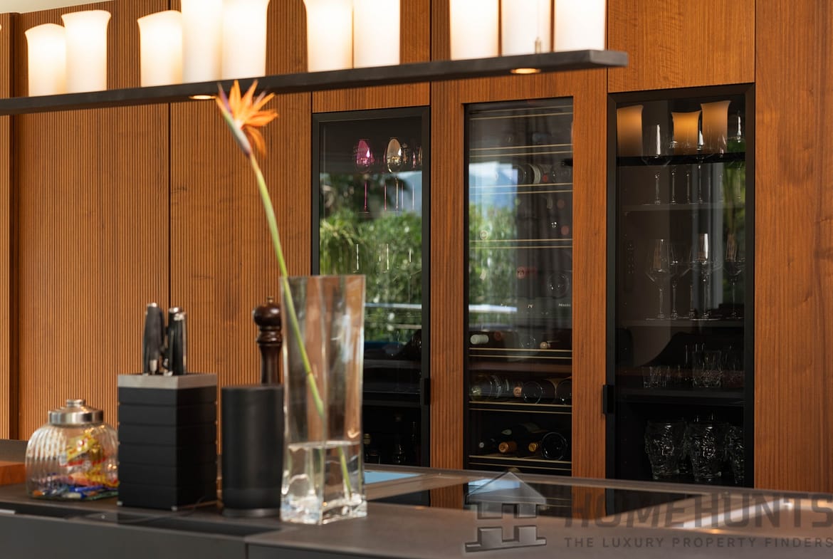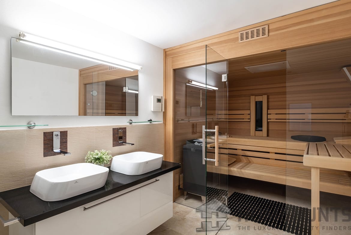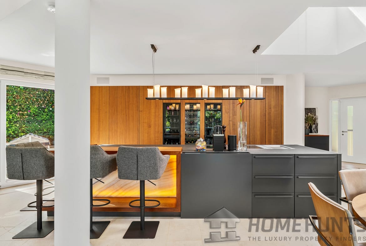 In the basement, you will find further bedrooms with en-suite bathrooms, a daylight fitness room (which can also be used as a guest apartment), a bar and a sauna.