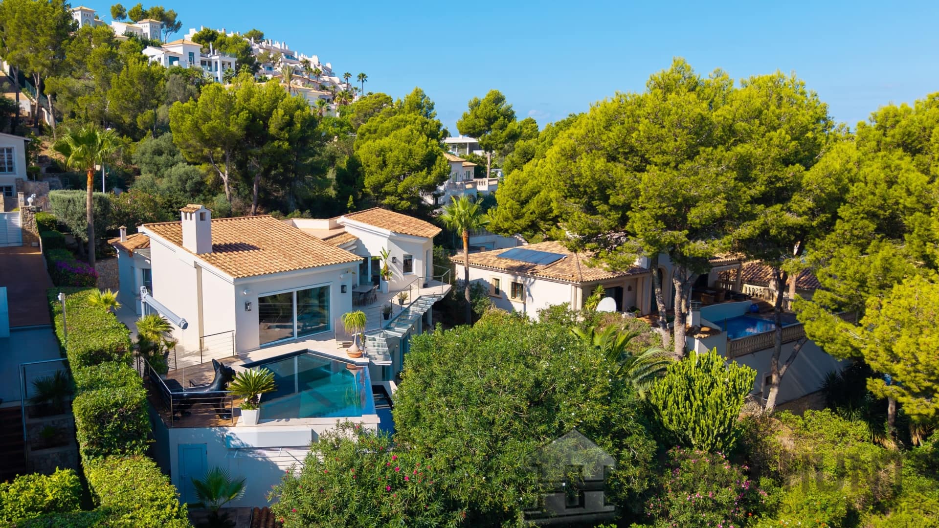 The outdoor area boasts spacious terraces, a Mediterranean garden and an infinity pool with LED lighting. A garage for two vehicles completes the offer.