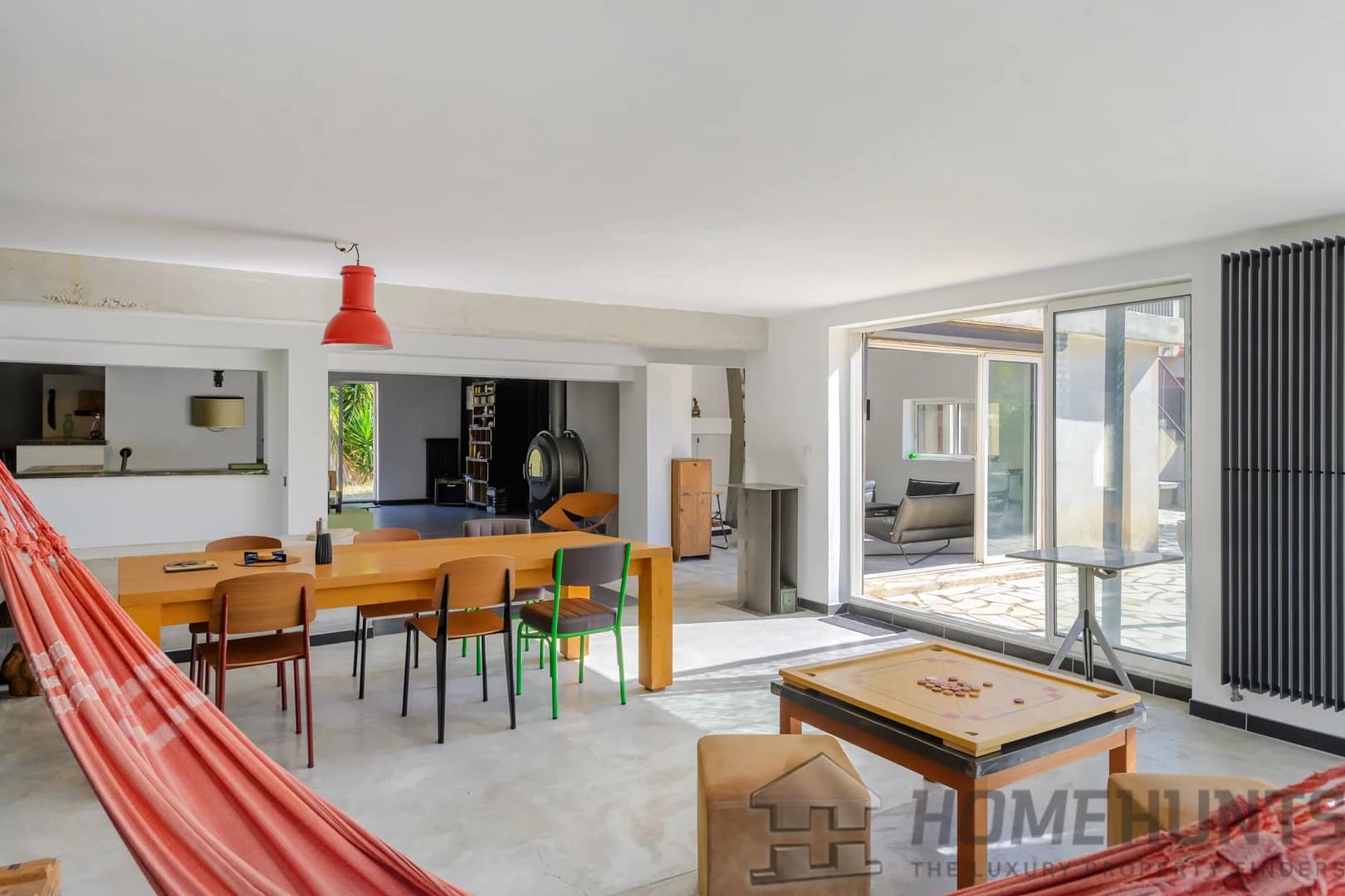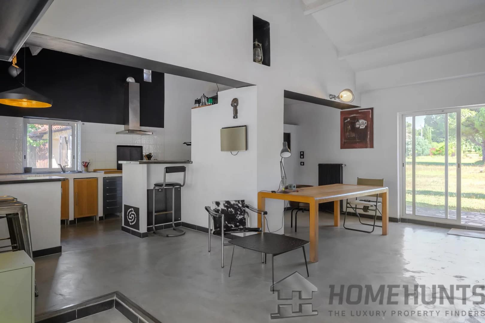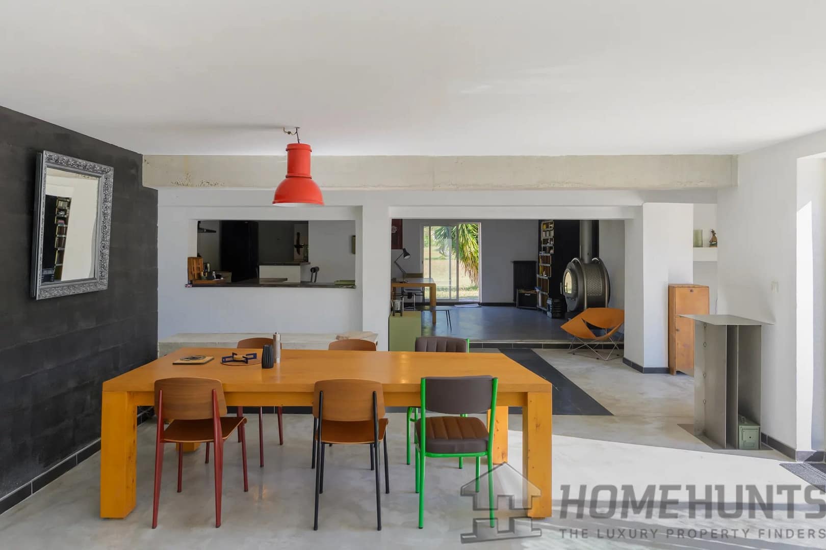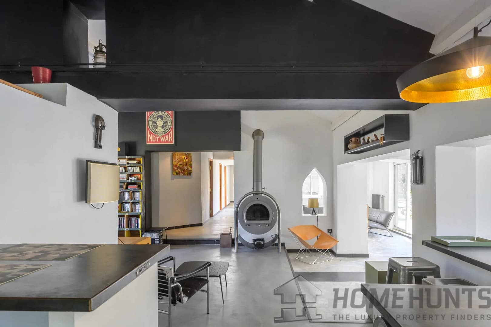 You’ll appreciate the wide sliding doors that open the home to the outdoors, the polished concrete floors, the wood-burning stove, and the villa’s raw, contemporary aesthetic.