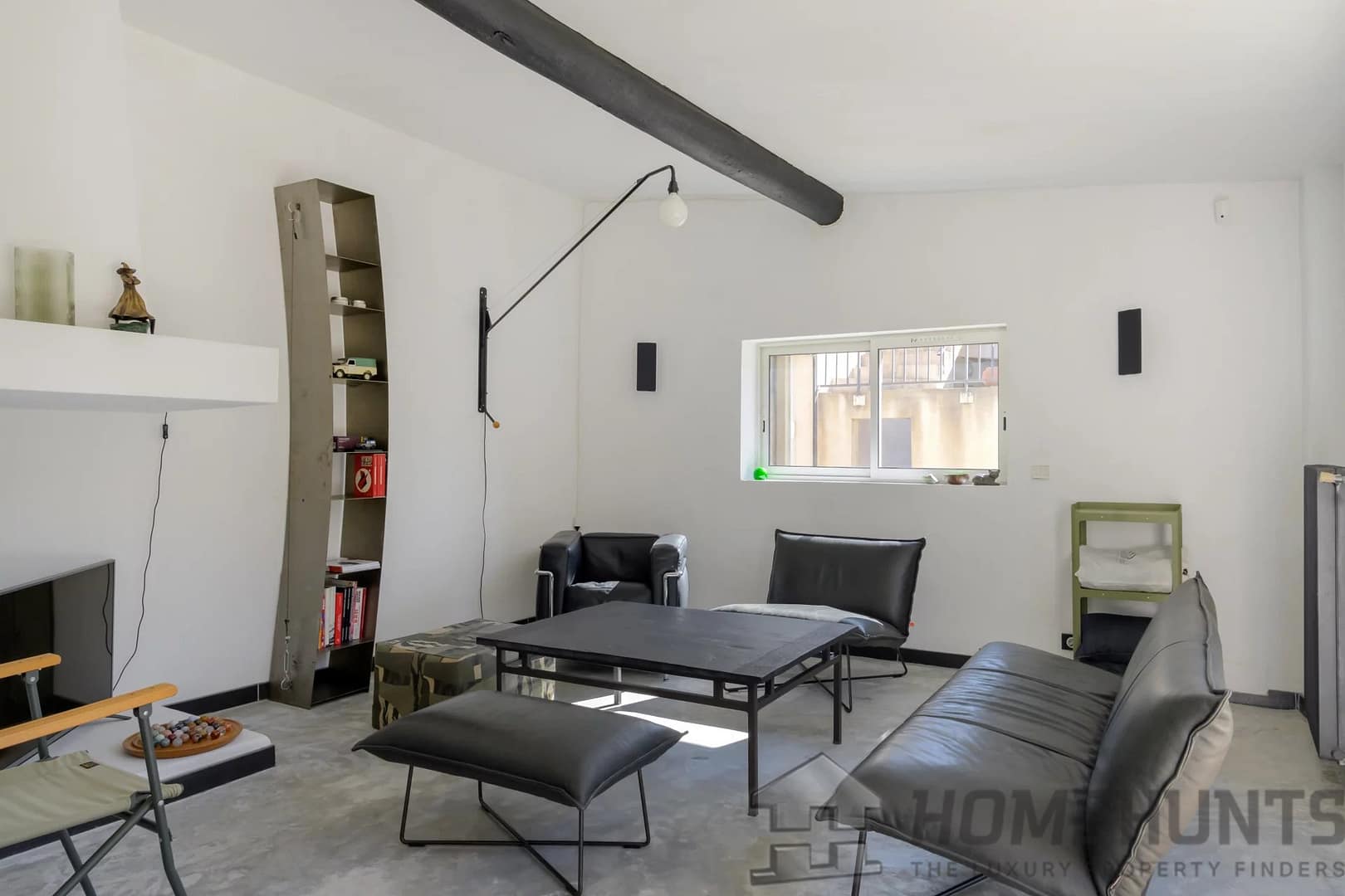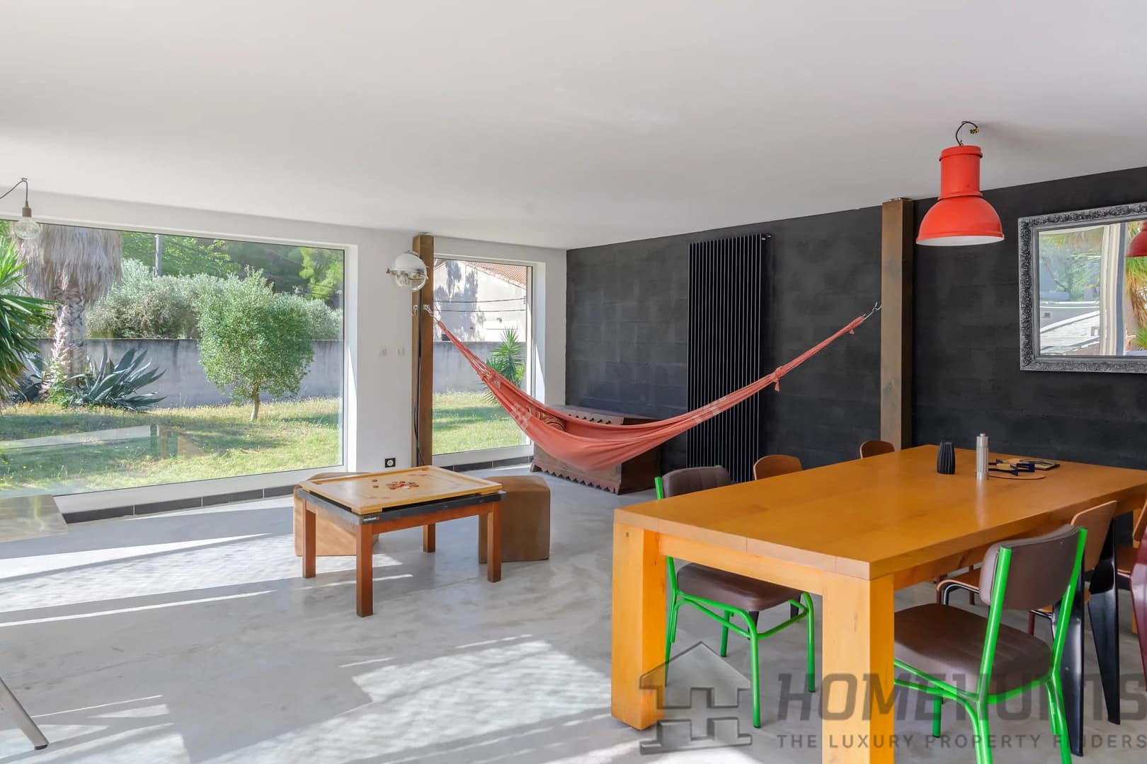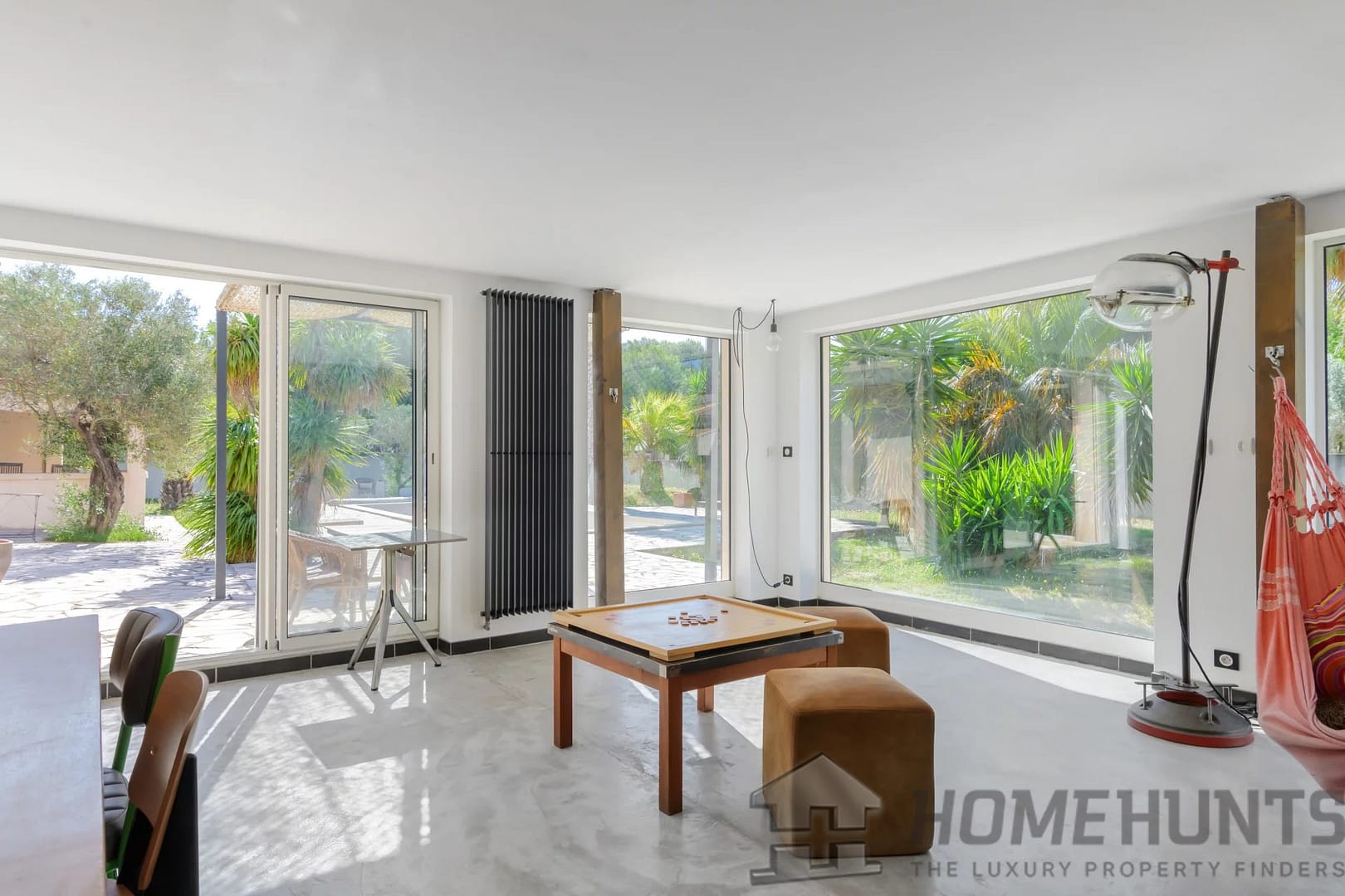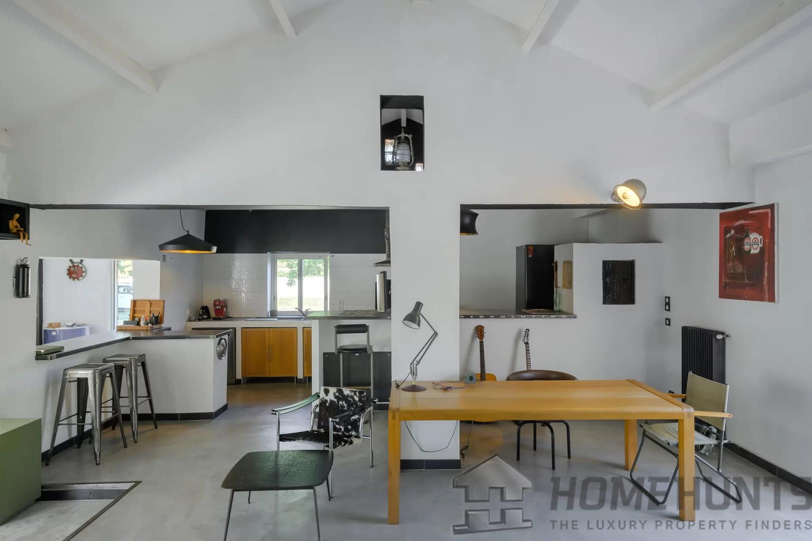 You’ll appreciate the wide sliding doors that open the home to the outdoors, the polished concrete floors, the wood-burning stove, and the villa’s raw, contemporary aesthetic.