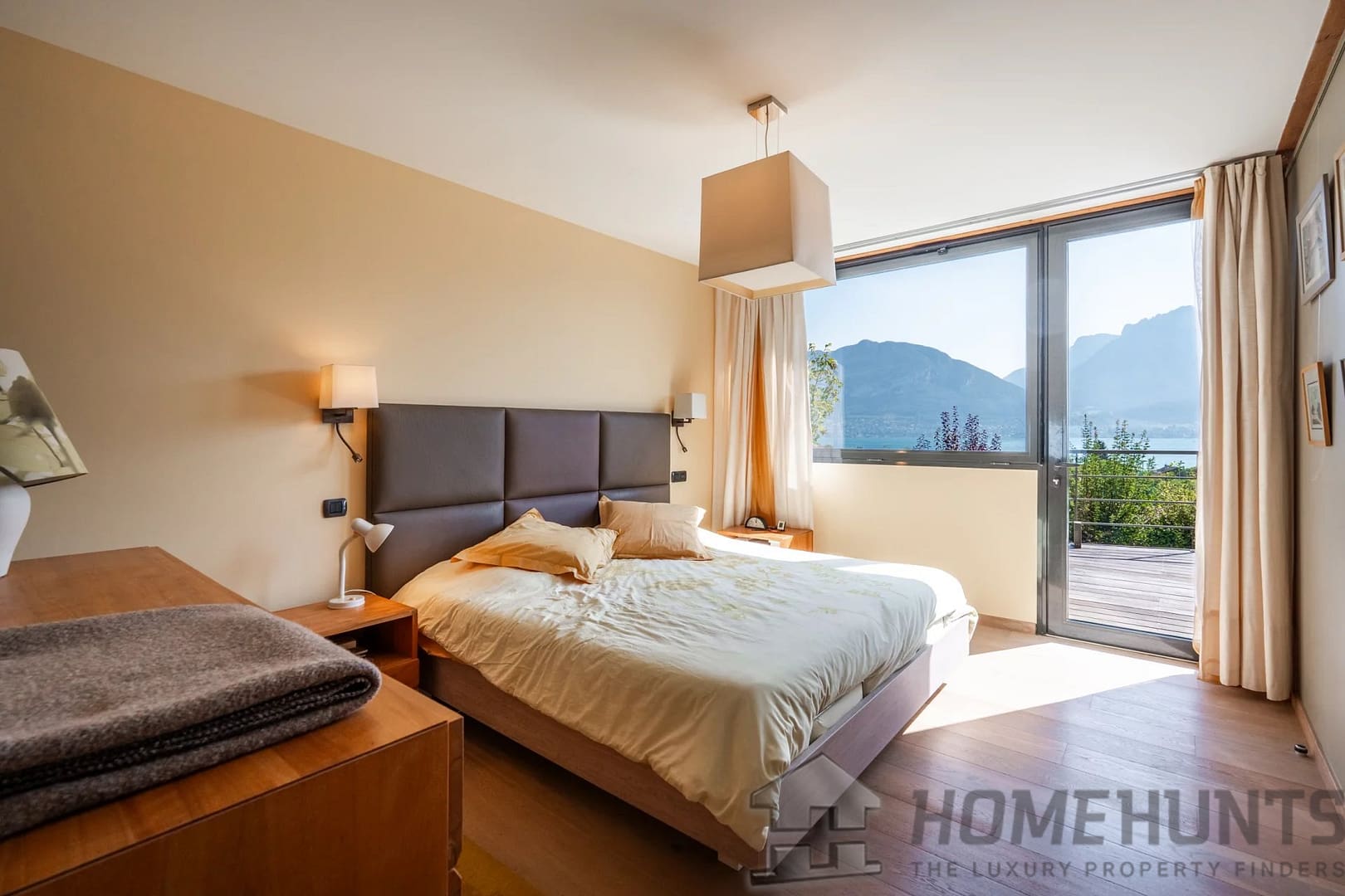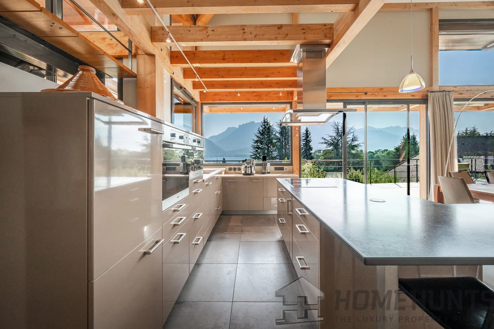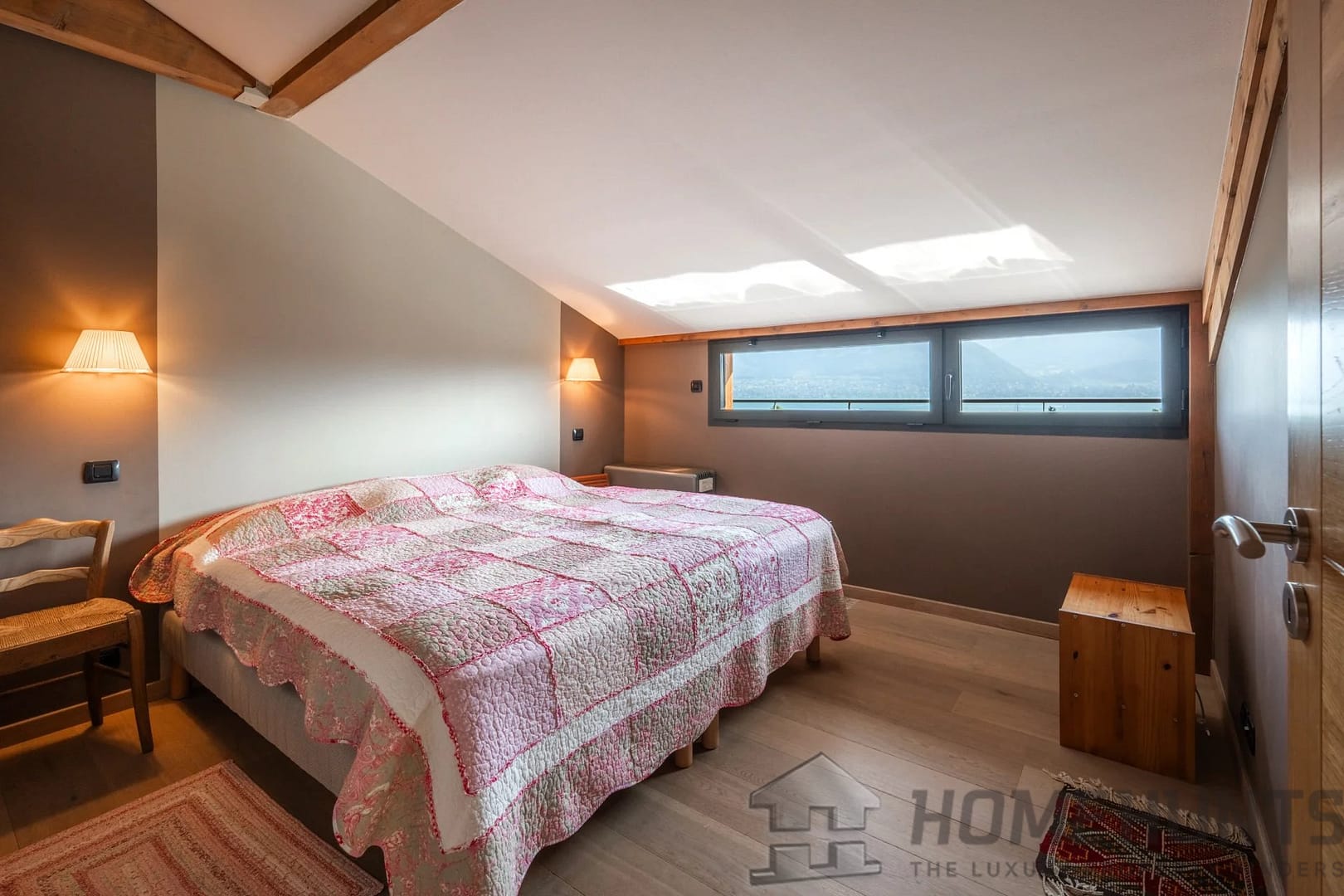 The upper level hosts a large mezzanine overlooking the living area, connecting two bedrooms with lake views, a bathroom with separate WC, and direct access to a 50 m2 solarium – an ideal outdoor relaxation space.