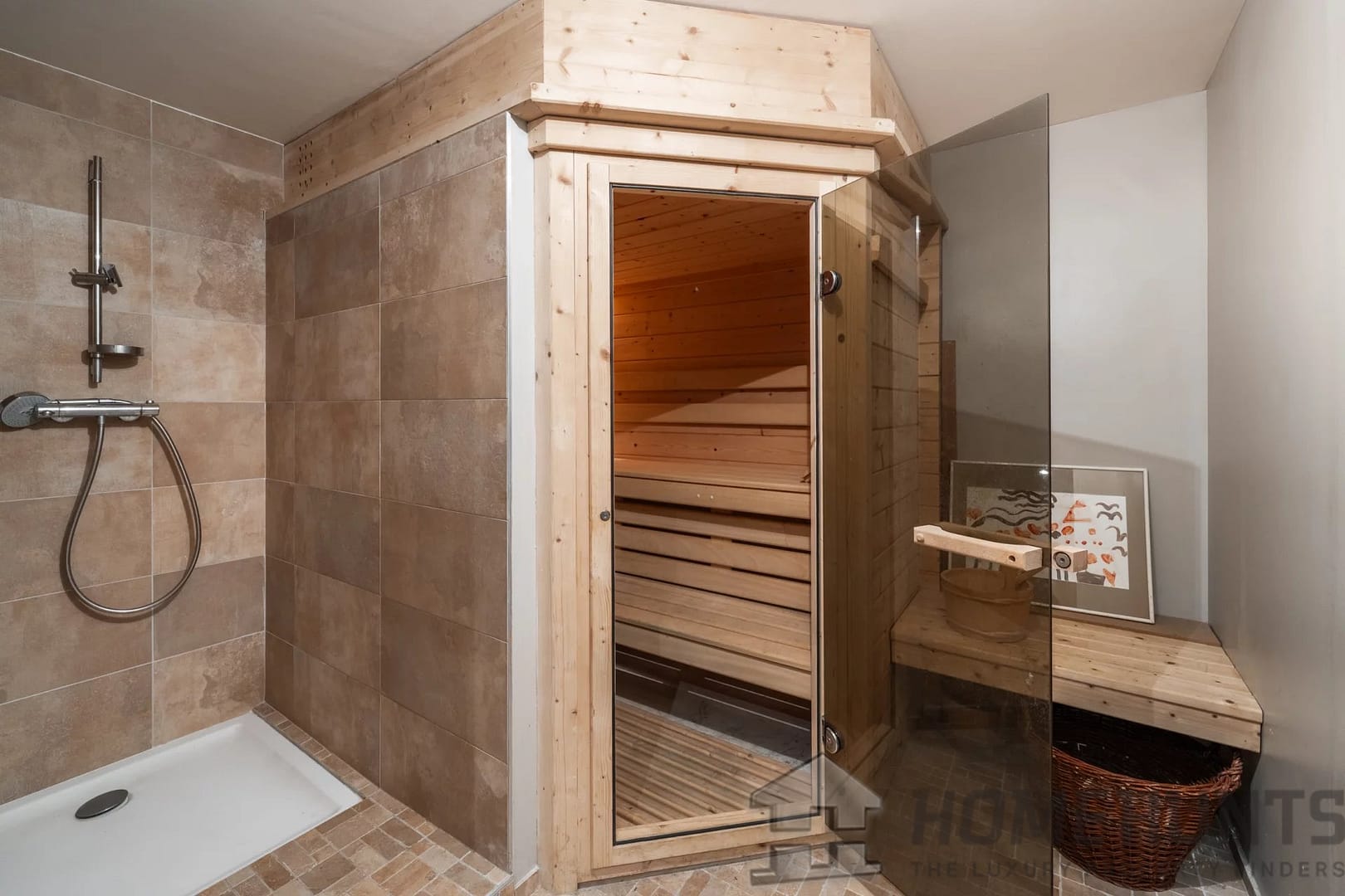 The lower level is entirely dedicated to wellness and leisure, including a home cinema, sauna, wine cellar, laundry room, and technical room.