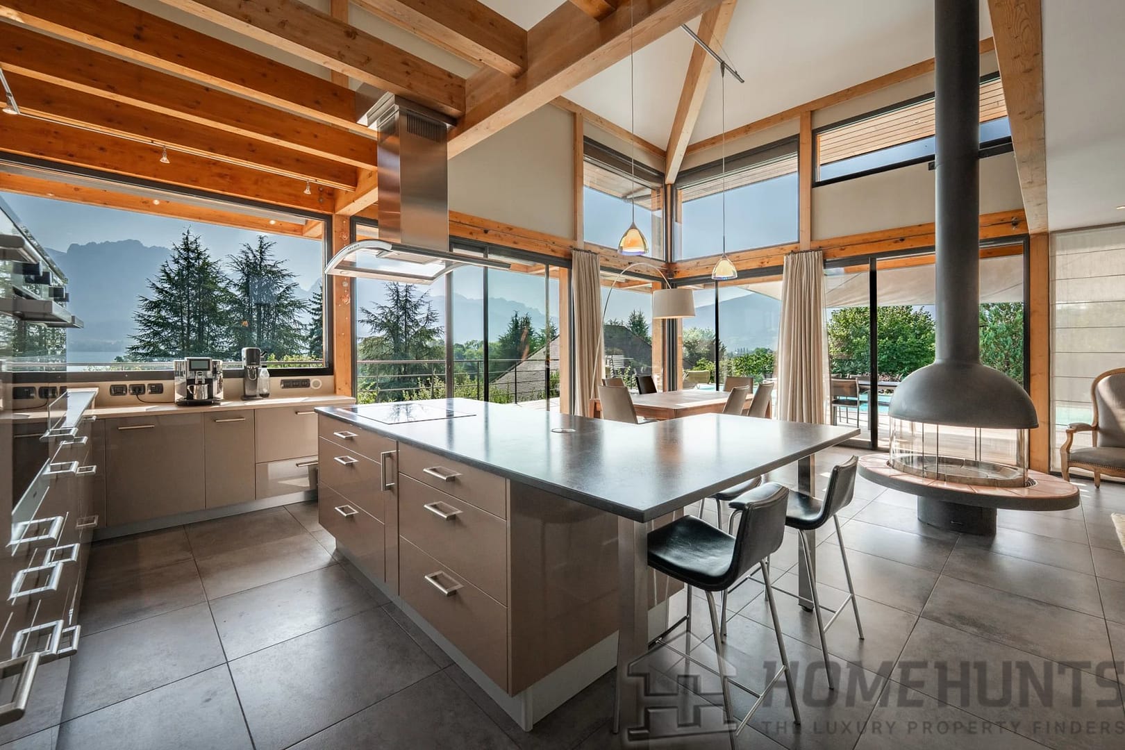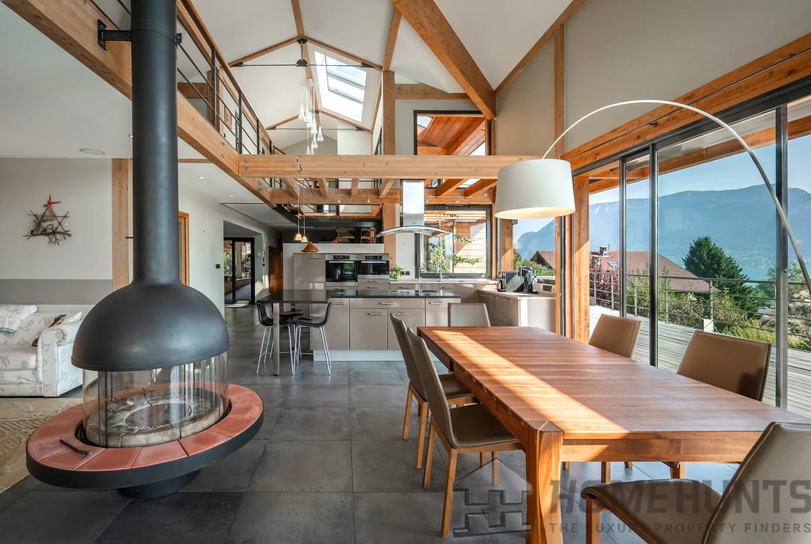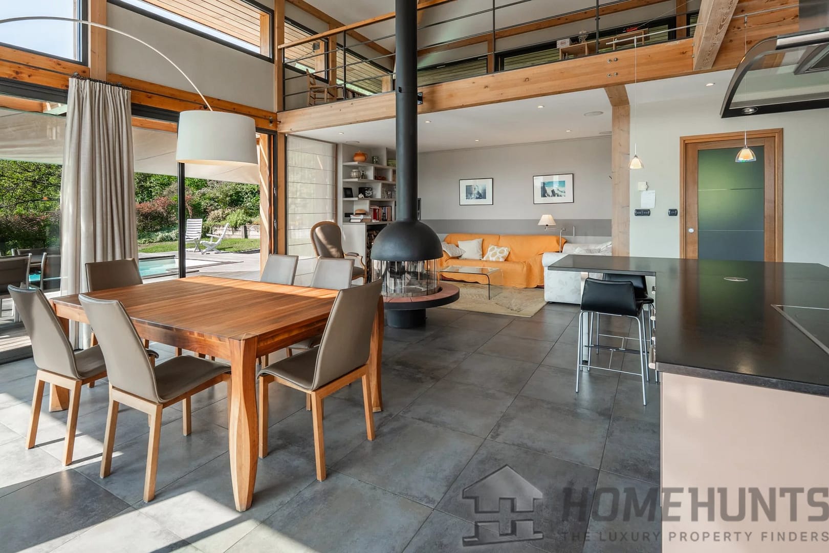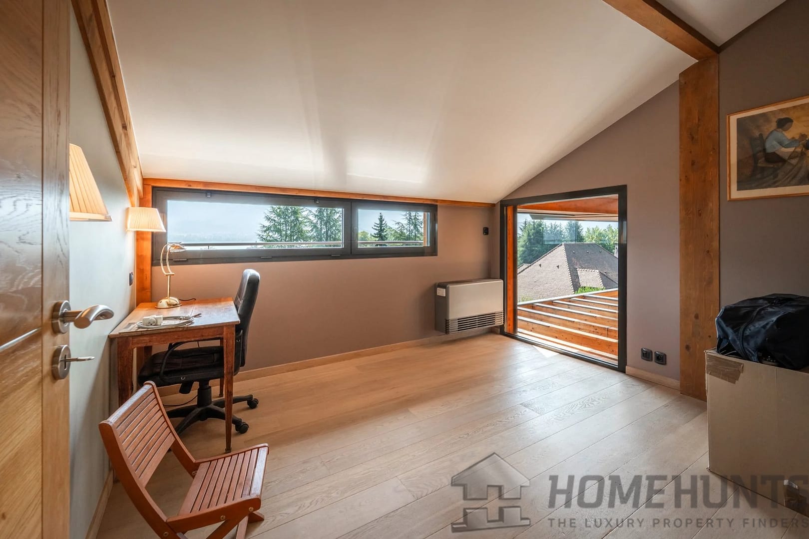 On the main level, a spacious entrance with storage leads to a large living room featuring a 360 degree central fireplace and wide openings onto the terrace. A home office, two bedrooms also opening to the outdoors, a bathroom with separate WC, and a master suite with dressing area and private bathroom complete this floor.