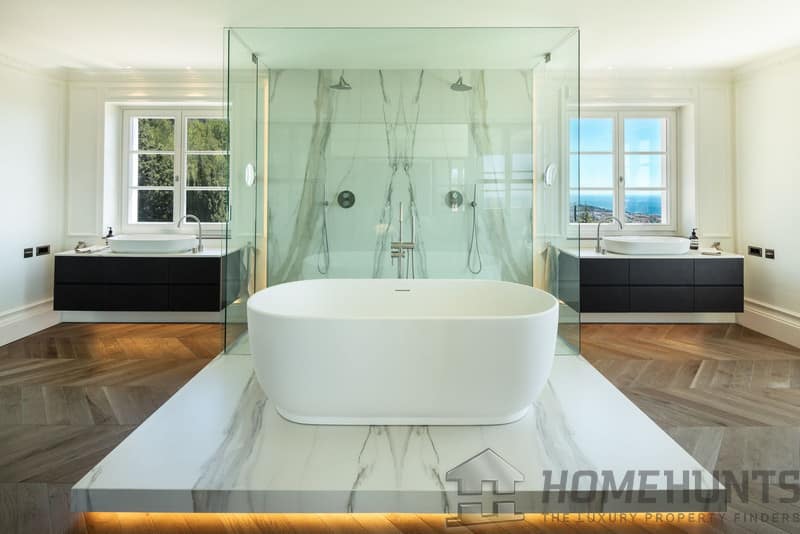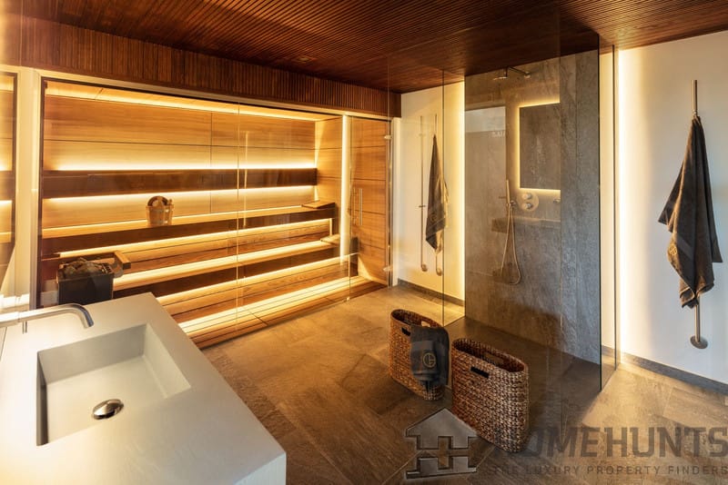 On the lower floor you will find a home cinema , gym, massage room , sauna, Turkish bath, laundry and garage for two cars plus two more bedrooms with en-suite bathrooms.