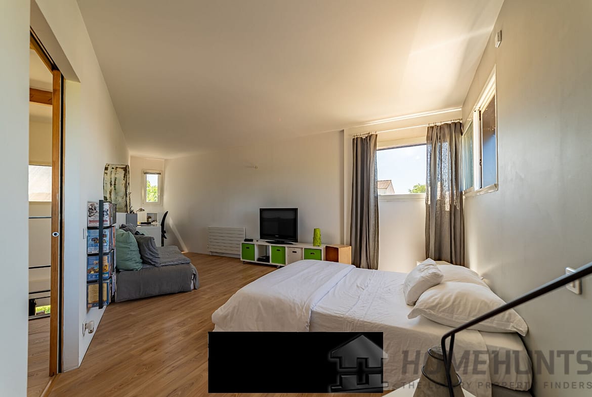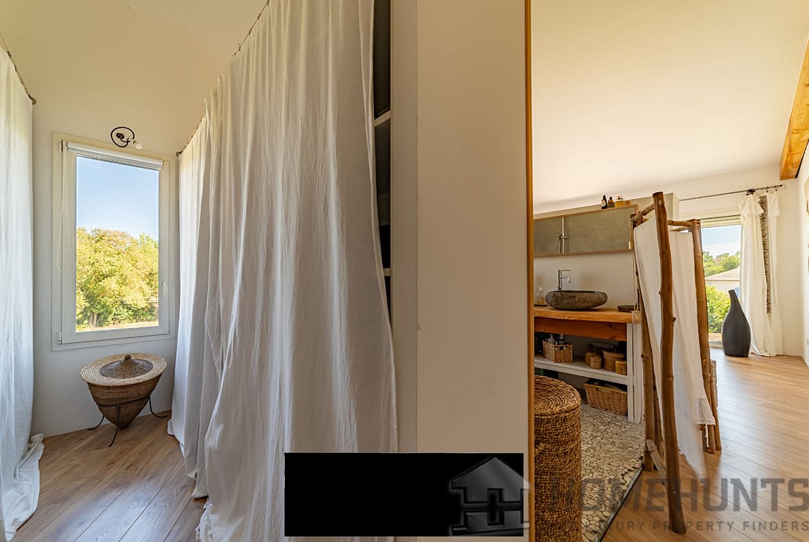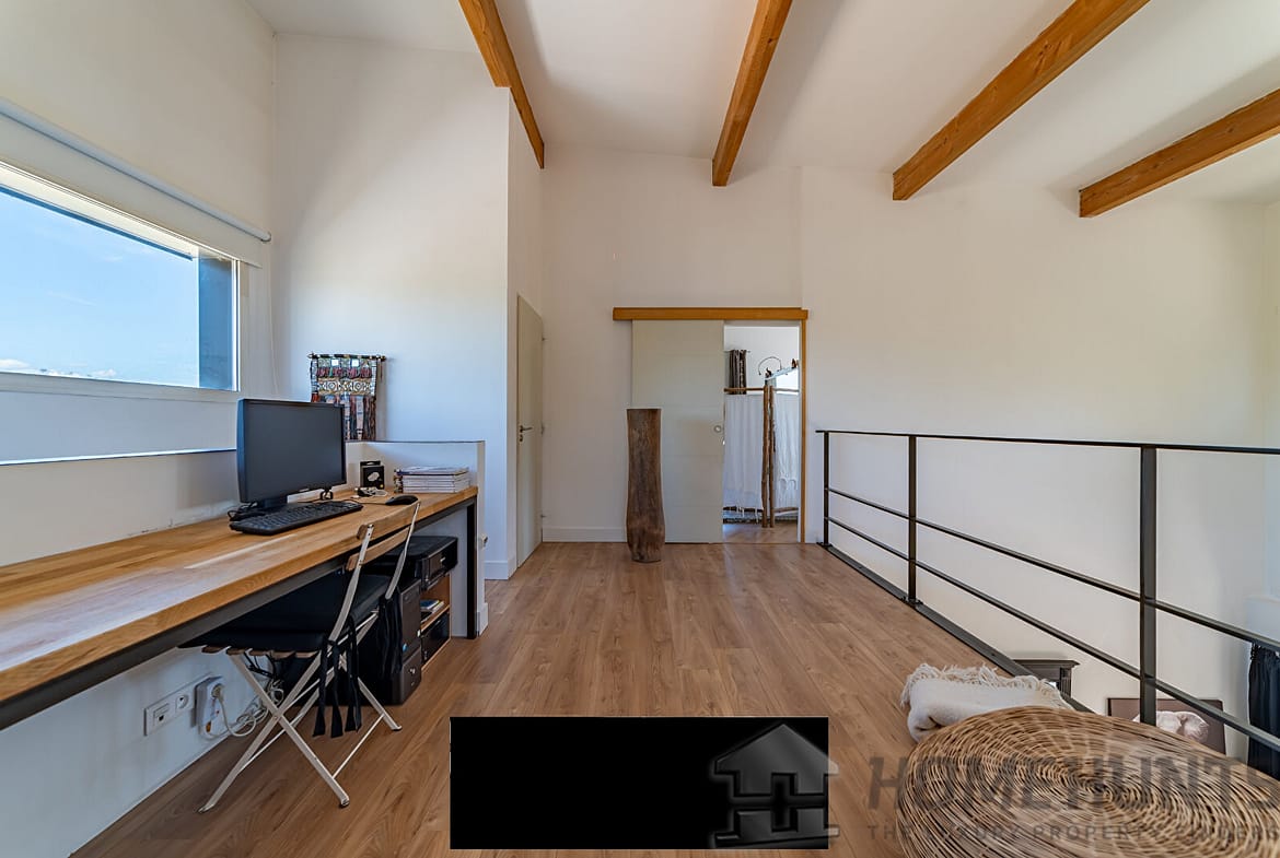 The whole communicates with the first floor by a staircase made by an iron worker. Very bright, the mezzanine accommodates an office. Comfortable and functional, this space serves the rooms. You will discover a magnificent master suite of 30 m2 with natural flooring with bathroom and dressing room, and its pretty continuous terrace. A spacious 21 m2 bedroom completes the ensemble.