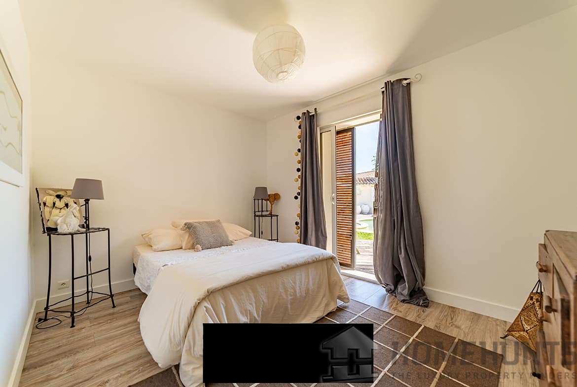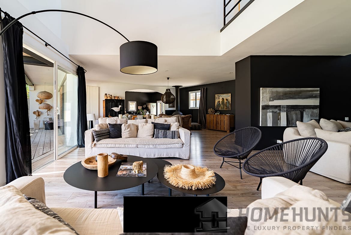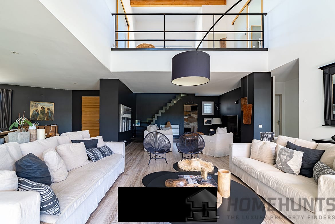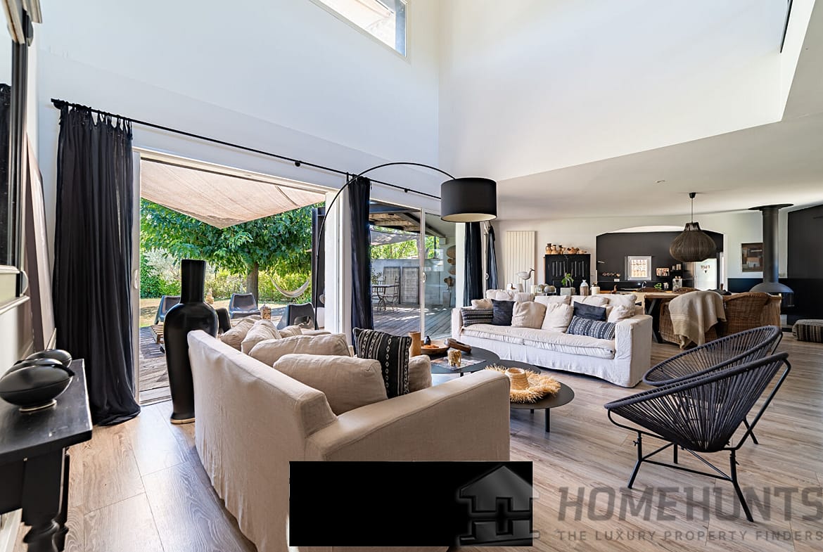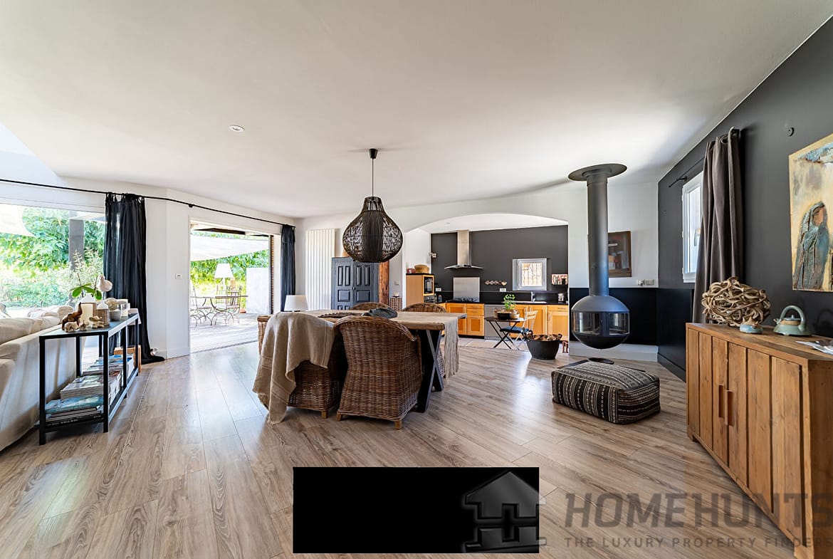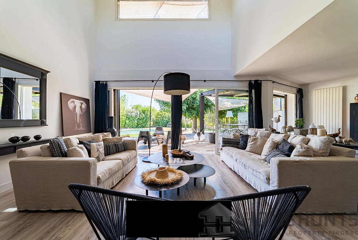As soon as you enter, you will be charmed by the living room which gives pride of place to large openings with a direct view of the garden with terrace and free-form swimming pool.