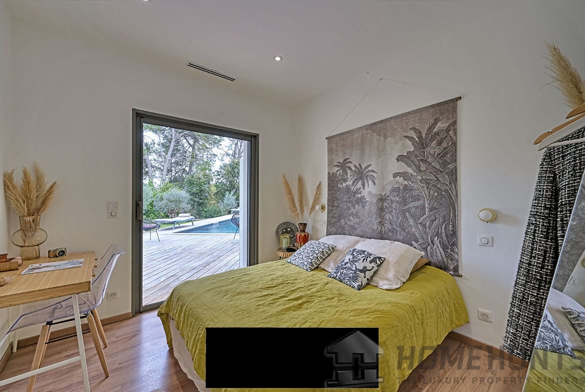 The outdoor area is sublimated by a swimming pool of 15 meters with solarium, creating a perfect harmony inside/ outside and a daily lifestyle most pleasant. The villa is spread over two levels designed for comfort and privacy of each. On one level, two welcoming bedrooms each have their own bathroom, offering an independent and practical sleeping area.