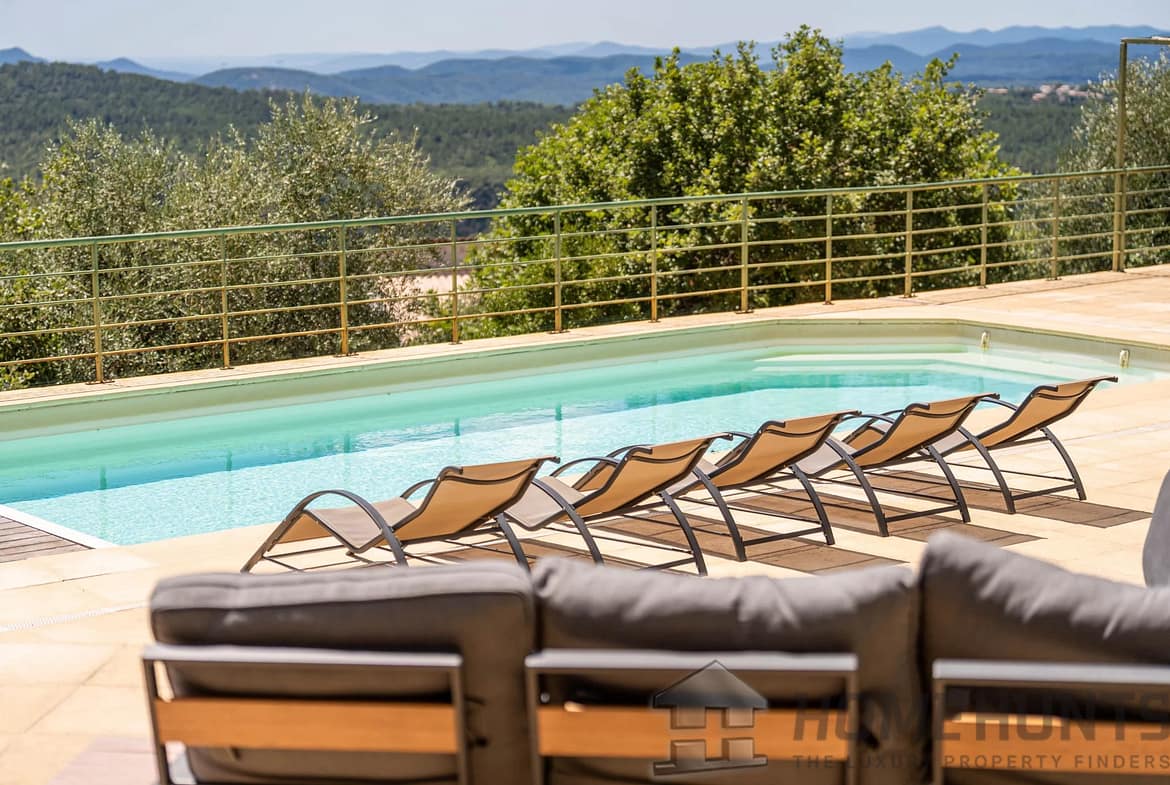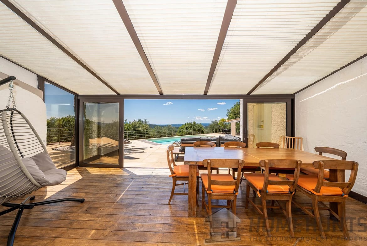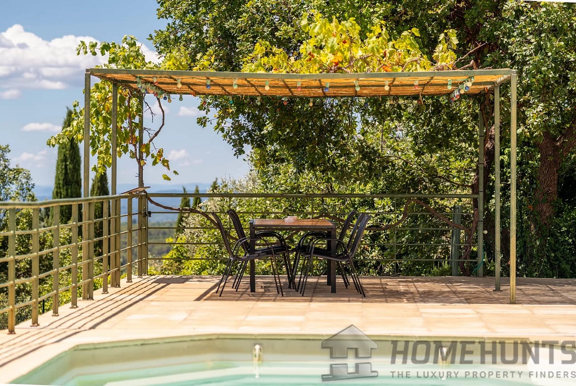 Outside, a pool area with a large terrace, including a pool house and a pergola, offers a superb 180 degree panoramic view over the hills and a lovely overview of the sea.