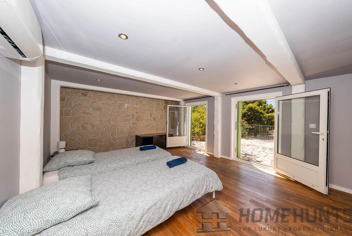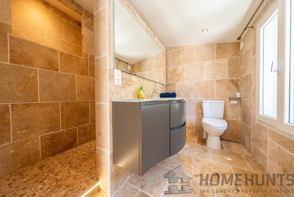 A single-storey main villa comprising an entrance hall, a large living-dining room, a kitchen, and two bedrooms each with their own bathroom. All rooms open onto a beautiful south-facing terrace.