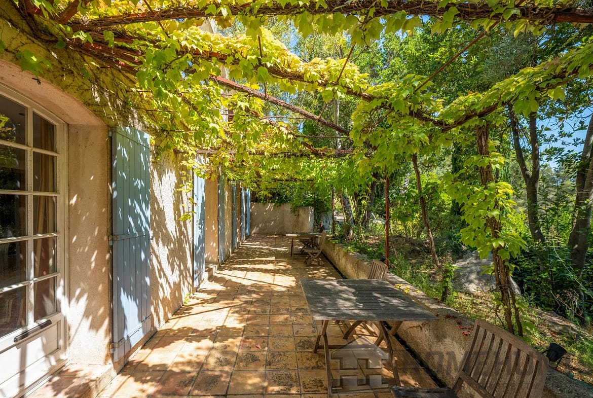The entire property benefits from multiple landscaped outdoor spaces, including a petanque court, ample parking, and unobstructed views of the surrounding natural landscapes.