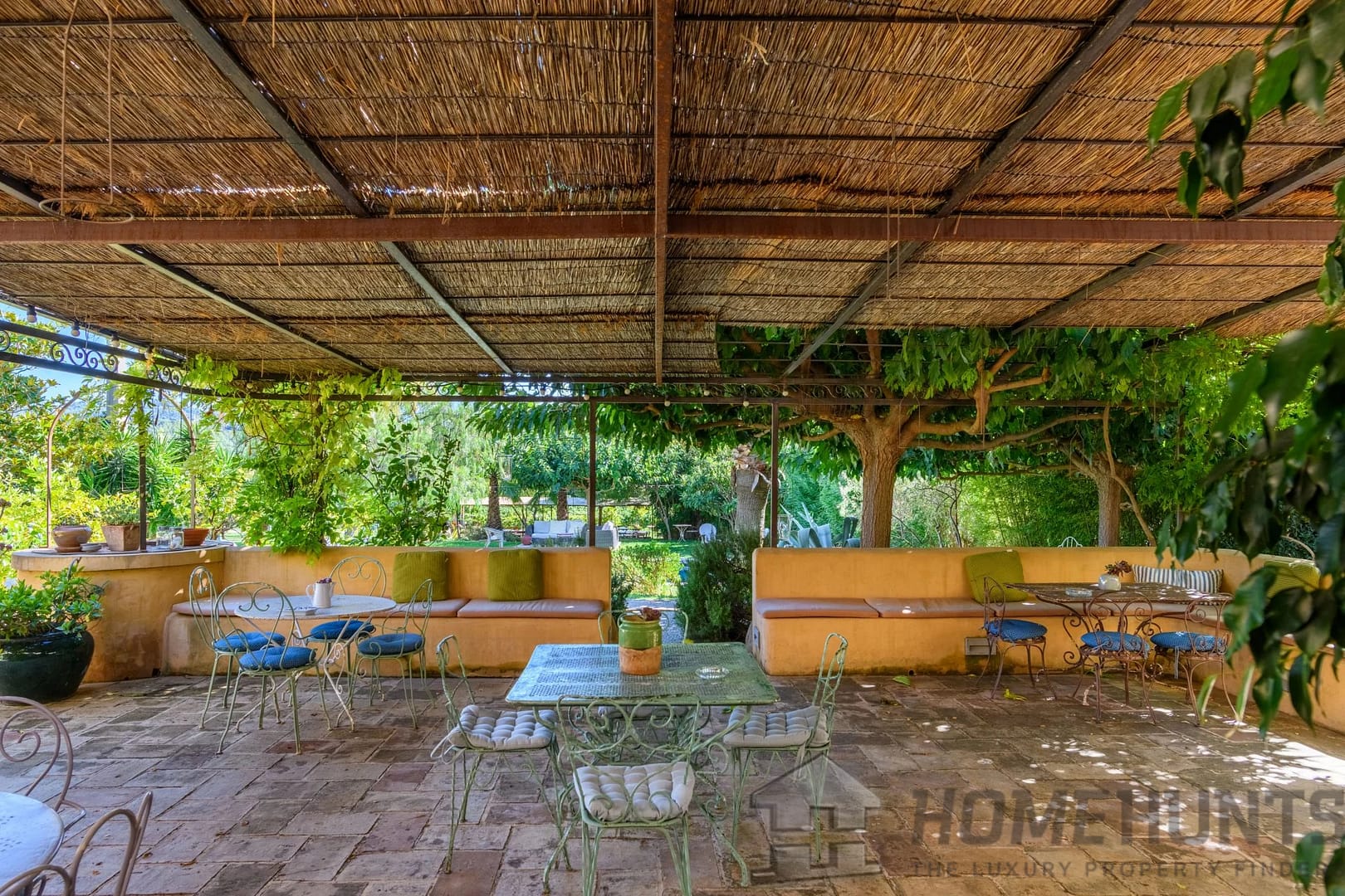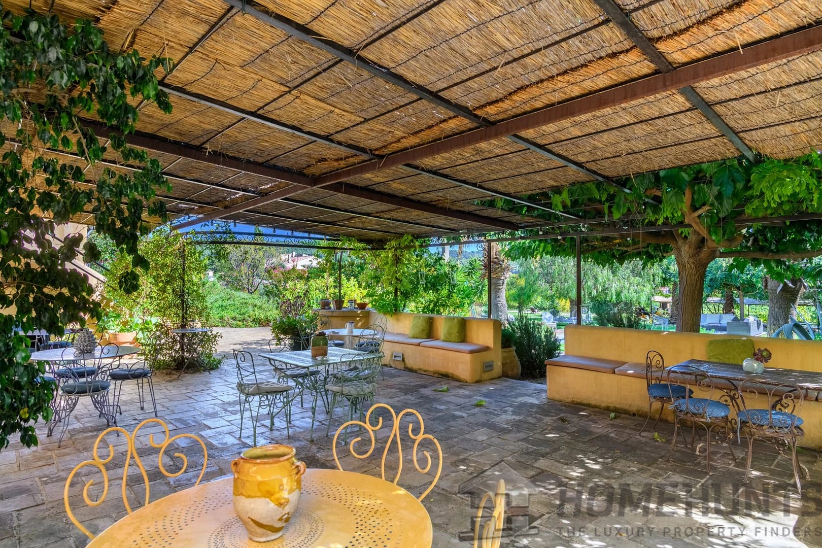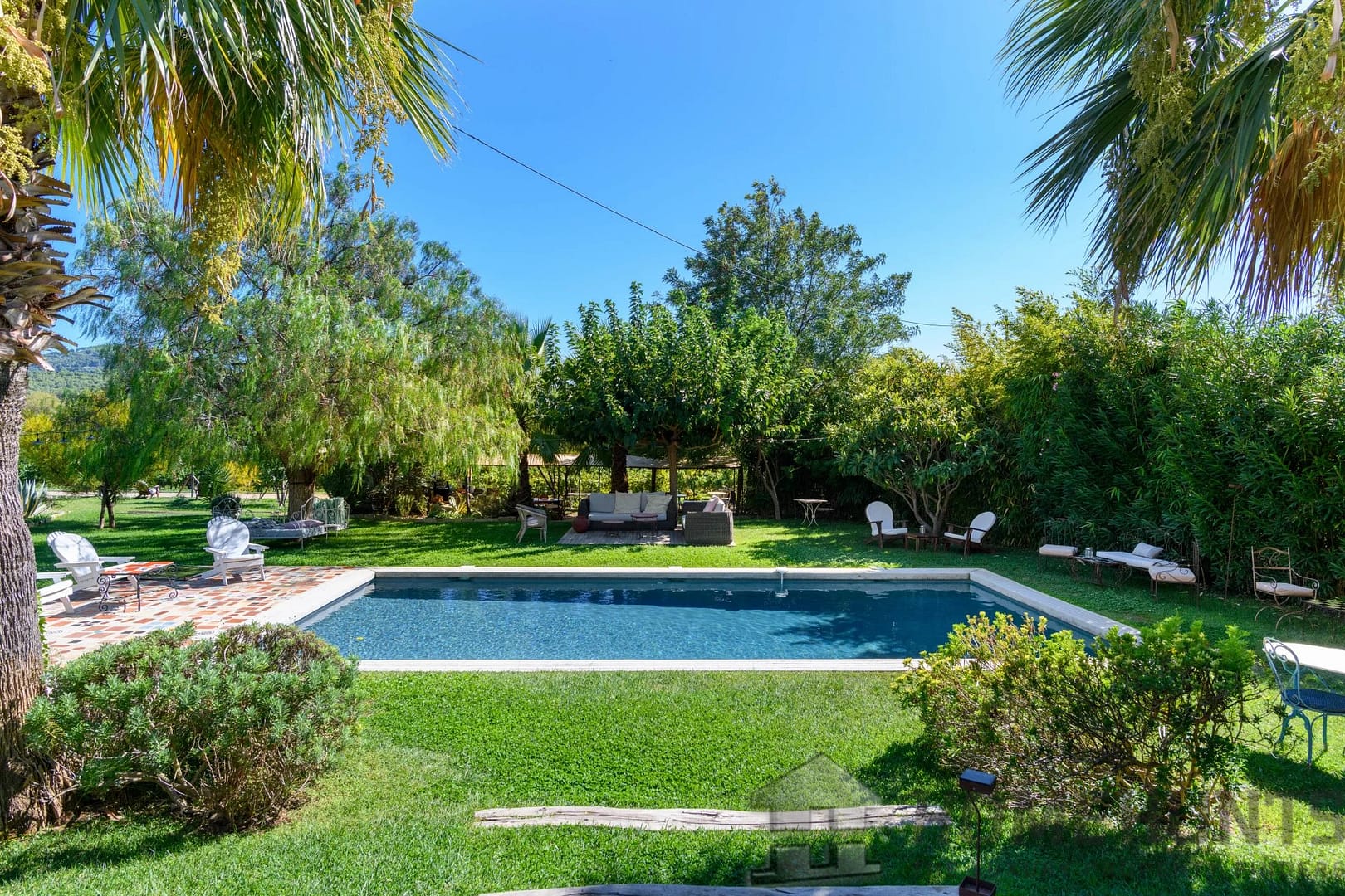 The south-facing garden is planted with Mediterranean species and features a swimming pool, a pergola, and a summer kitchen.