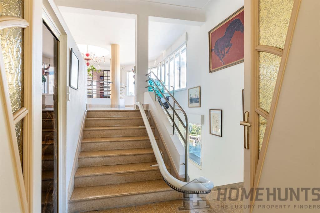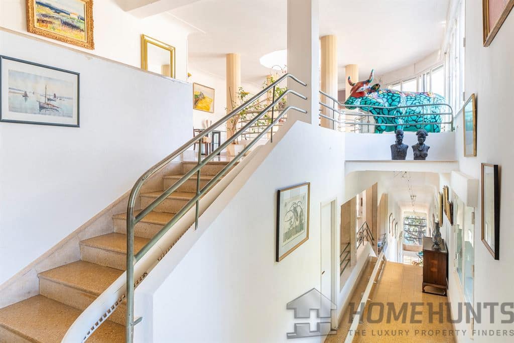 Spread over five floors, the property comprises a double living space with living/dining room, ten potential bedrooms, eight bathrooms, an office, and two kitchens. Thanks to its double east/west exposure, the villa enjoys constant sunlight throughout the day.