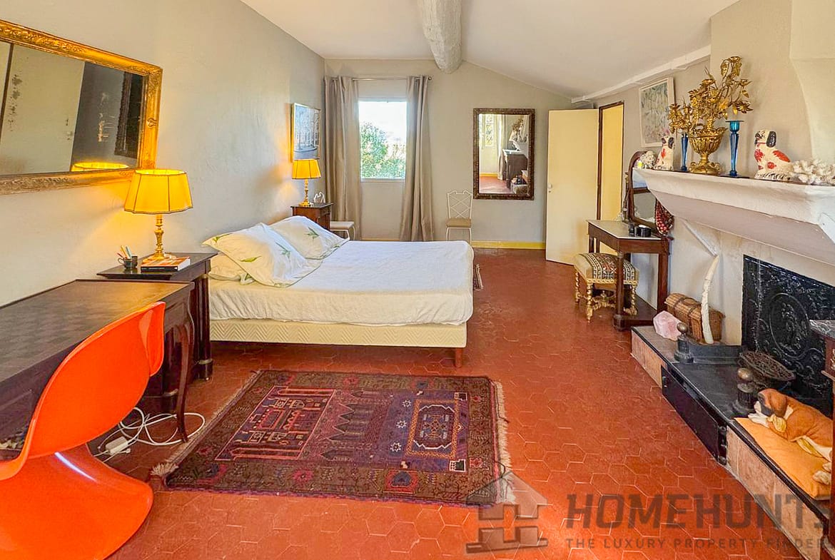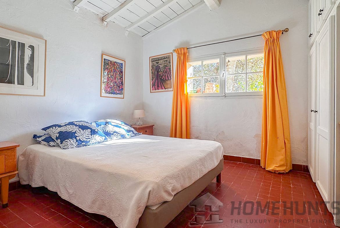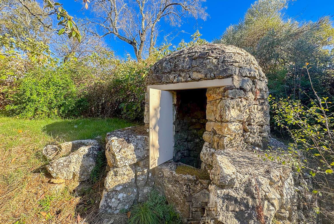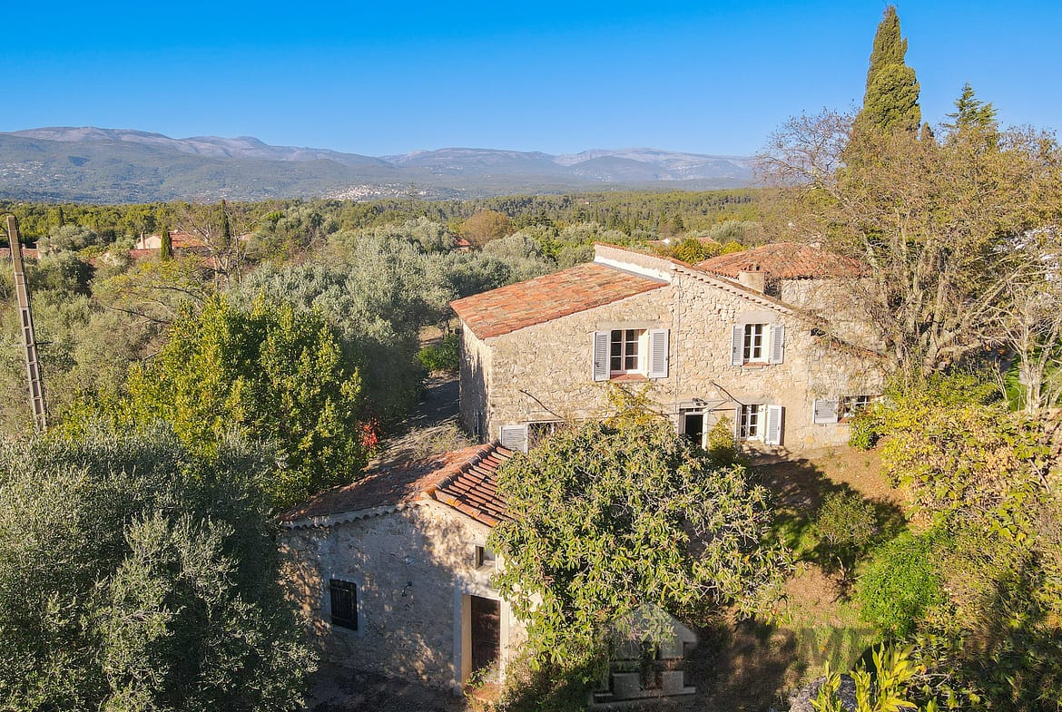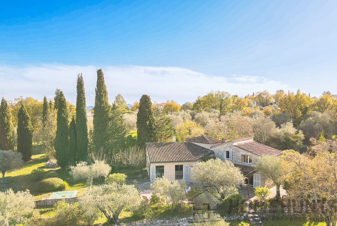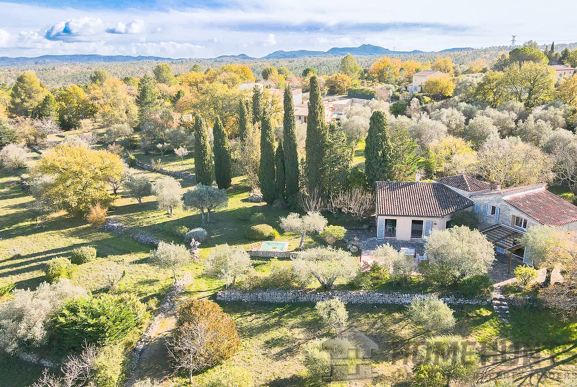 Situated in a lush green setting, just 400 metres from the village, this former stone bergerie stands on over one hectare of flat land, offering beautiful views over the surrounding hills and a garden planted with olive trees, pink oleanders and cypress trees.