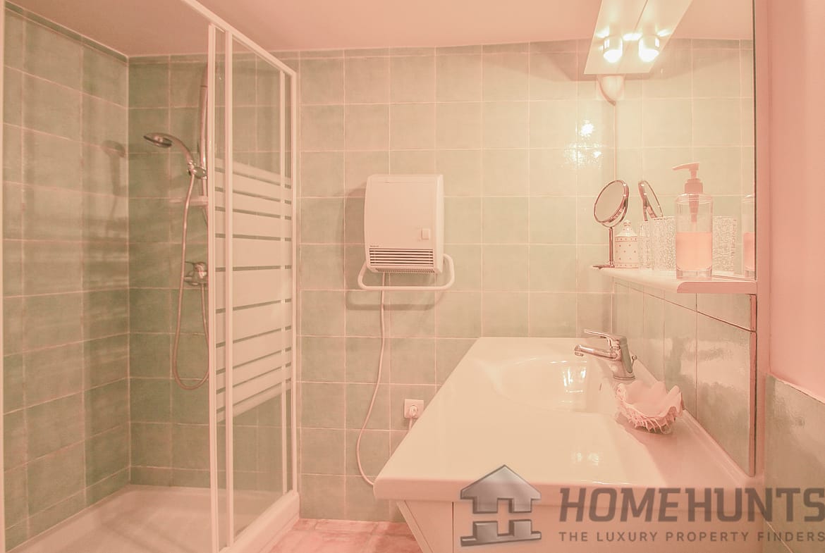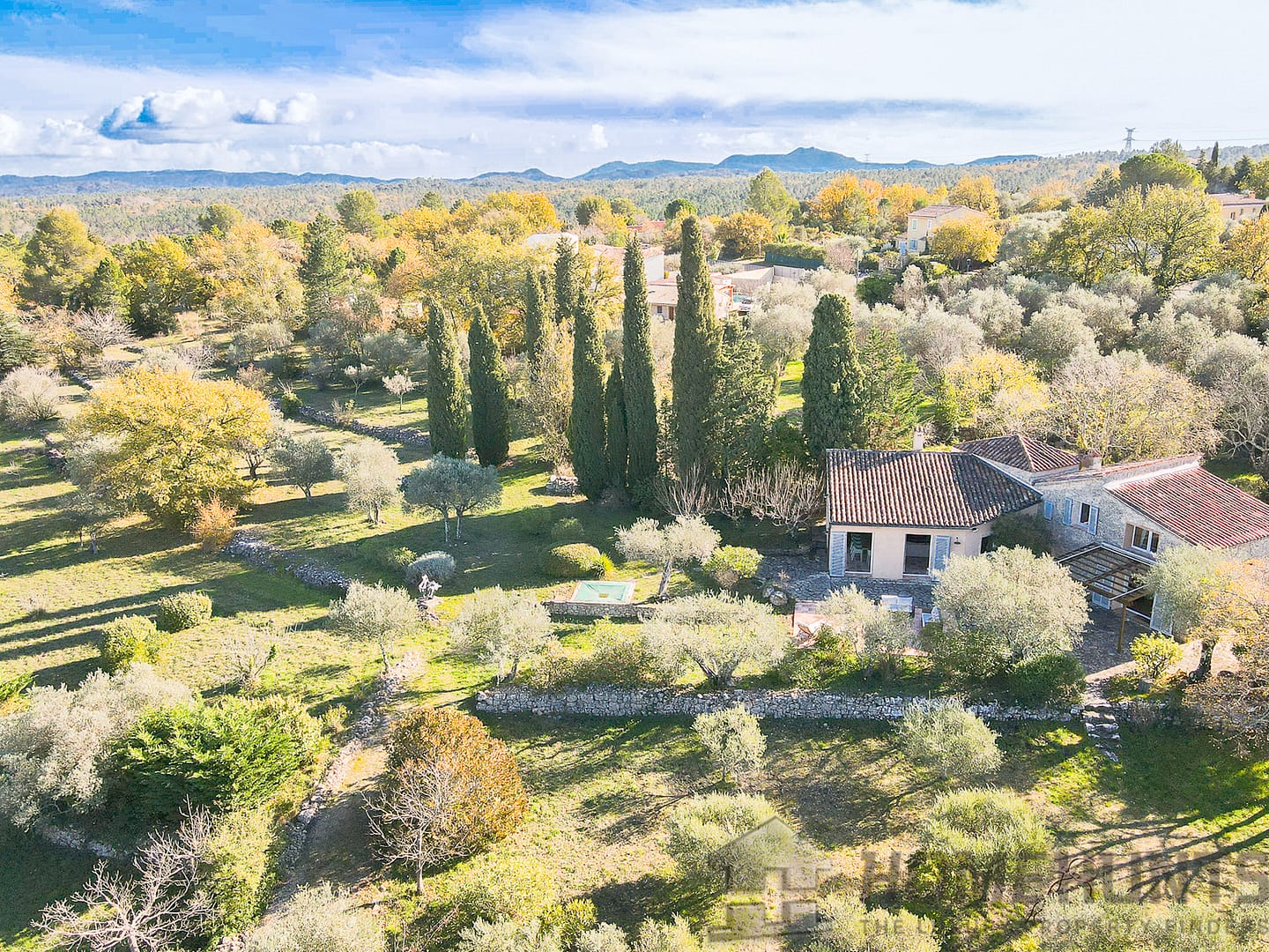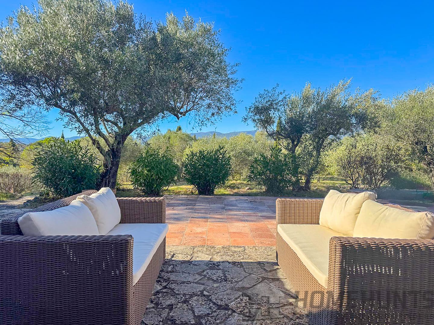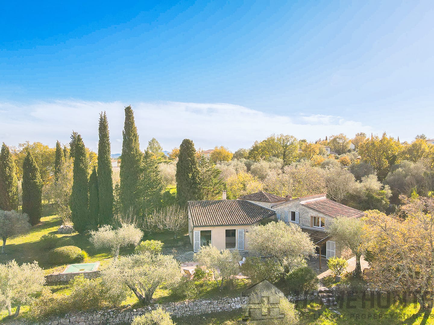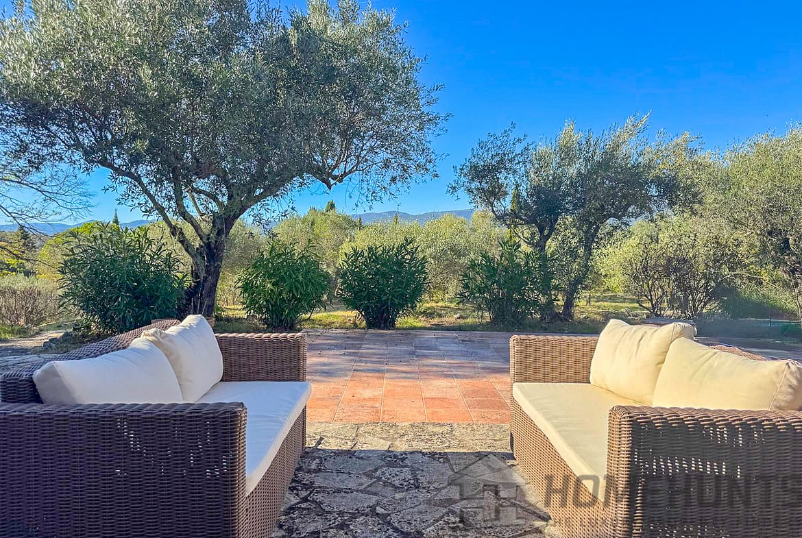 Situated in a lush green setting, just 400 metres from the village, this former stone bergerie stands on over one hectare of flat land, offering beautiful views over the surrounding hills and a garden planted with olive trees, pink oleanders and cypress trees.