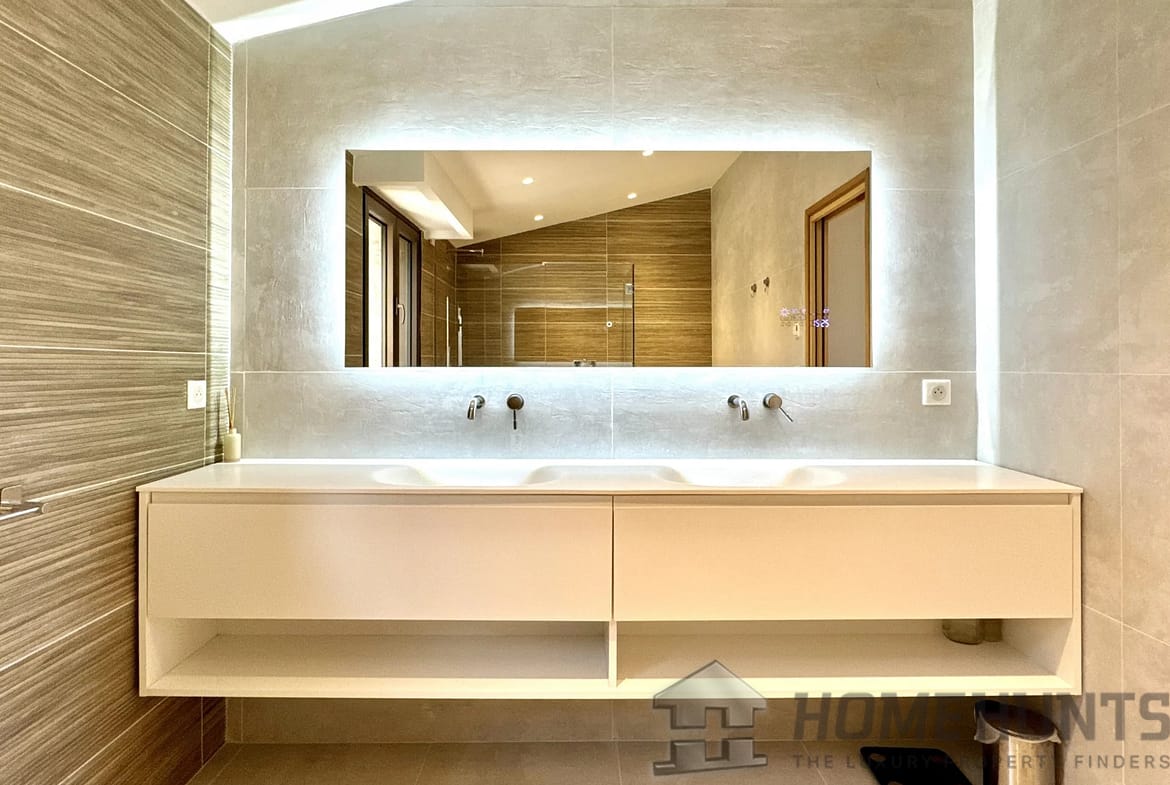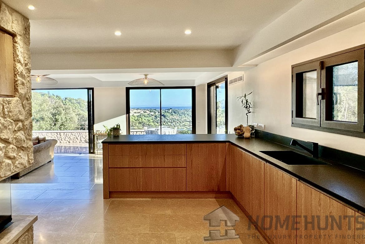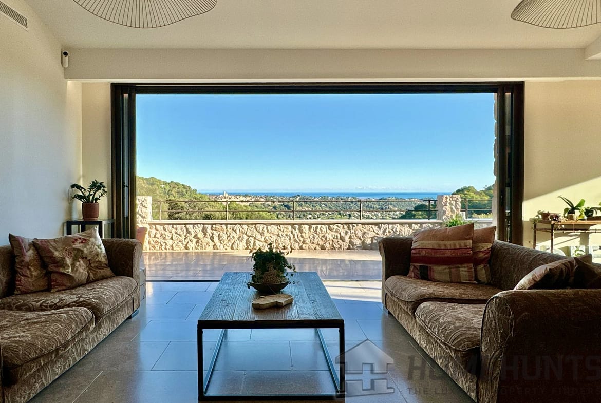 From the living room, you enjoy a breathtaking view of the landscape thanks to the large sliding windows that disappear into the wall when opened, creating a seamless transition between rooms. An ideal place to enjoy the sun and the mild Mediterranean climate.
