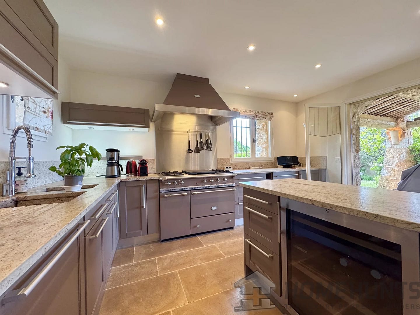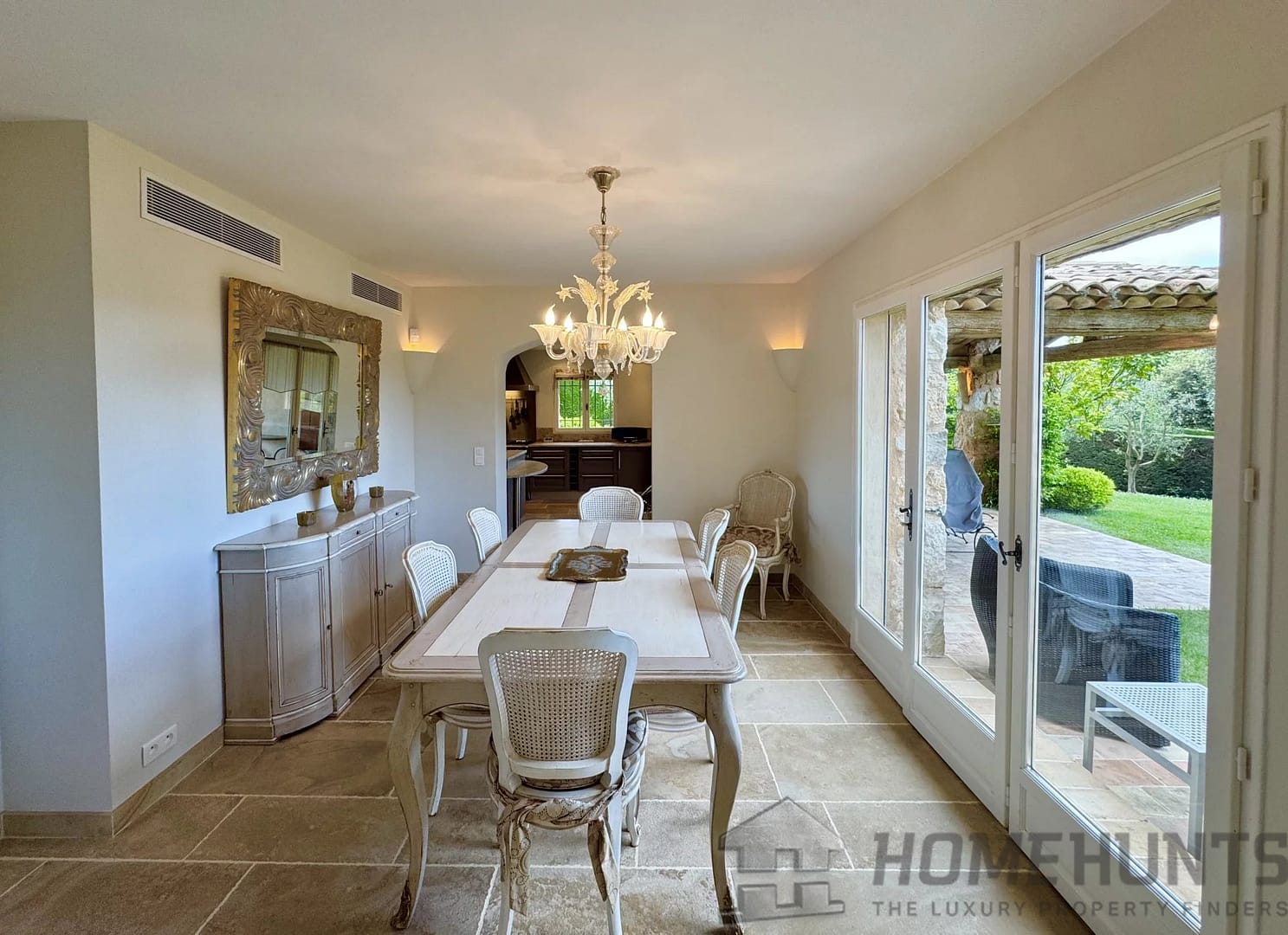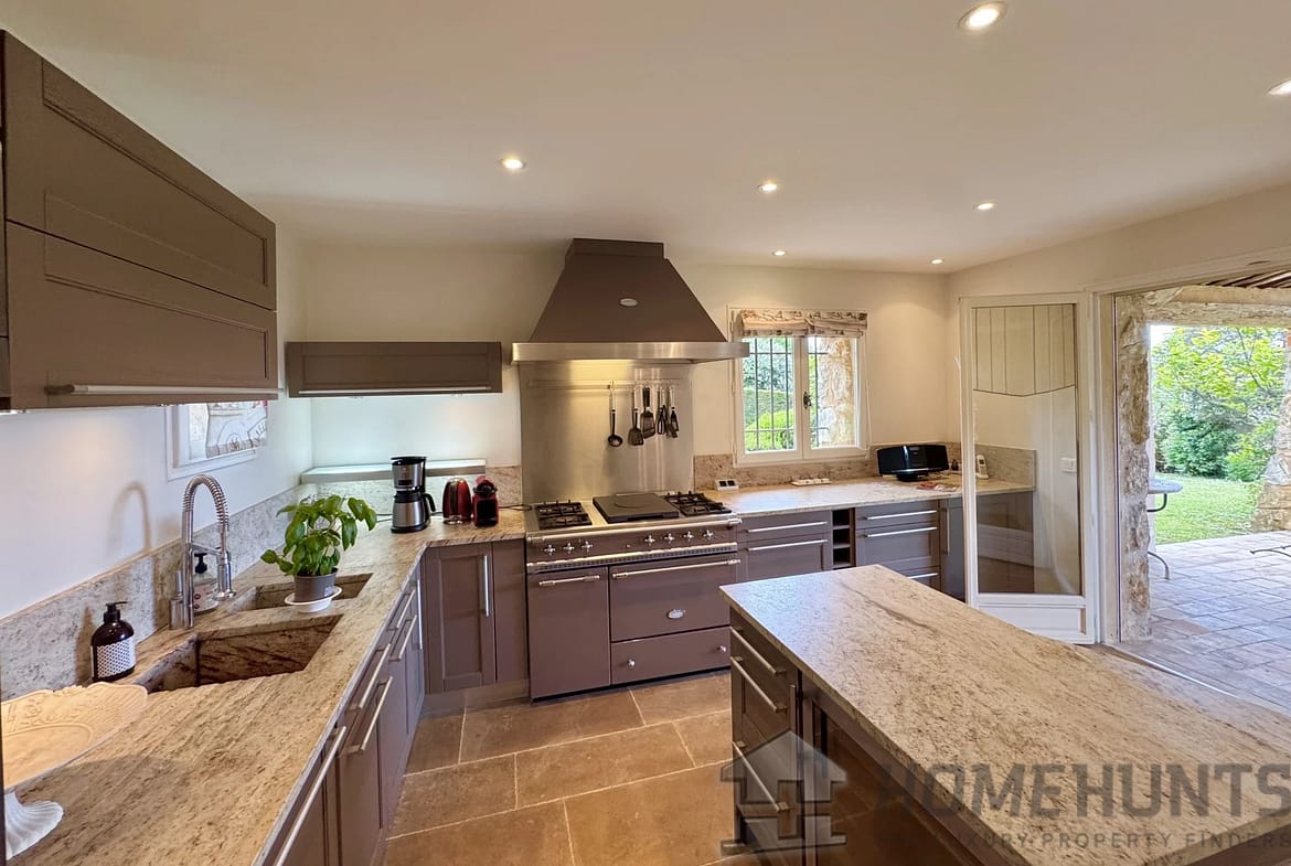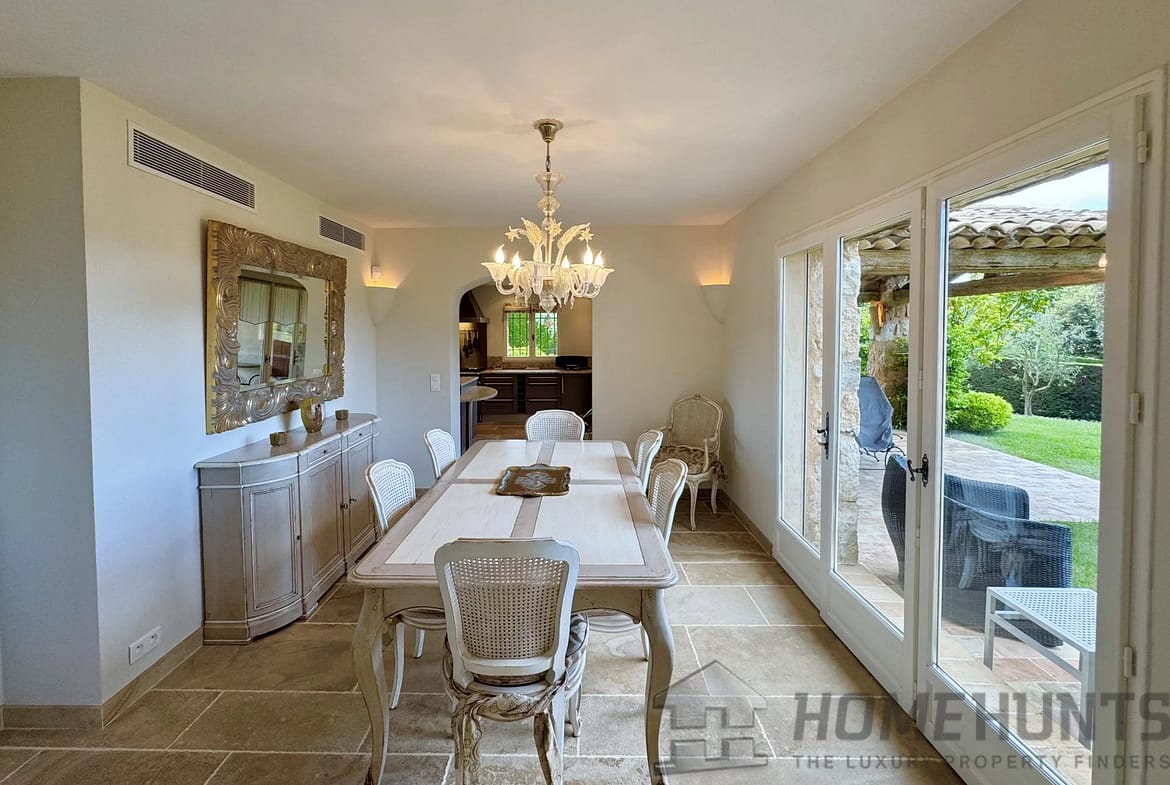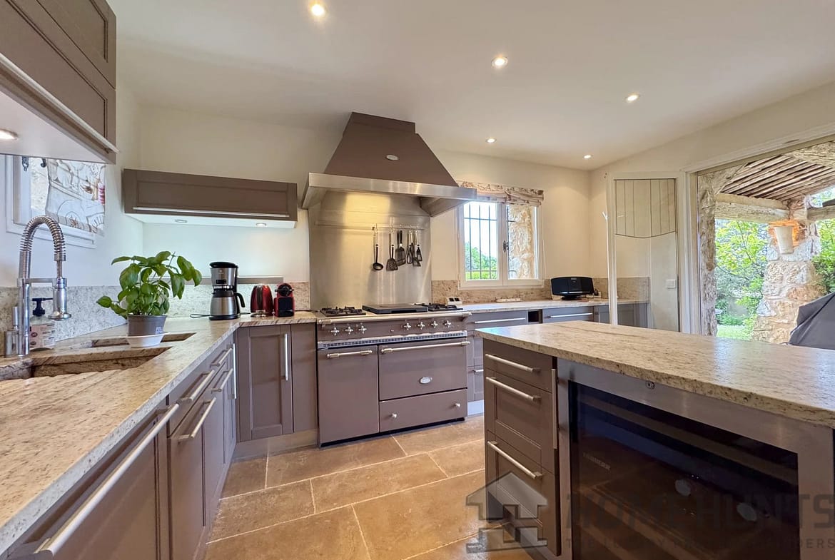 A welcoming entrance hall, a spacious and bright living room with a fireplace, and a dining area. Flowing naturally from the dining room, a fully equipped kitchen extends to an elegant shaded summer kitchen, ideal for hosting convivial outdoor meals.