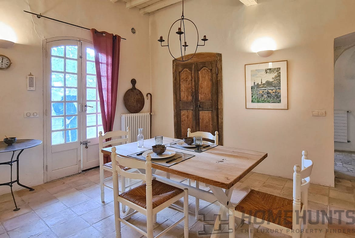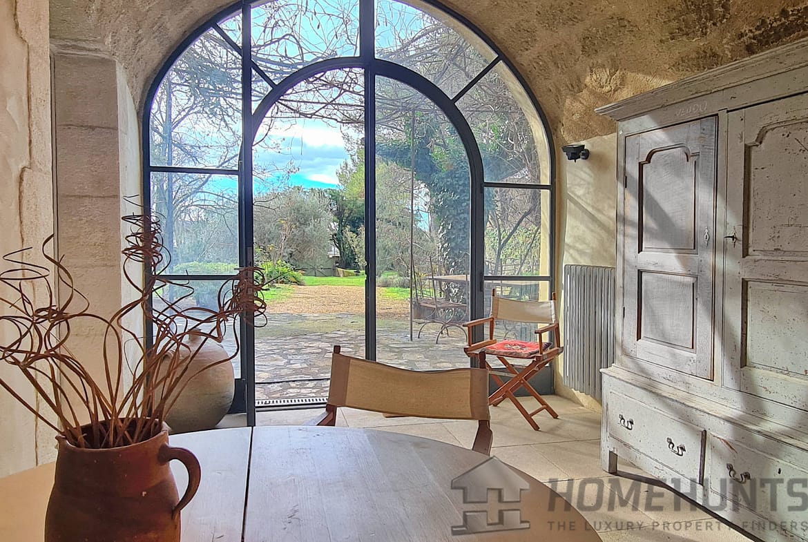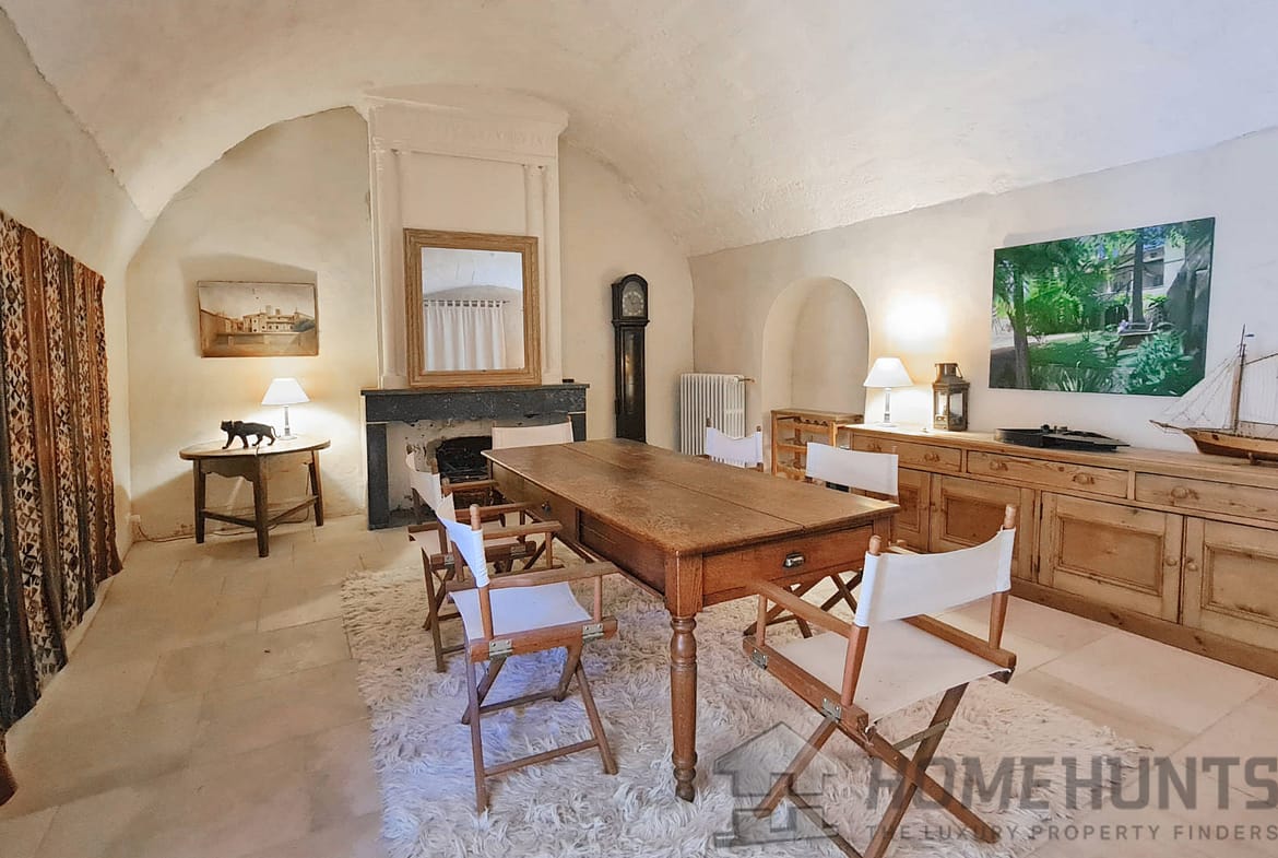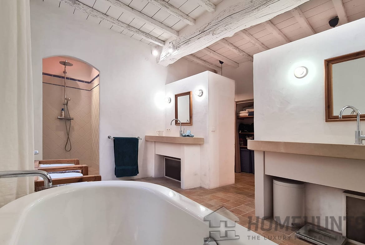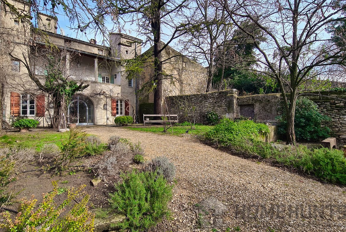 Offering nearly 330 m2 of living space, the house includes on the ground floor a large entrance hall leading to a superb dining room, a summer kitchen and a first vaulted living room. On this floor there is also access to the cellar, a laundry room, the boiler room for the city gas central heating and a guest toilet. Magnified by its large terrace with colonnades, the first floor was chosen as the main living level: an spacious living room with French ceiling and tall windows also features terracotta floors; the kitchen-diner opens onto the terrace and is extended by the “patouille” housed in the old tower of the property. On this level, we also find the master bedroom with direct access by elevator. Opening onto the terrace, it also benefits from a small alcove in the second tower of the property. This suite is completed by a dressing room opening onto an elegant full bathroom with 2 stone basins, bathtub and spacious shower. Guest toilet.