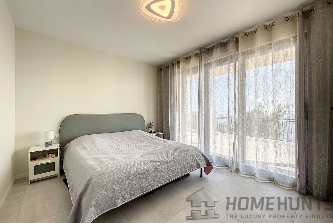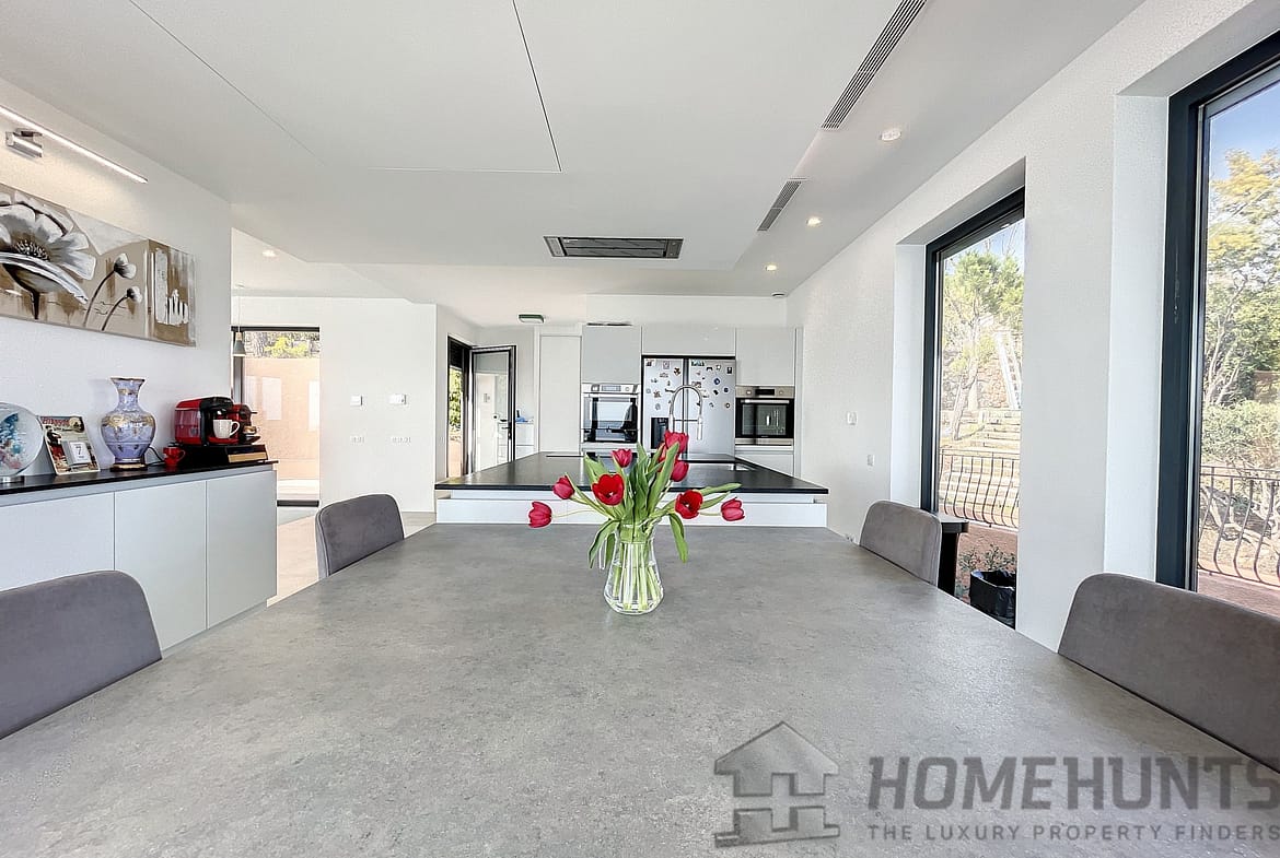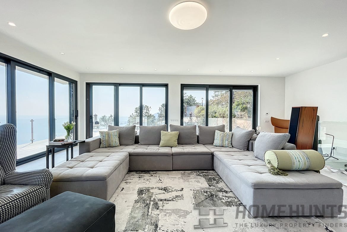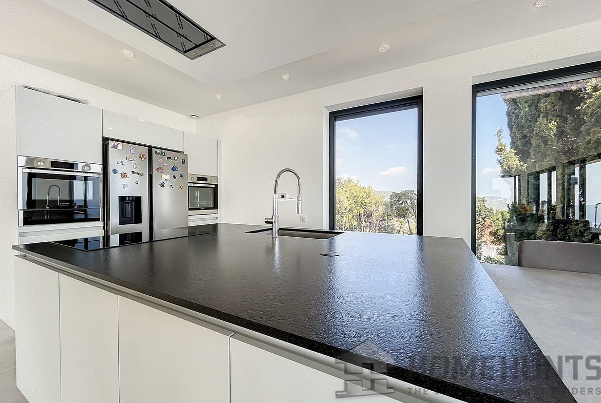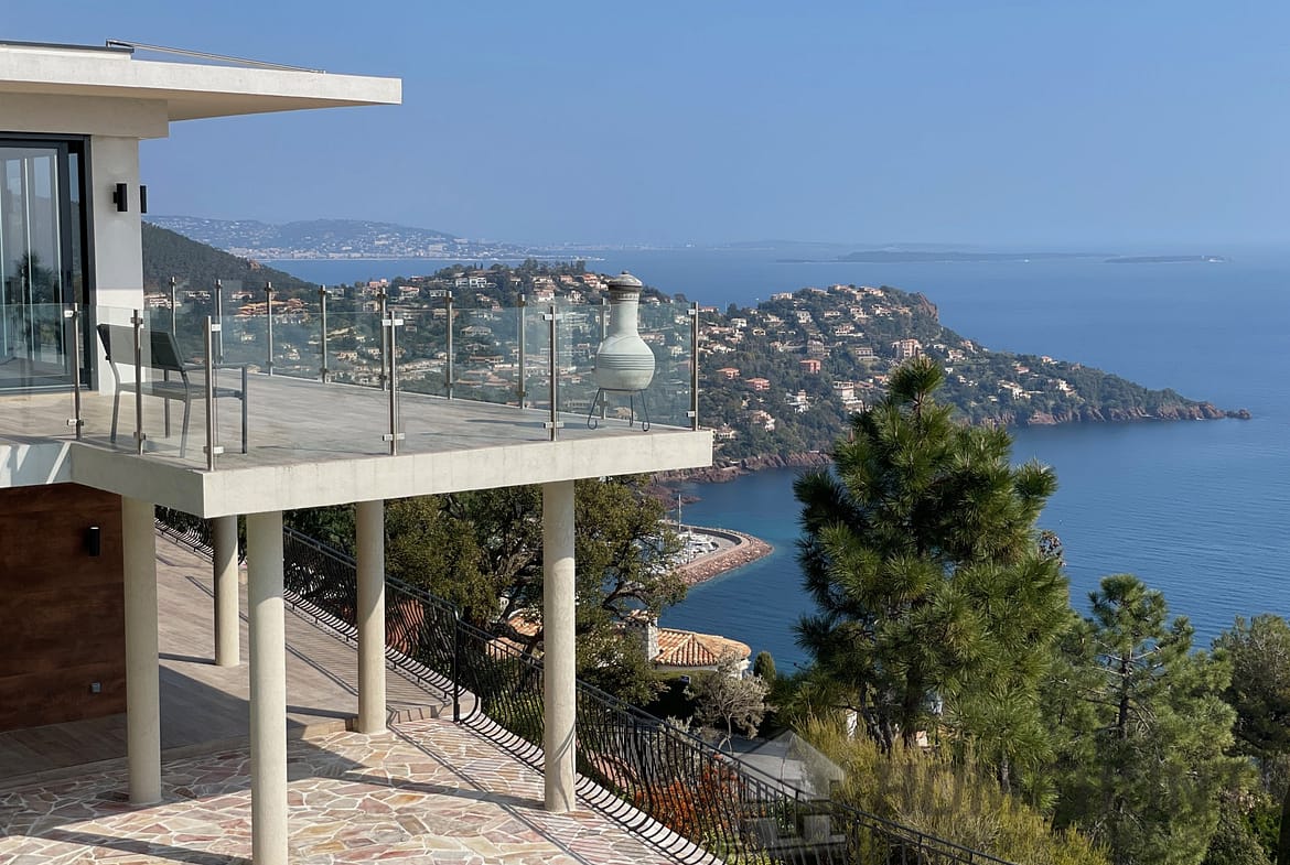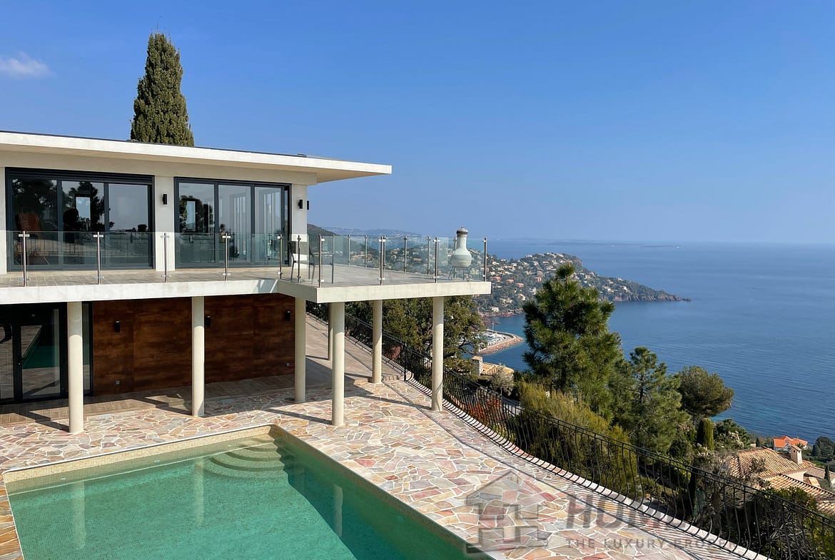 In a secured domain nestled in the Estérel mountains, only 2 minutes away from beaches and 10 minutes away from the village of Theoule-sur-Mer, lovely villa with pool renovated in a contemporary style and enjoying a breathtaking sea view over the Cannes Bay and the islands.