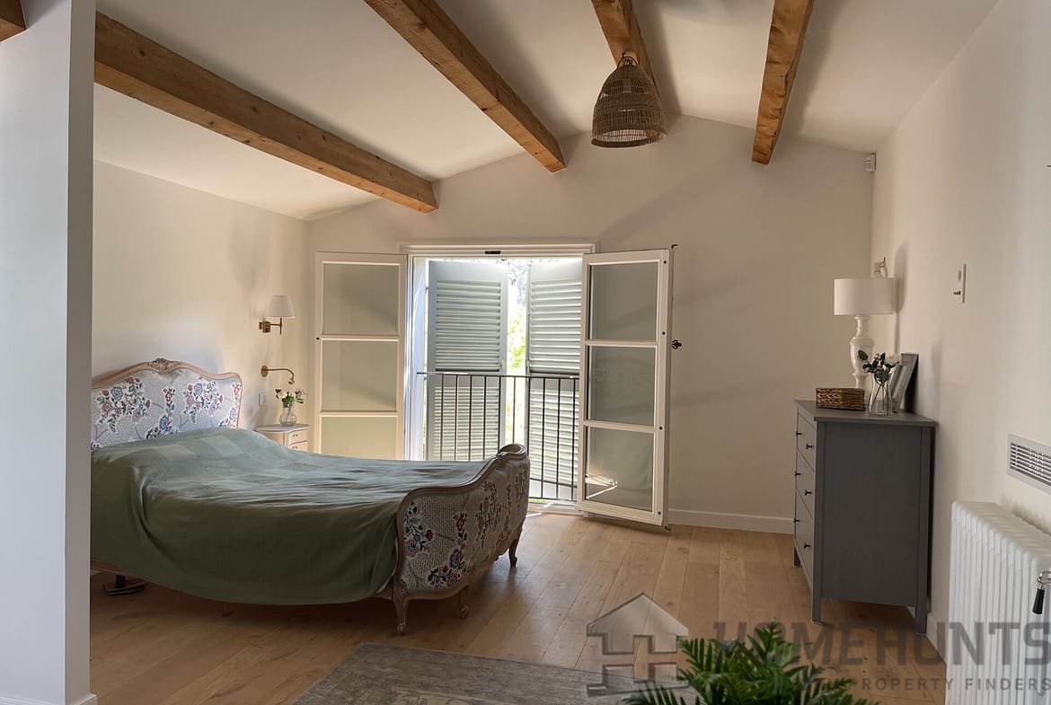 Ground floor – Large entrance hall, voluminous living room with cathedral ceilings, exposed wooden beams and open fireplace, there is also a good sized dining kitchen, both of these rooms open on to a terrace and the gardens. On this level, there are also 4 bedroom suites, all with en-suite bathrooms and direct access outside into the gardens. There is also a large laundry room and a guest WC. The entrance hall has extensive built in joinery for coats and storage.