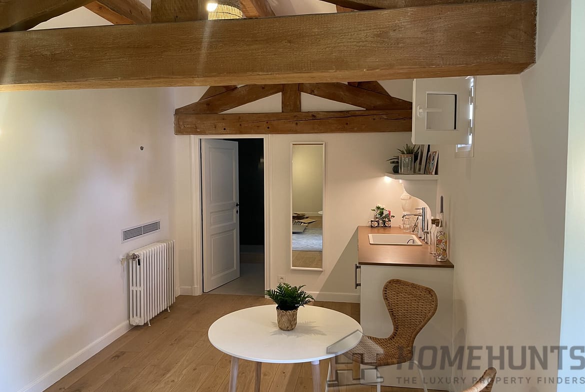On the first floor there is an independent guest apartment, also newly renovated with more than 30m2 of space and its own kitchen and shower room, with windows opening out over the gardens.