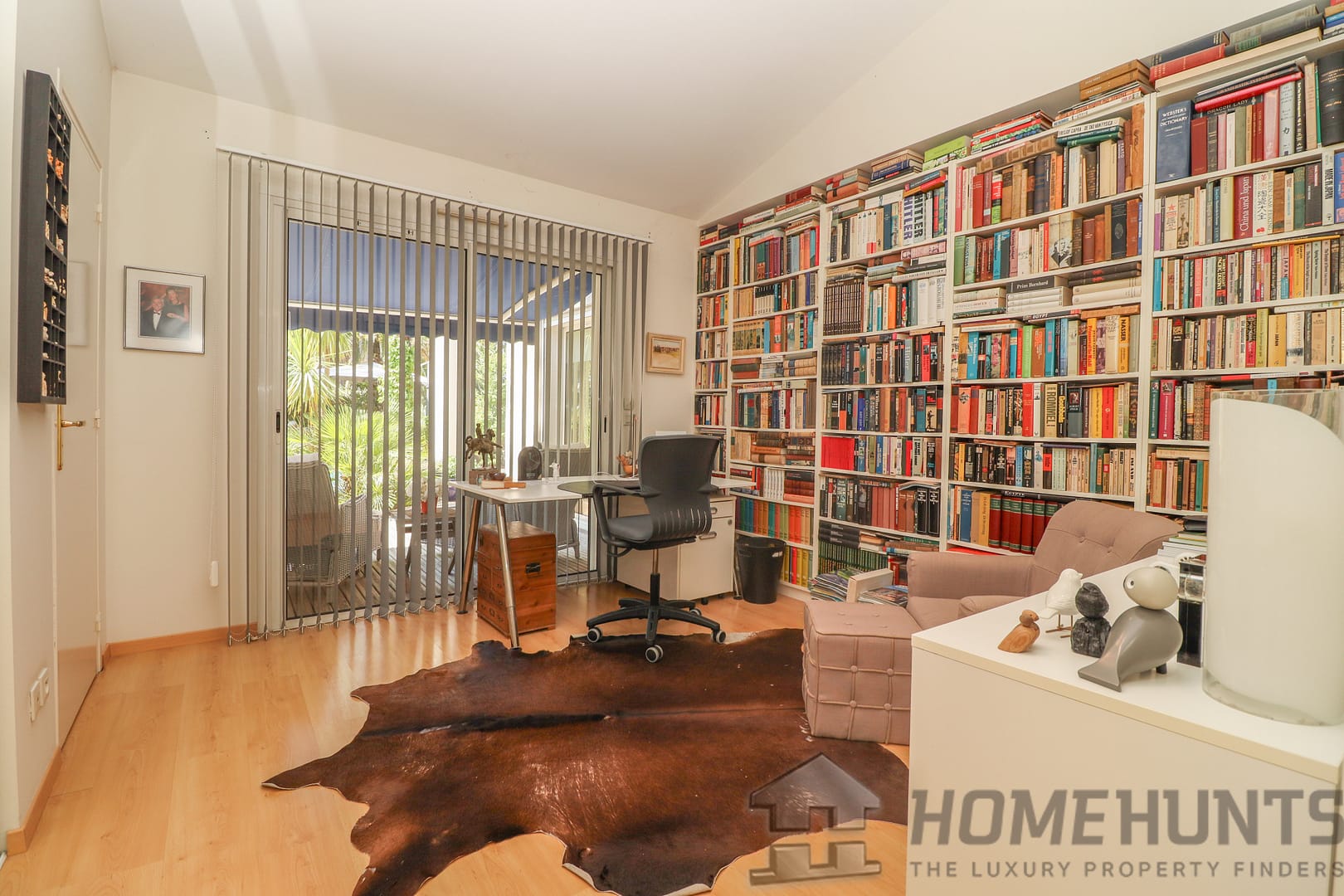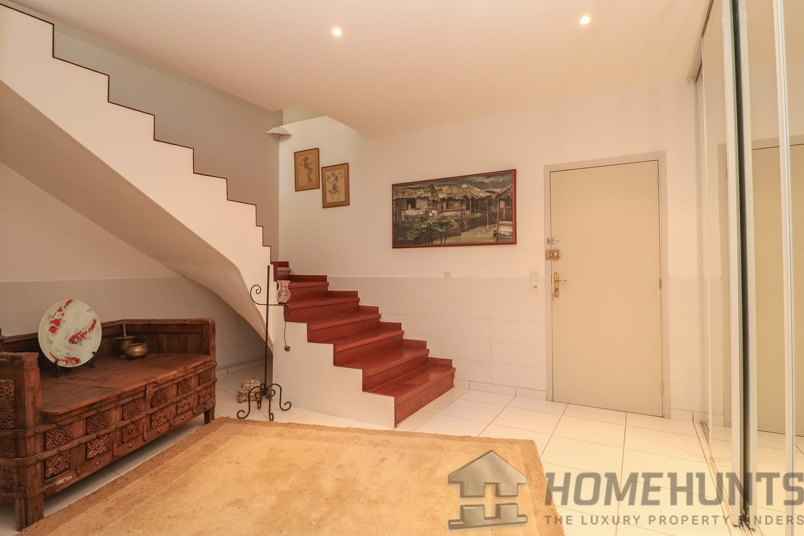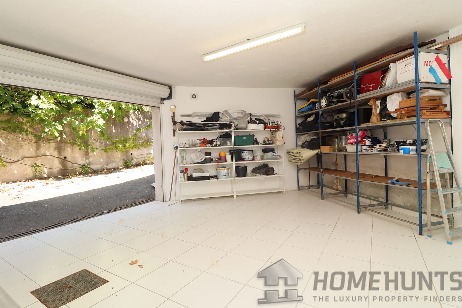 On the garden level, the property includes a spacious storage room with fitted cupboards, a laundry room, a wine cellar, a sauna with shower, the pool’s technical room, and a large garage.