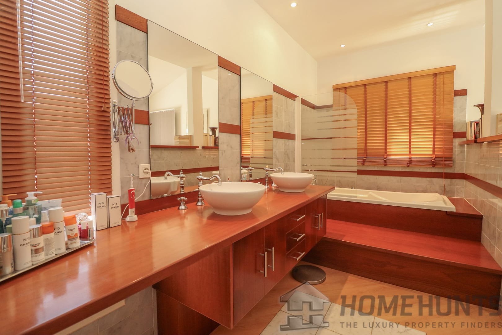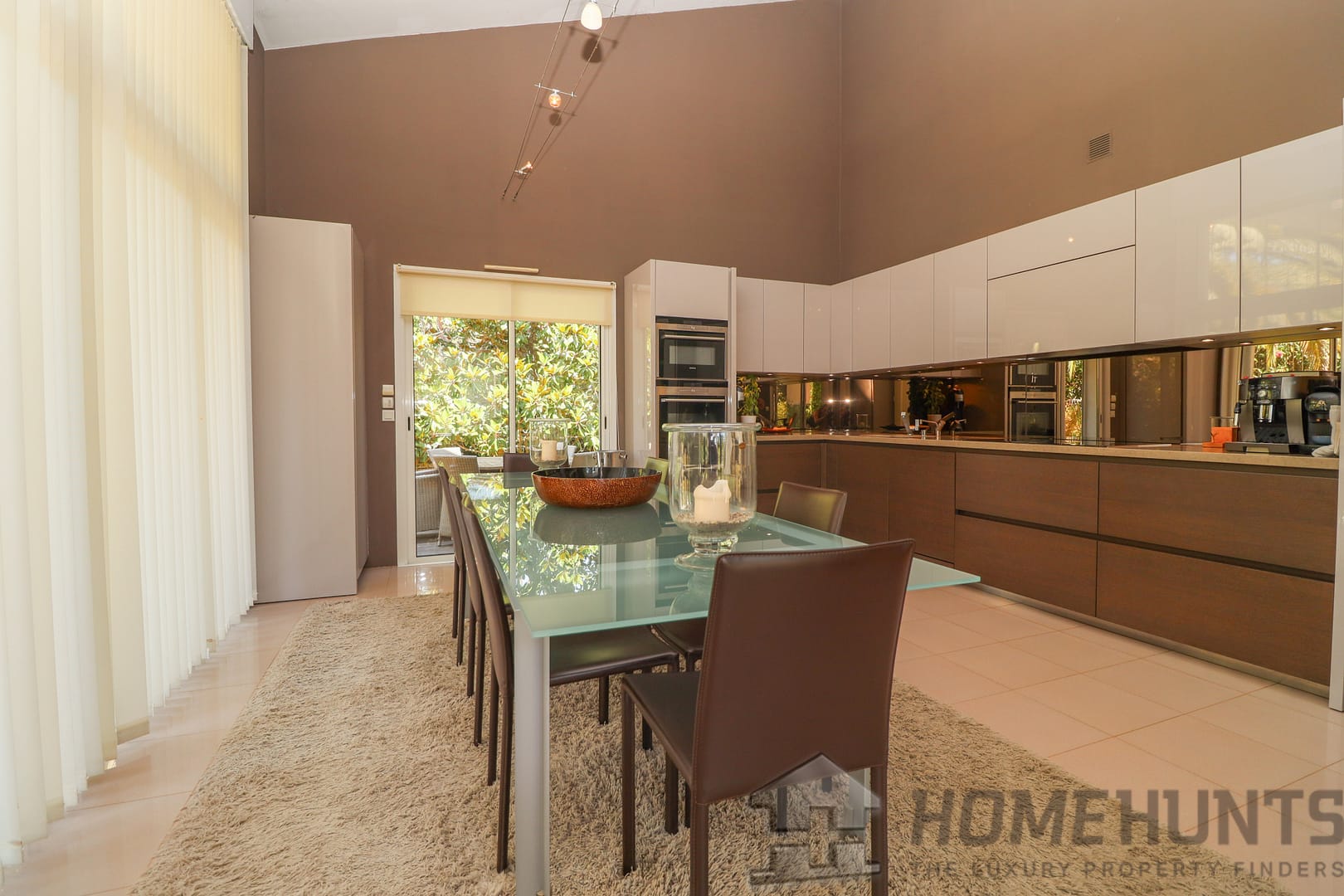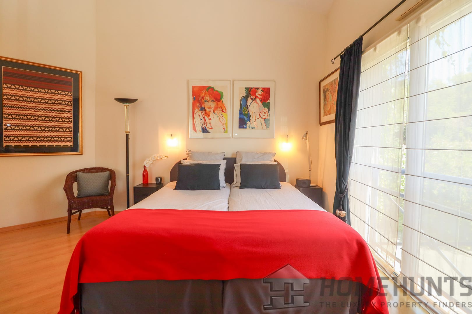 On the garden level, the property includes a spacious storage room with fitted cupboards, a laundry room, a wine cellar, a sauna with shower, the pool’s technical room, and a large garage.