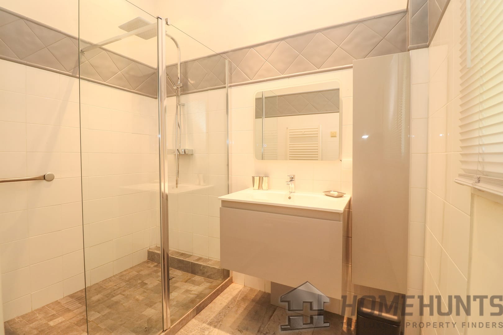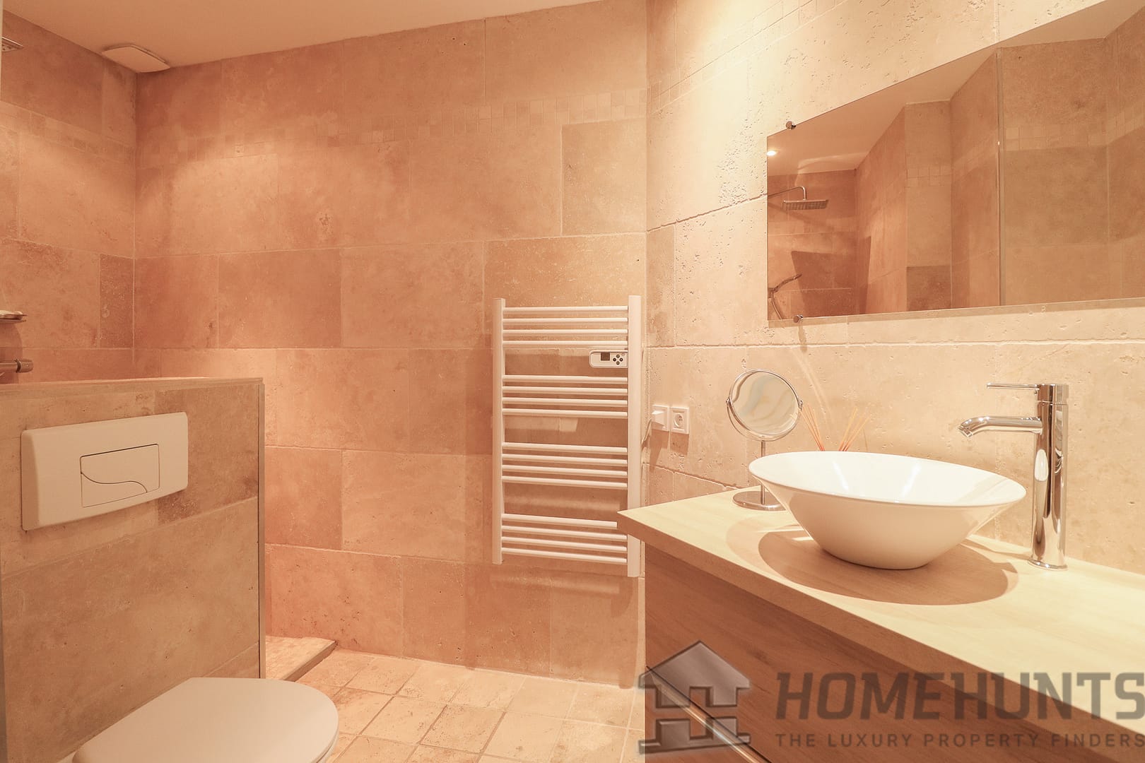 On the ground floor, you’ll find a master suite with bathroom (jacuzzi) and separate WC, as well as two additional bedrooms, each with its own shower room and WC. All bedrooms have built-in wardrobes and direct access to the outside.