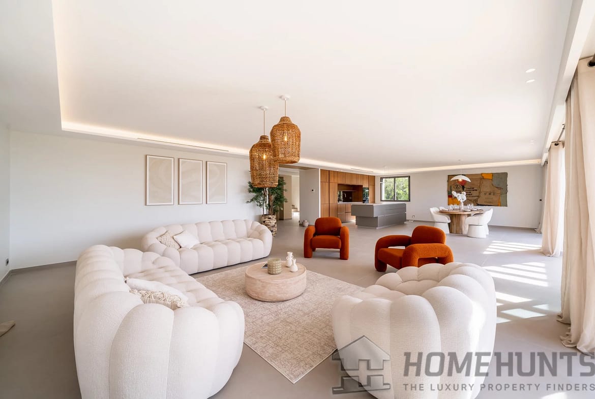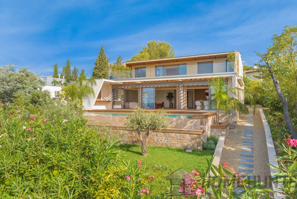 With a living area of approximately 265 m2, it comprises on the ground floor an entrance hall with cloakroom and guest WC, a large living room with open-plan kitchen of over 100 m2, all opening onto a terrace with infinity pool and sea view. Two en-suite bedrooms and a laundry room complete this level.