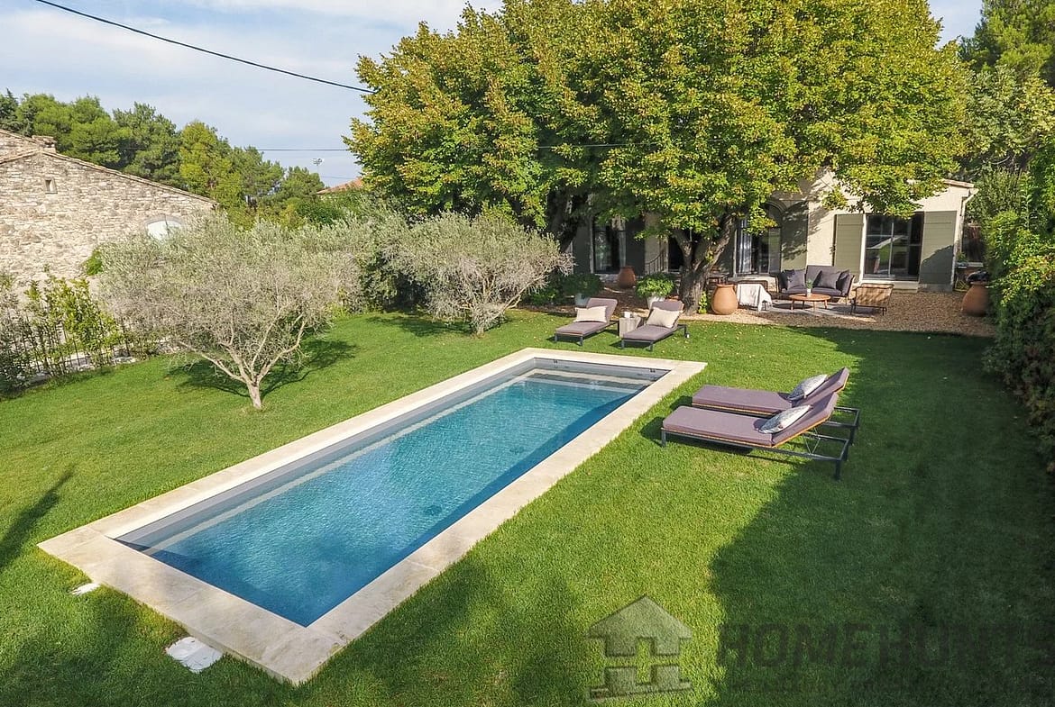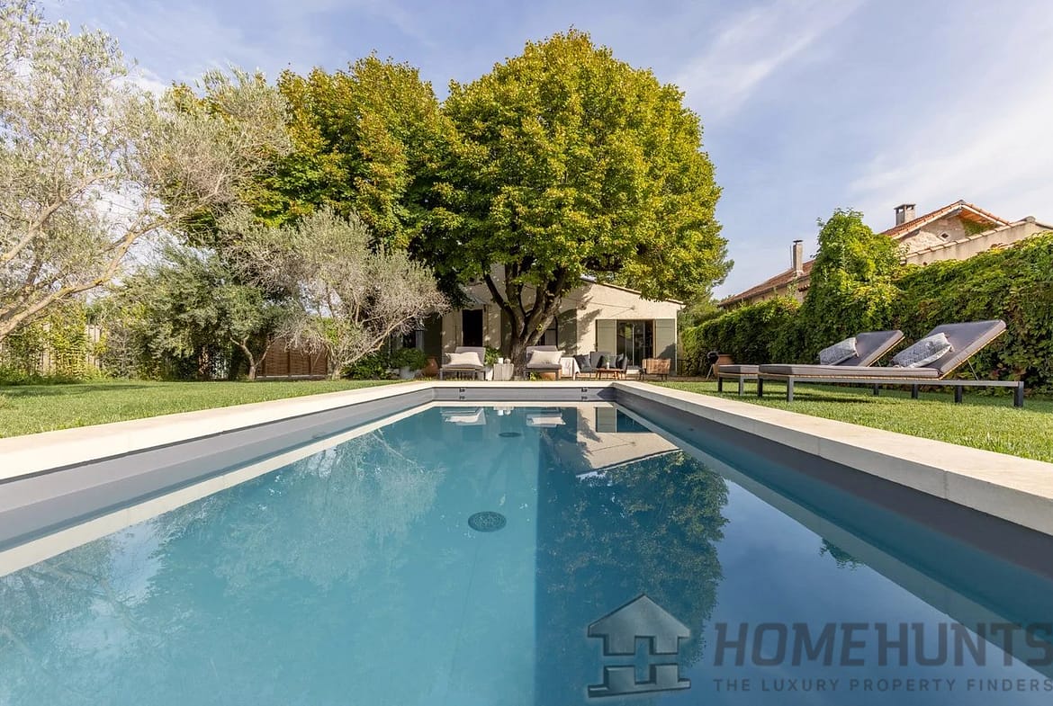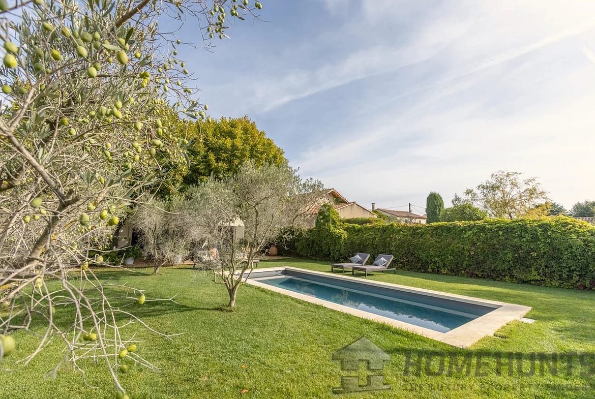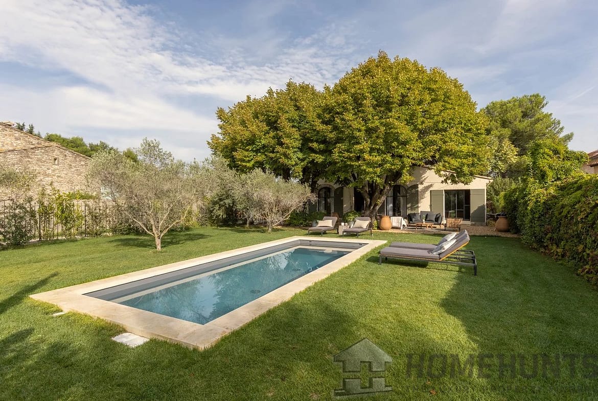 Just a few steps from the center of Saint-Remy, this villa of approximately 100 m2 (1,000 square feet) offers an intimate and refined setting in the heart of a 600 m2 (6,400 square foot) enclosed landscaped garden adorned with a pool.
