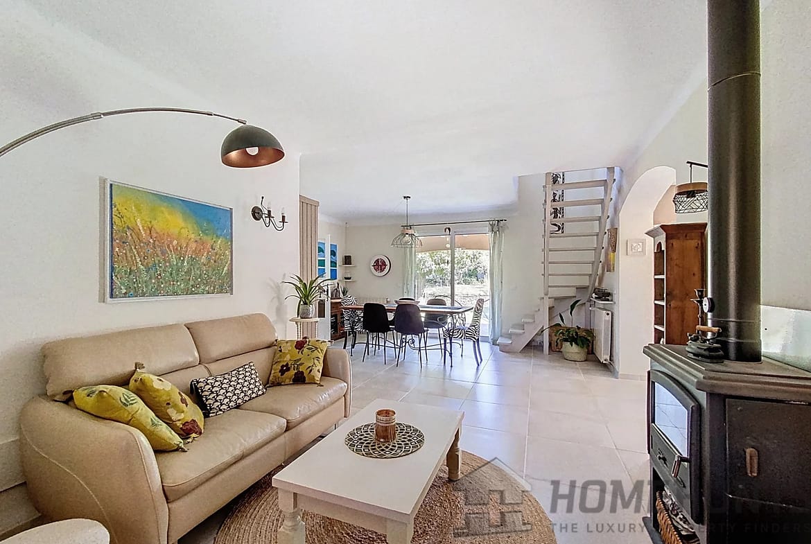 The interior comprises a bedroom on the ground floor with en-suite bathroom, three bedrooms, a second shower room, a double living room, a living room with dining area, and an open-plan kitchen. A fireplace with a stove creates a warm atmosphere in the heart of the living areas, which open onto the garden.