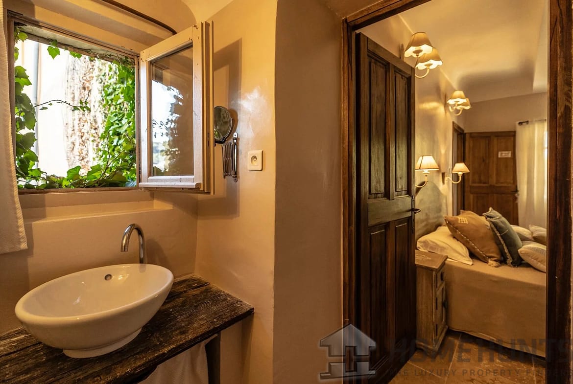 The exterior offers an idyllic setting with a 12×5 m swimming pool, a dry stone pool house, olive trees, fruit trees, lavender, a petanque court, a panoramic terrace and an authentic cobbled path.