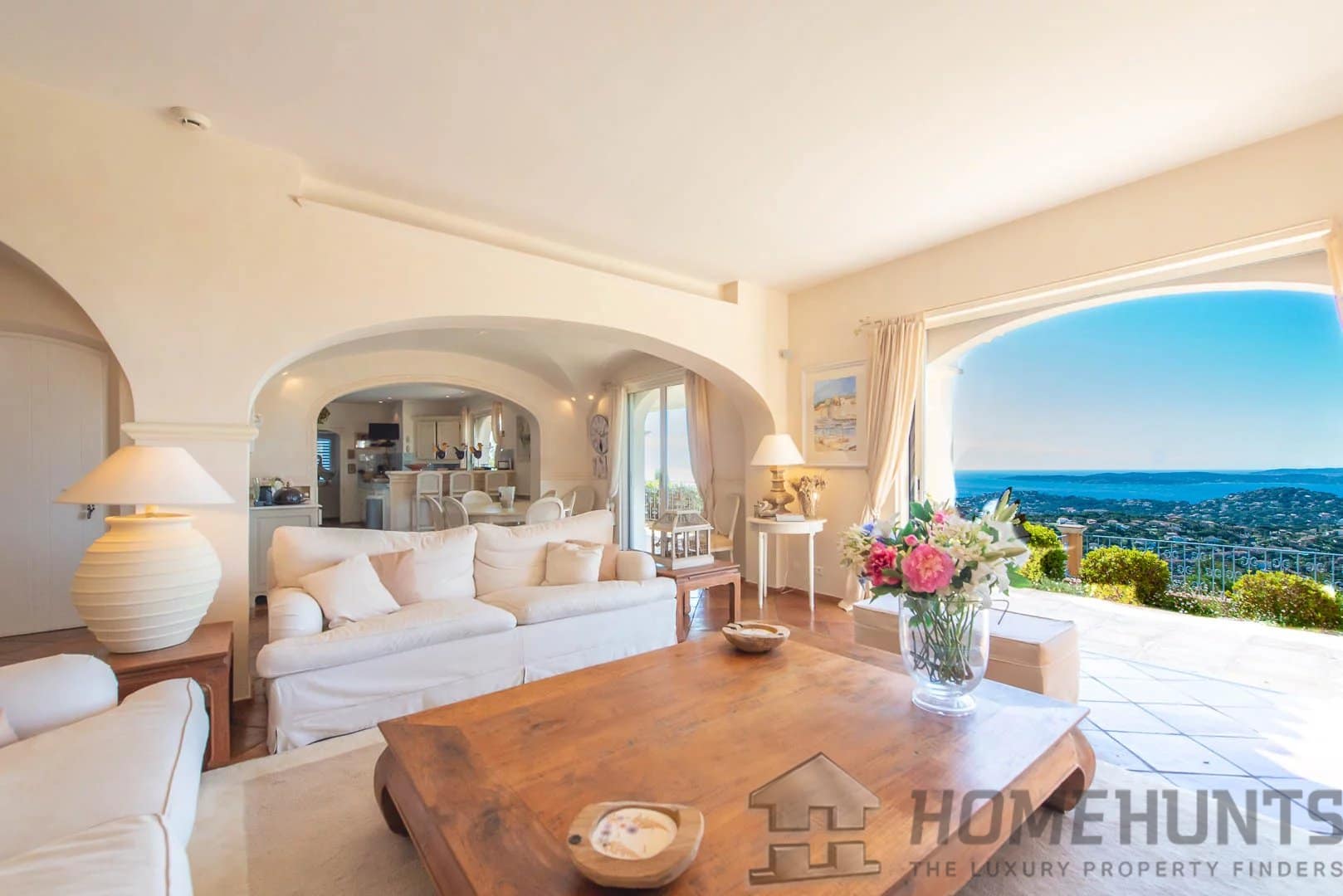 Upstairs: the master suite with living room, bathroom/shower, toilet and large terrace with sea view and the entire bay of Saint-Tropez.