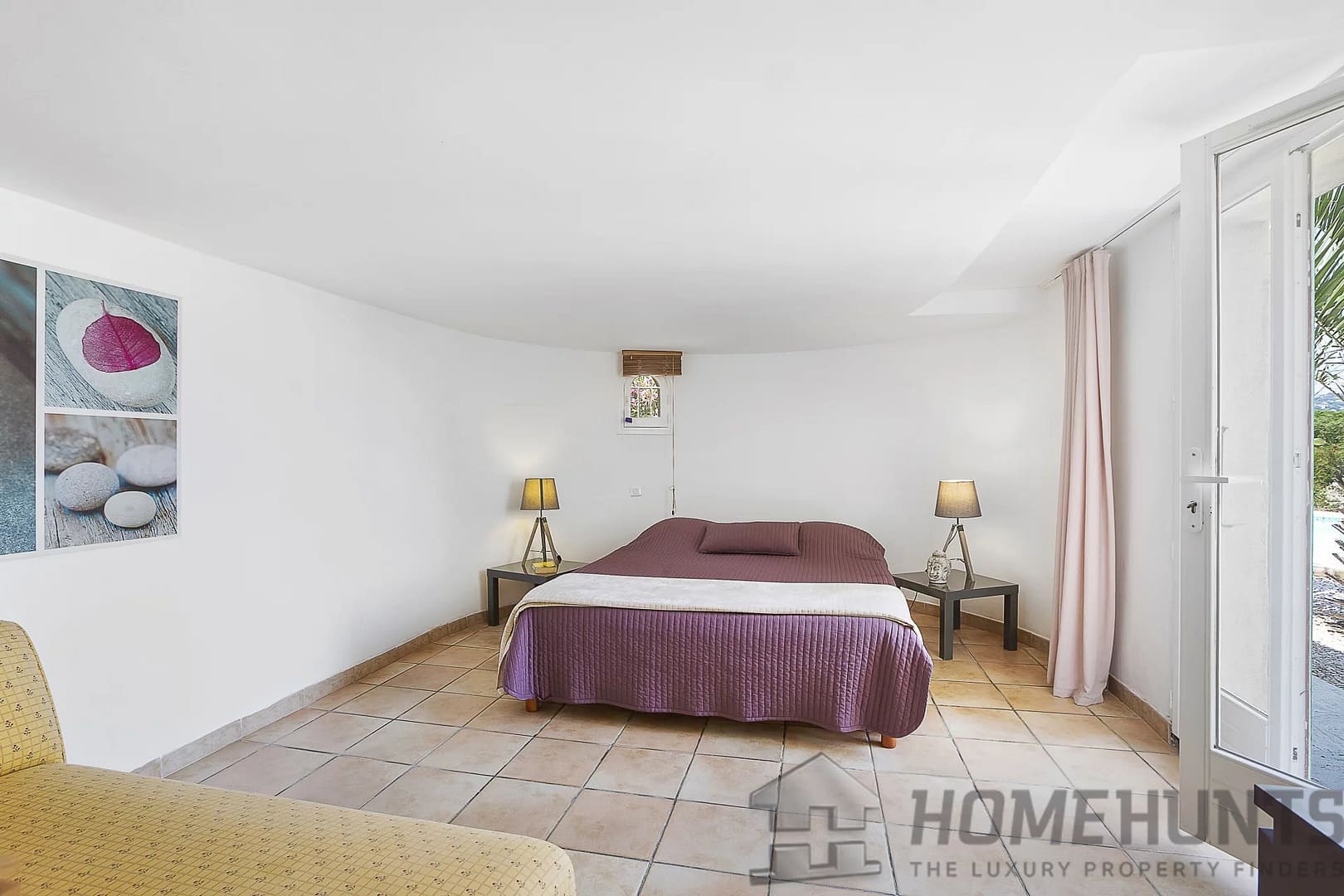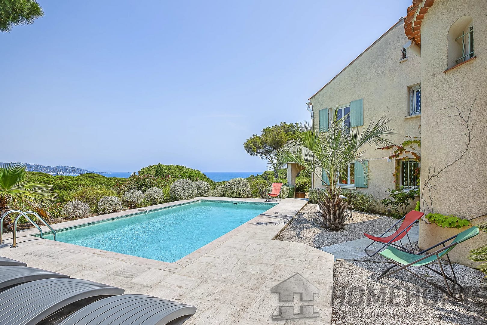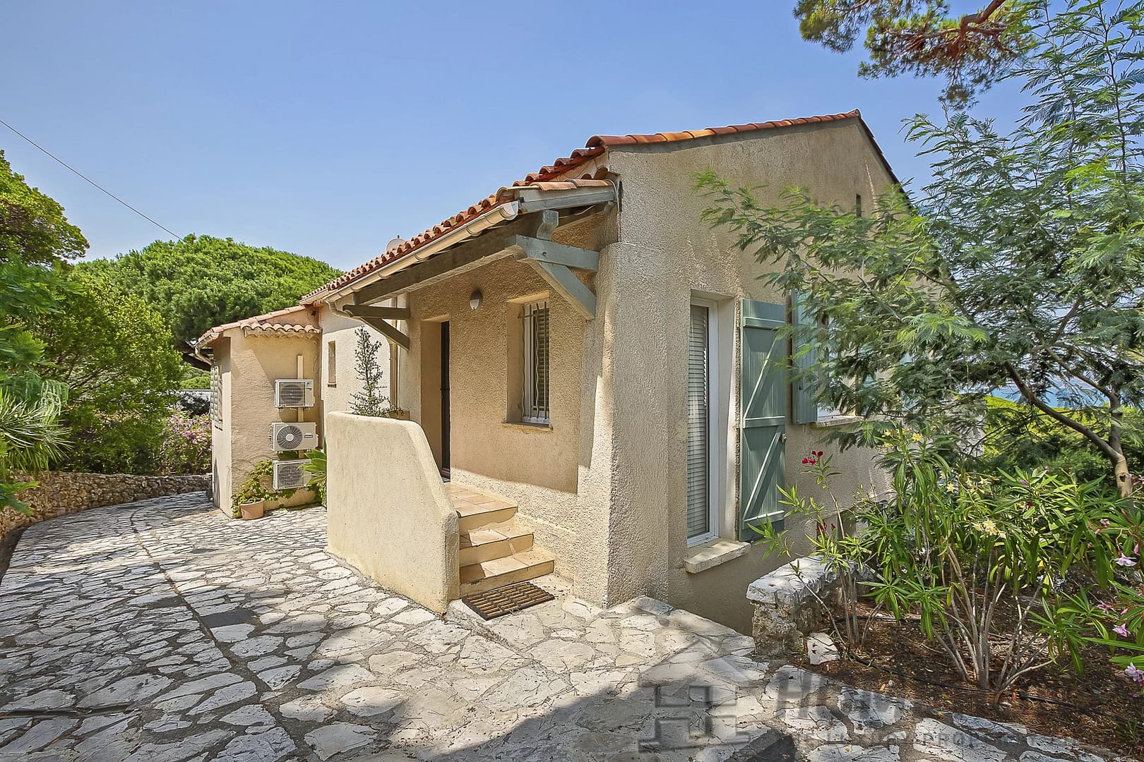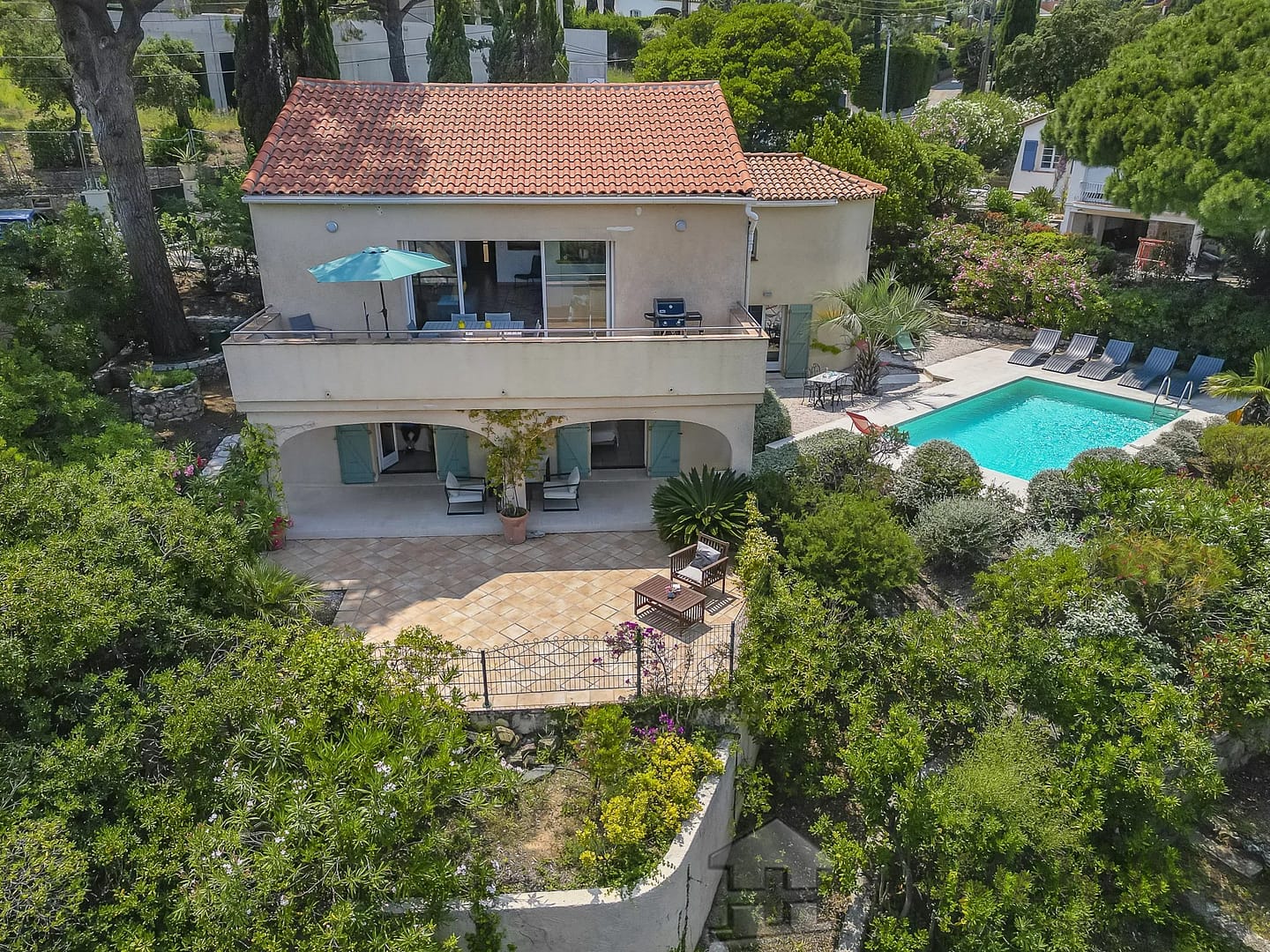 The lower level includes three bedrooms, all with exits to the garden, bathroom with toilet, shower room with toilet, guest toilet, laundry room, as well as a covered terrace with beautiful views of the Esterel Mountain Range and the sea.
