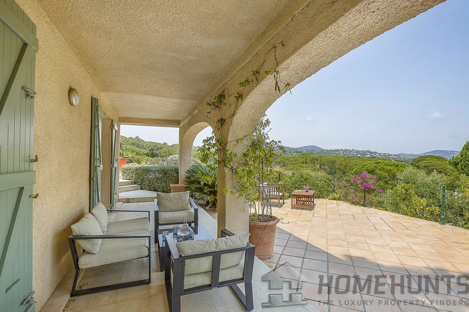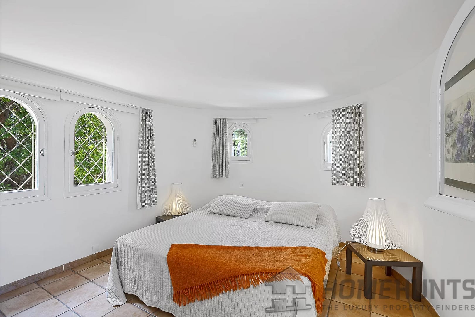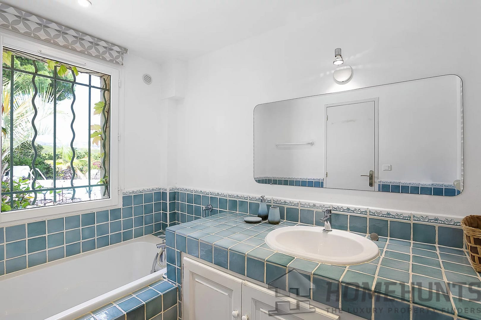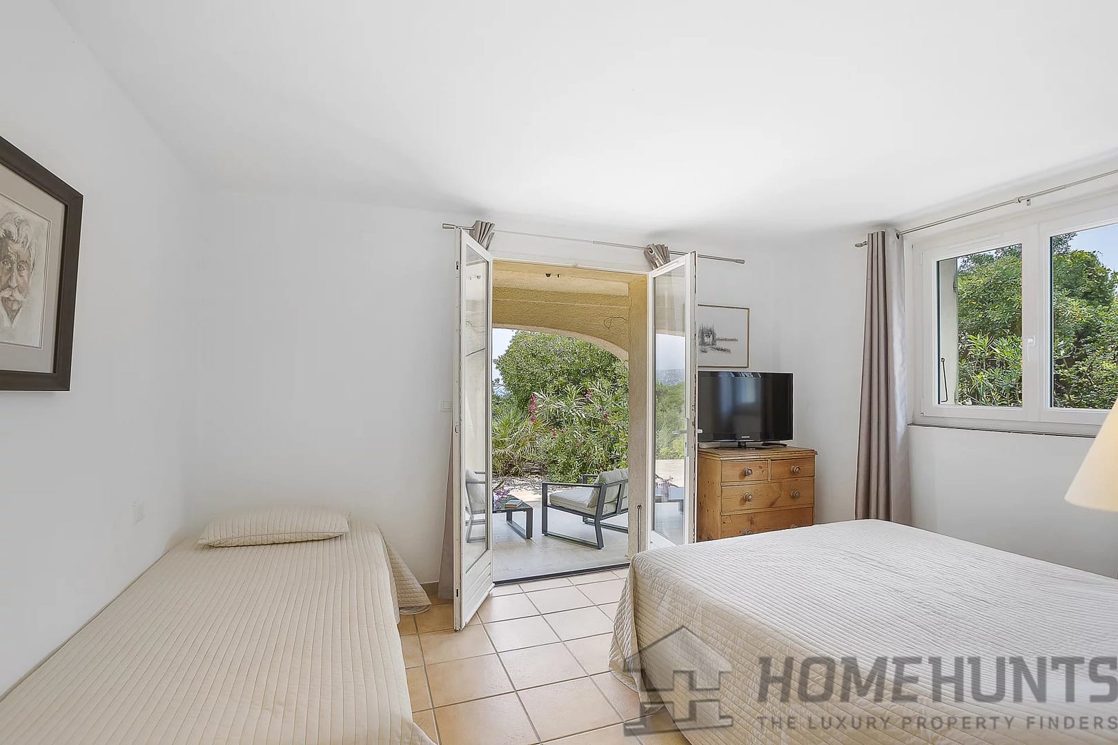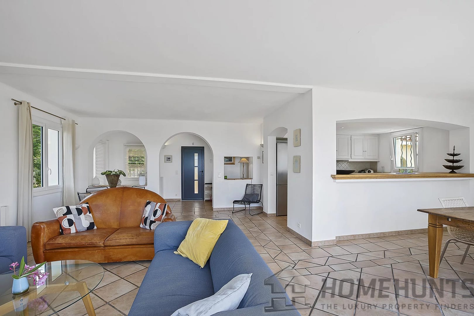 The lower level includes three bedrooms, all with exits to the garden, bathroom with toilet, shower room with toilet, guest toilet, laundry room, as well as a covered terrace with beautiful views of the Esterel Mountain Range and the sea.