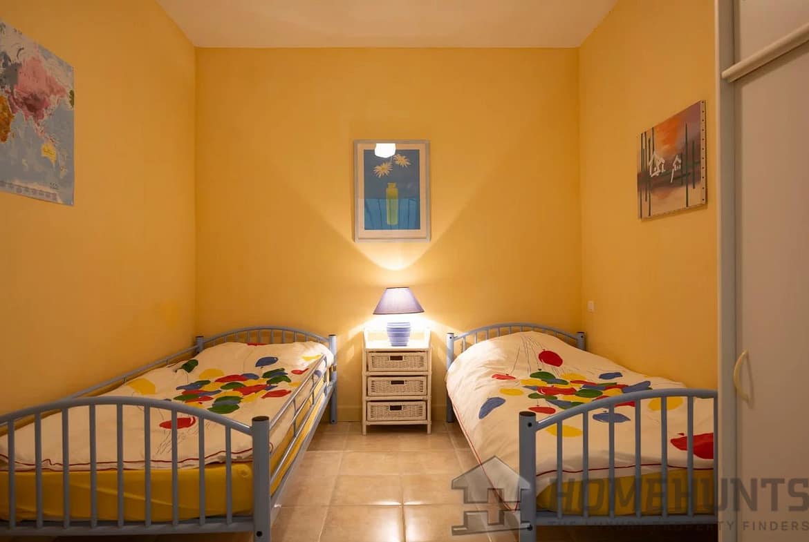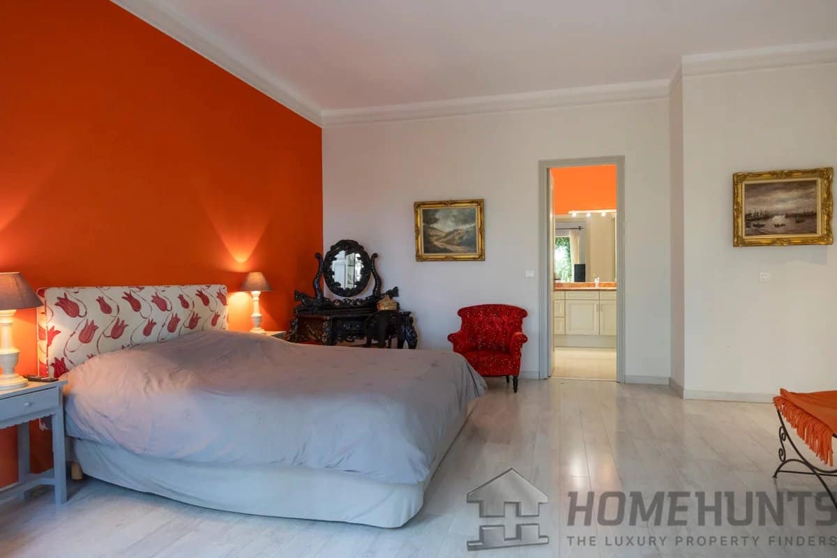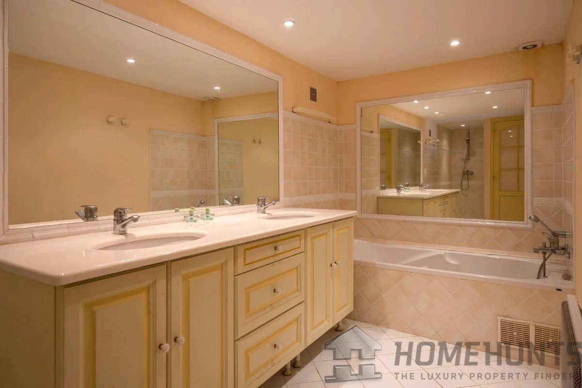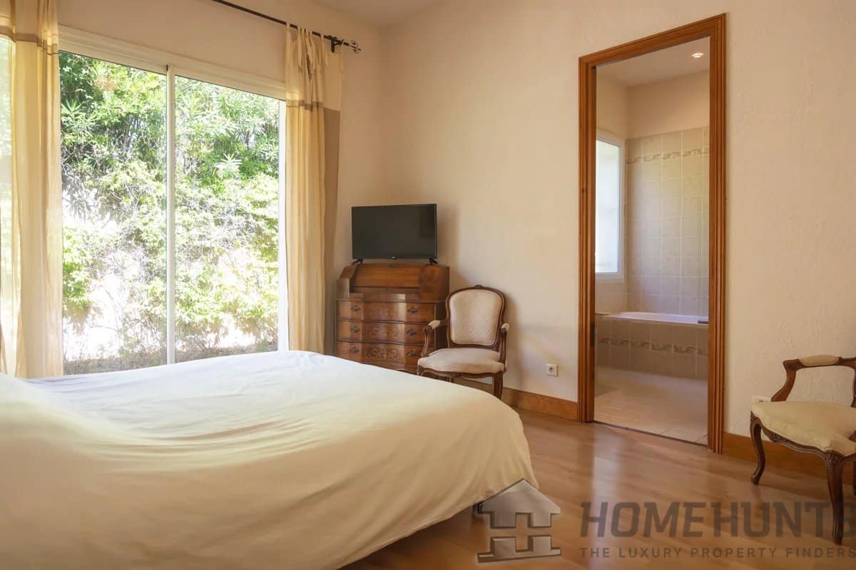The villa (272 m2 + 200 m2) built in 2000 is set in 3,000 m2 of grounds. On the main level, you’ll find a bright, spacious living/dining room with open kitchen, study, guest toilet, master suite with en suite bathroom, and a spacious bedroom with en suite bathroom. A separate bedroom with en suite bathroom is also available, ideal for an au pair, for example.