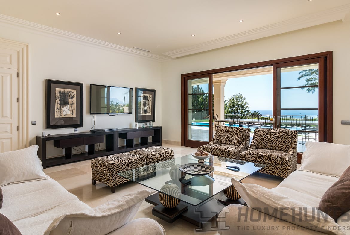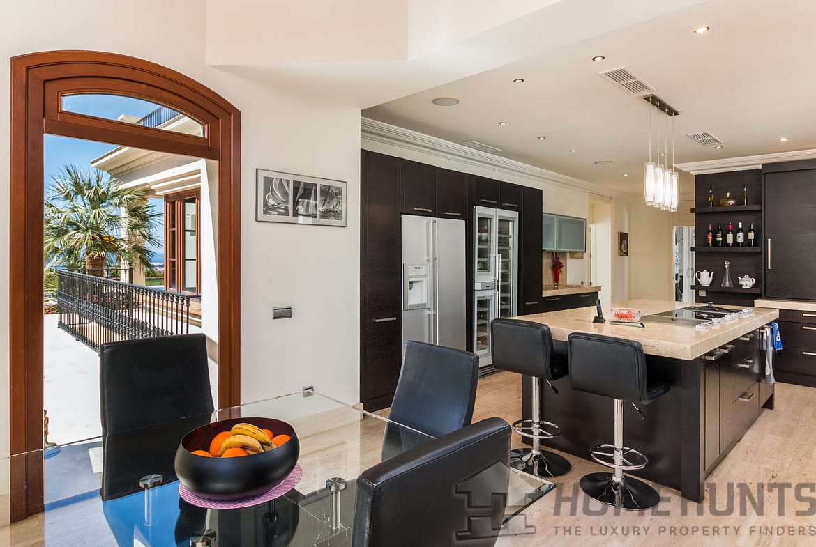 The bright and airy open space leads you to the large salon surrounded by glass windows and doors allowing the views of the sea to be seen from every angle.