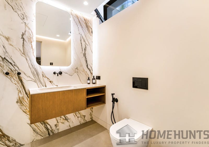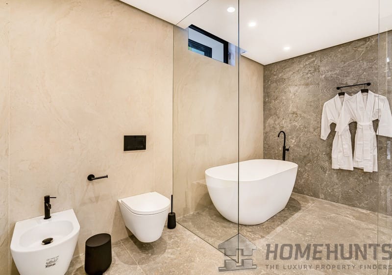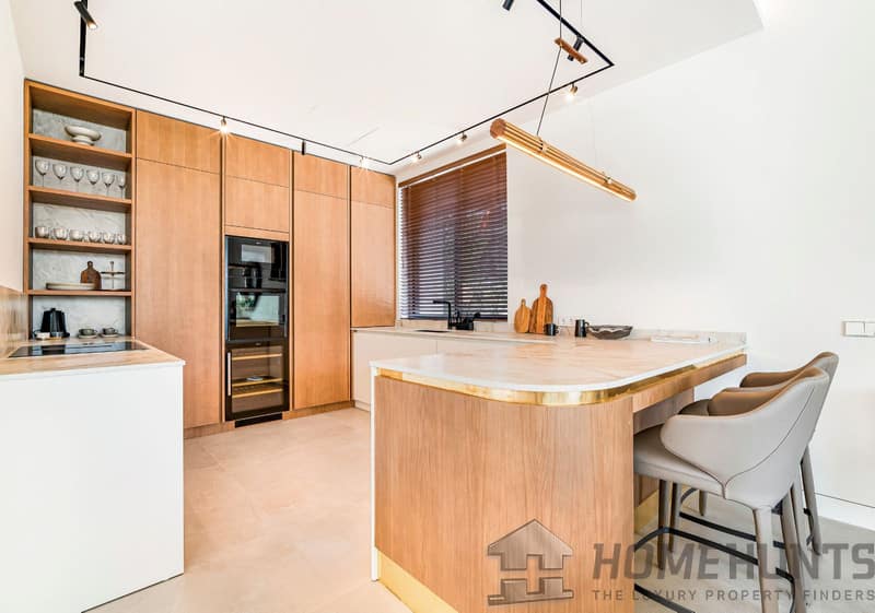 On the main level, a spacious living area divided into sitting and dining spaces creates a perfect setting for family life and entertaining. The open-plan kitchen, fully equipped with state-of-the-art appliances and stylish finishes, complements the villa’s modern design. Also on this level, a bedroom with an en-suite bathroom and a guest toilet provide convenience and privacy.