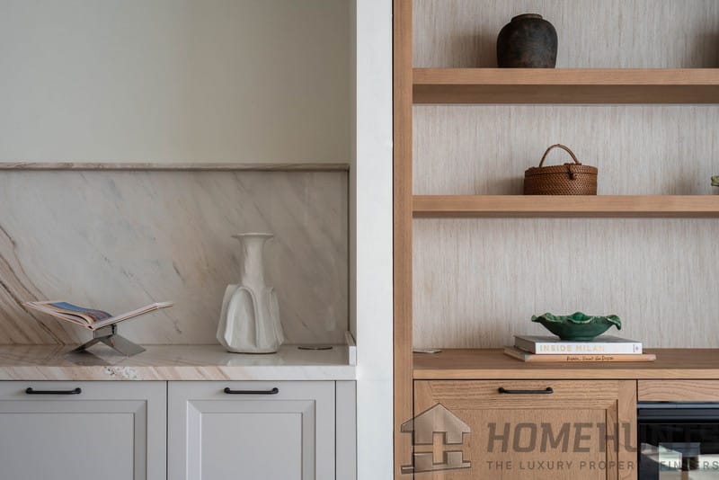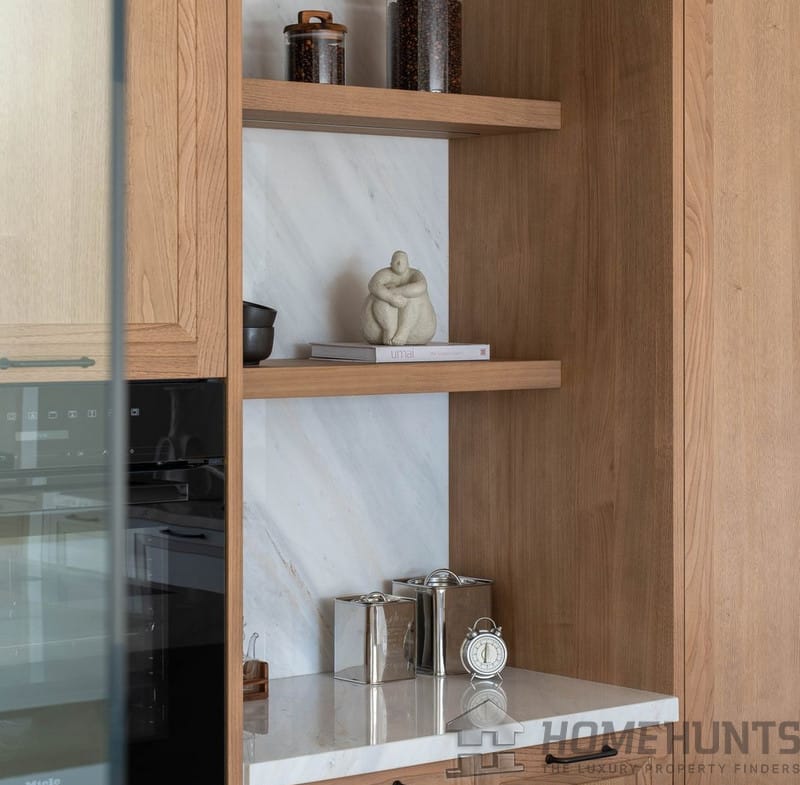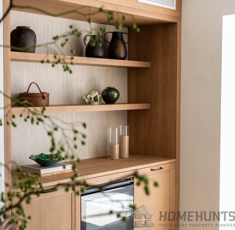 The entrance level welcomes you with natural light and an open layout uniting the living room, dining area, and social kitchen. Large sliding doors open to a private garden designed for outdoor living, featuring a heated pool, summer kitchen, and lounge and dining areas – your own secluded retreat by the sea. A guest suite with en suite bathroom and a guest toilet complete this level.