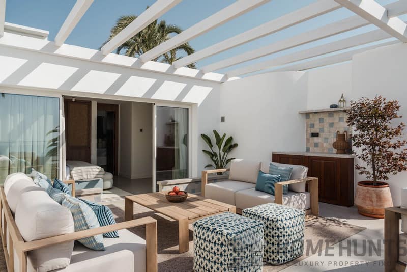 Upstairs you’ll find two more bedroom suites, both with panoramic sea views. The principal suite offers a Mediterranean ambiance with en suite bathroom and a chic walk-in closet, while the second suite opens onto a spacious terrace with lounge and wet bar – the perfect setting to enjoy Marbella’s sunsets. With direct access from the community to the beachfront promenade, you can stroll to Puente Romano, Marbella Club, or even Puerto Banús. Fine dining, beach clubs, and world-class amenities are all within walking distance.