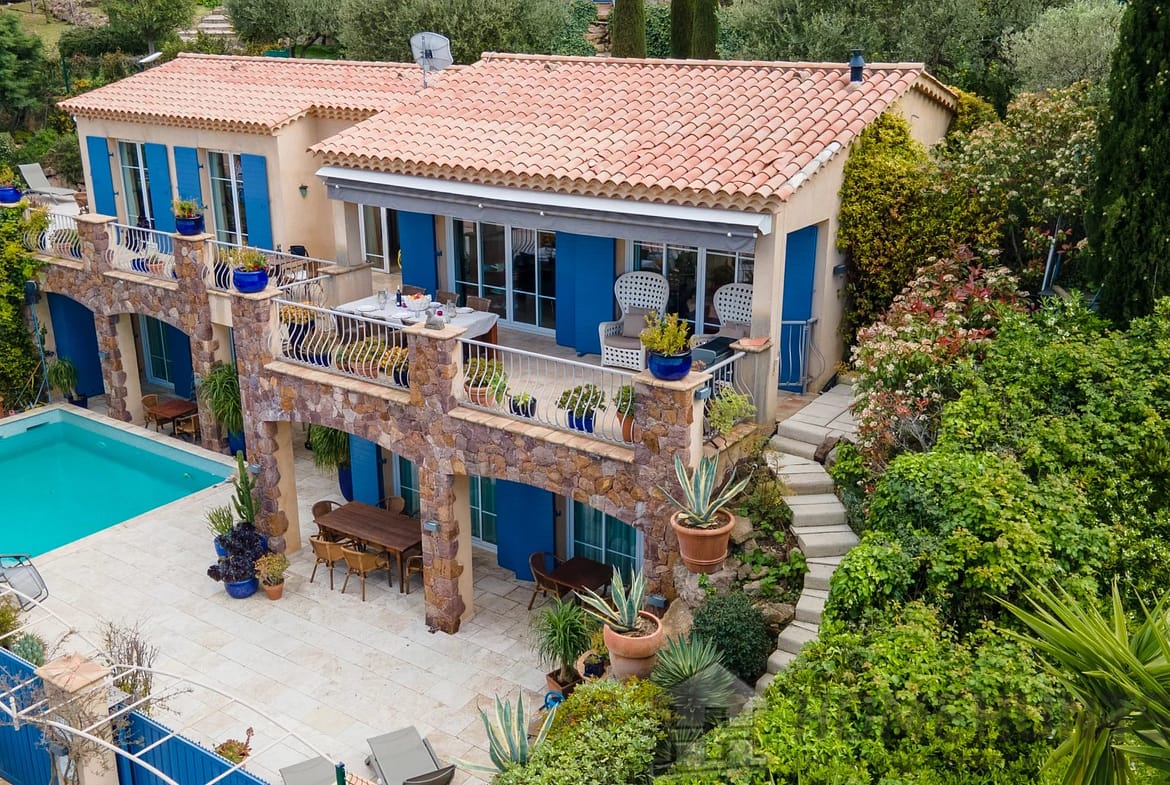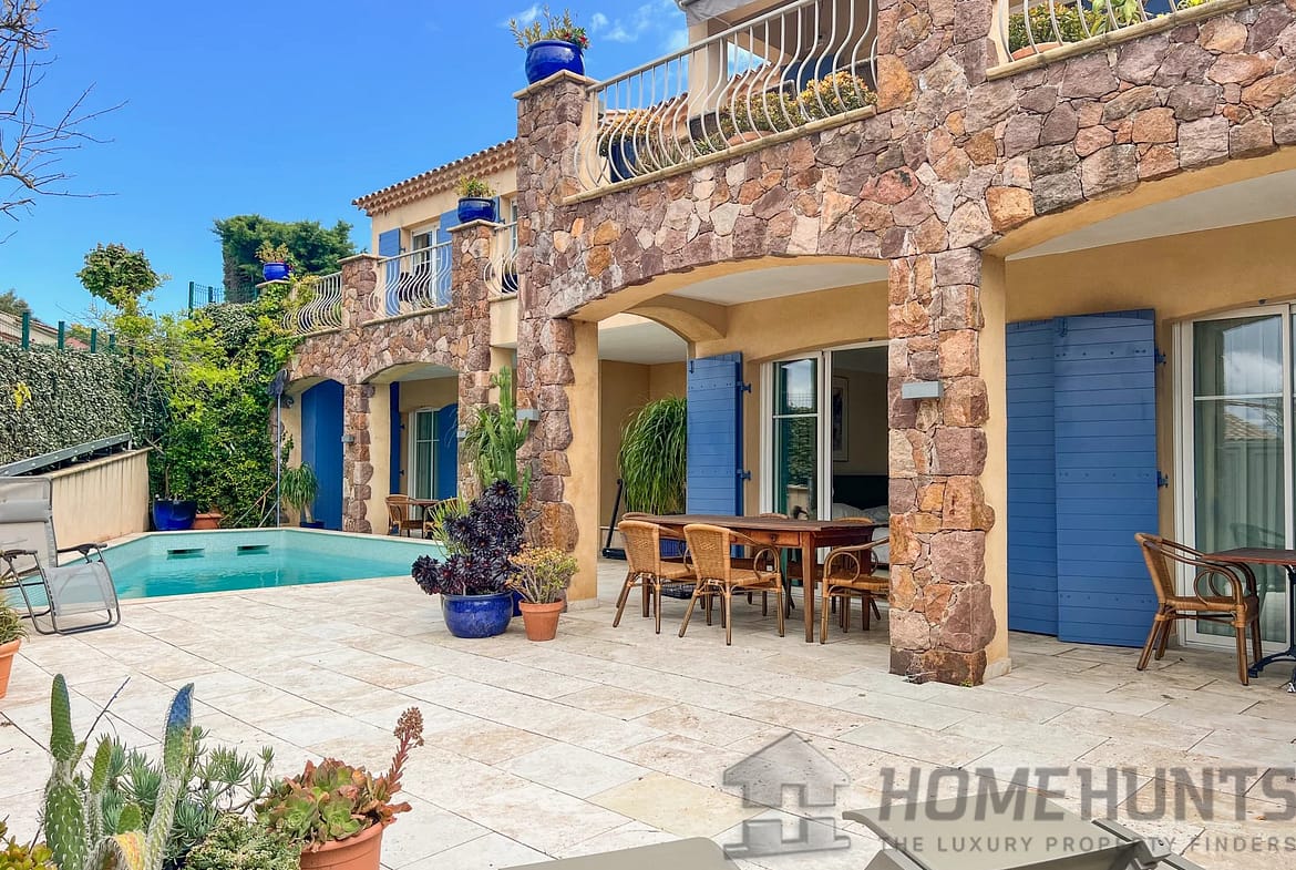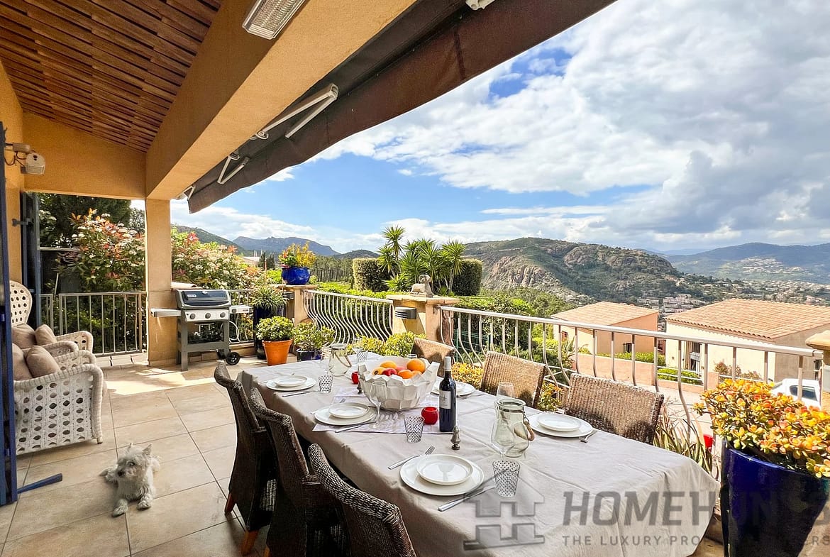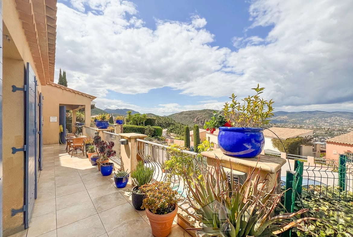 A few minutes from the village of Theoule-sur-Mer, enjoying a view of the bay of Cannes and the Esterel, charming 221 m2 family sized villa with superb swimming pool and open views.