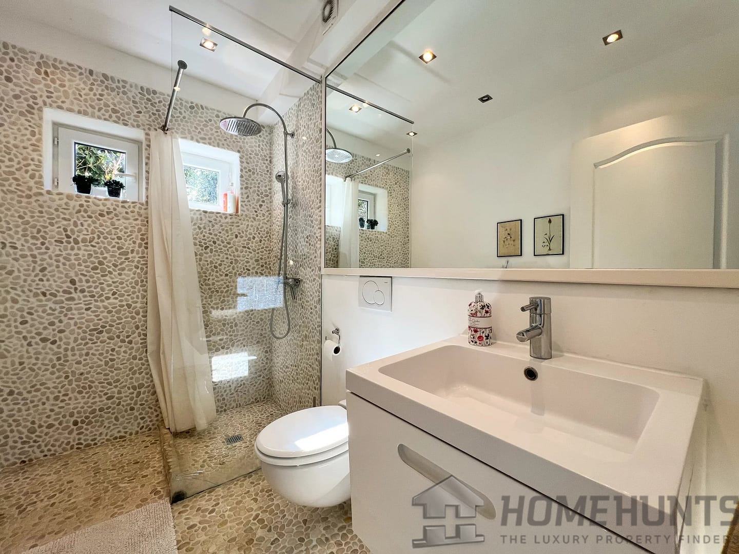 – The middle level offers flexibility with three additional bedrooms, two shower rooms, a secondary living area, and a kitchenette—ideal for guests or independent family use.