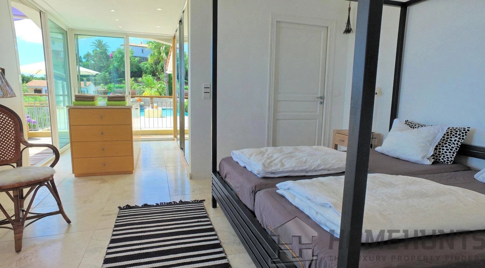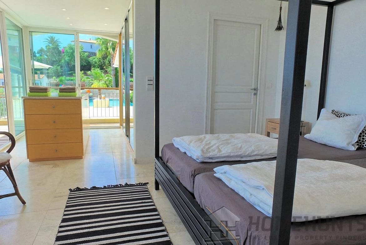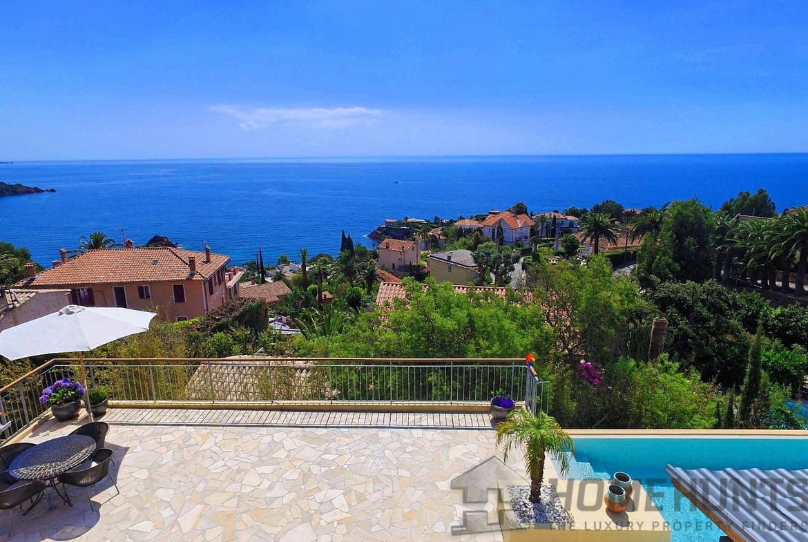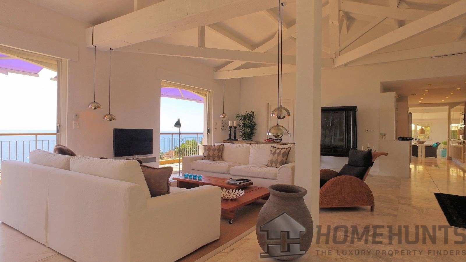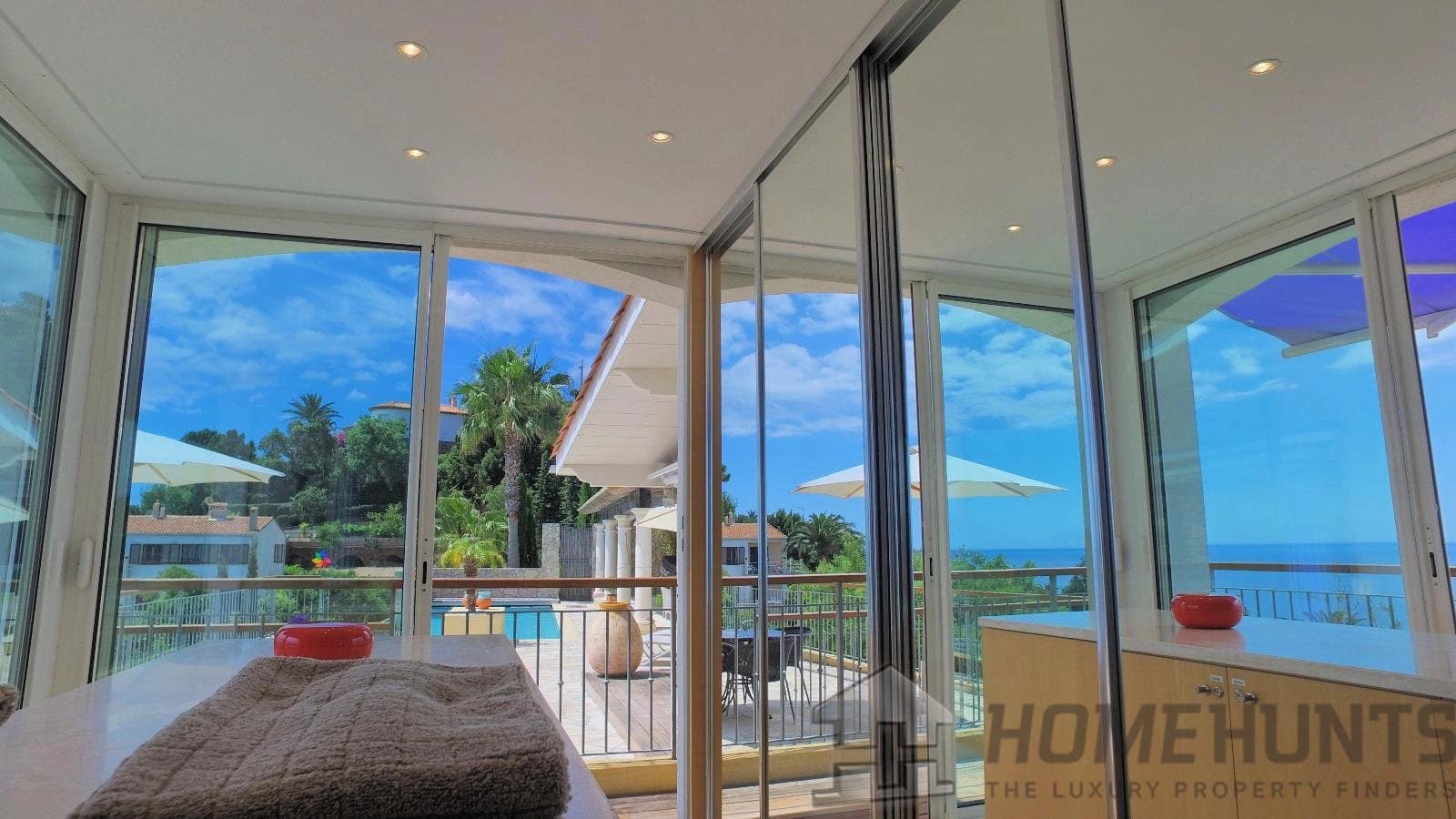The villa boasts a truly panoramic sea view stretching all the way to the Lerins Islands, visible from the main living areas, the terraces, and the infinity pool.