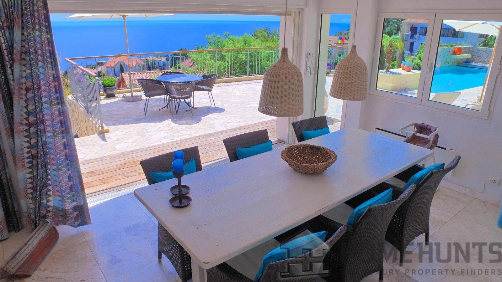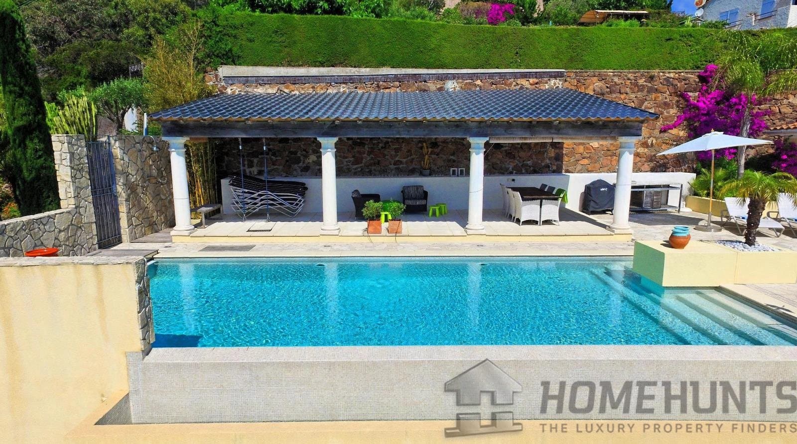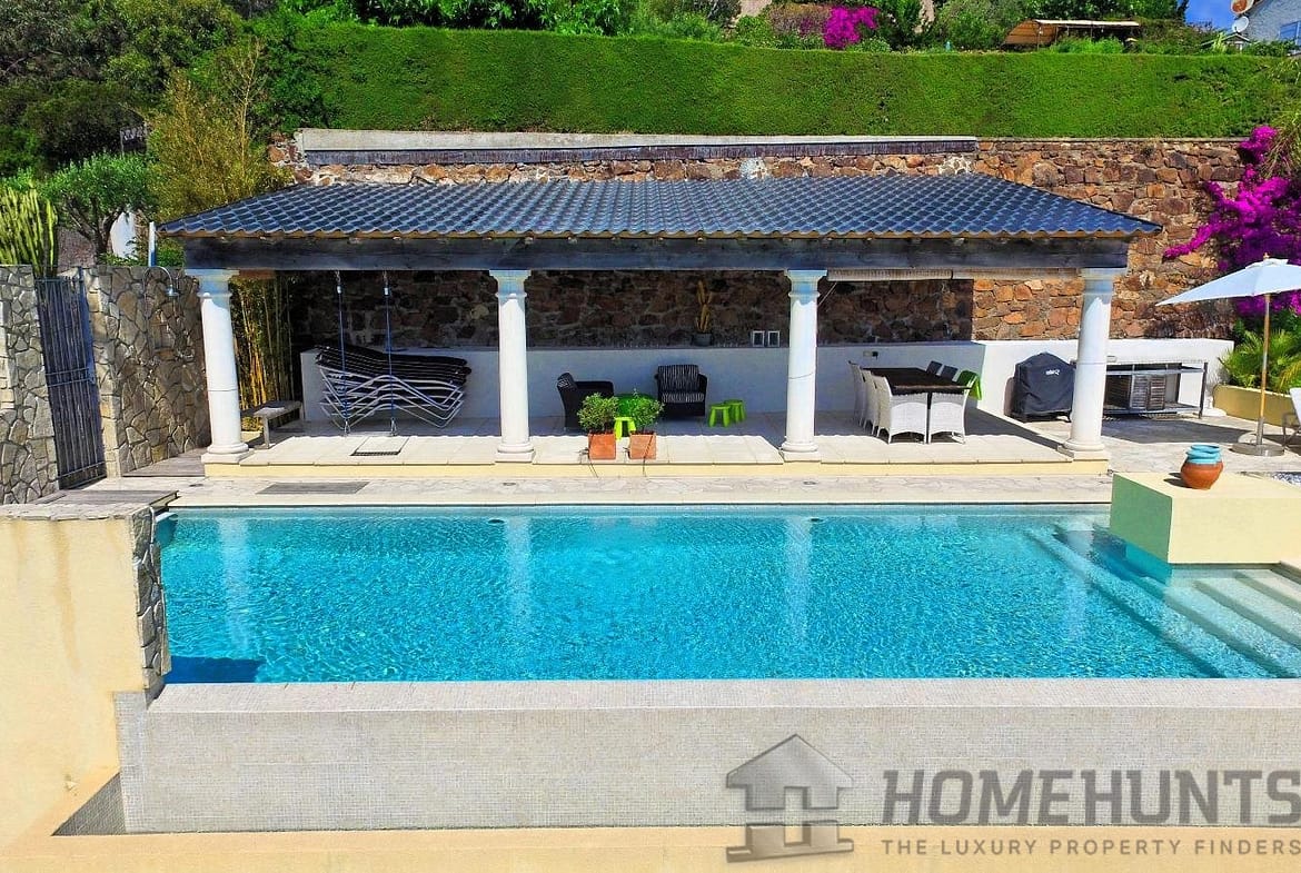 The outdoor area is designed for relaxed Riviera living, offering a covered poolside lounge, a summer kitchen, and direct access to the infinity pool overlooking the sea.