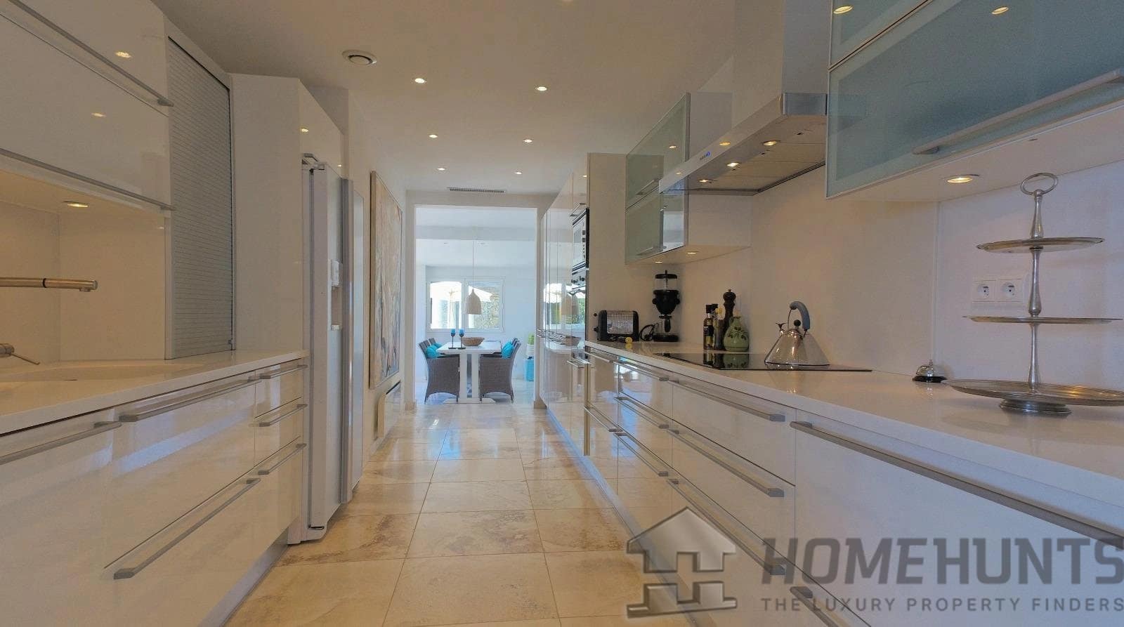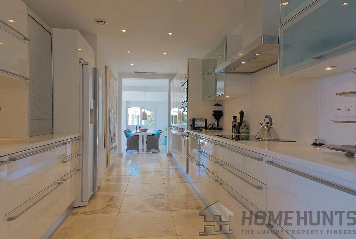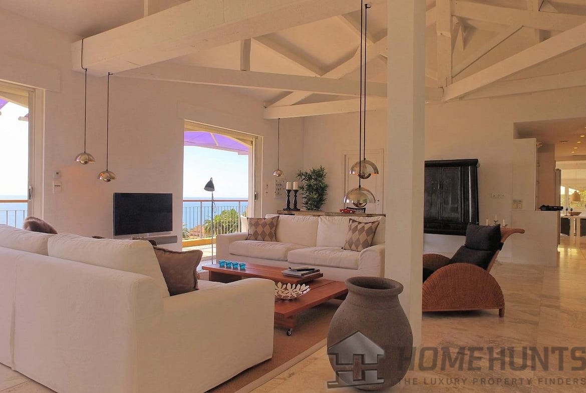 The outdoor area is designed for relaxed Riviera living, offering a covered poolside lounge, a summer kitchen, and direct access to the infinity pool overlooking the sea.